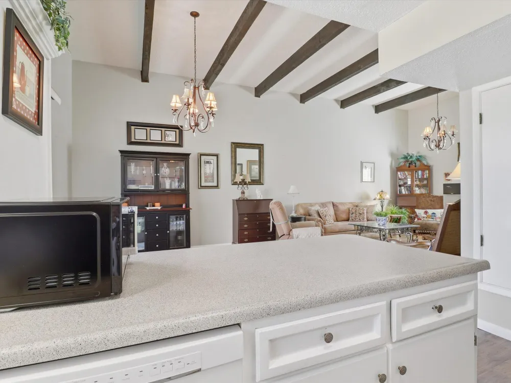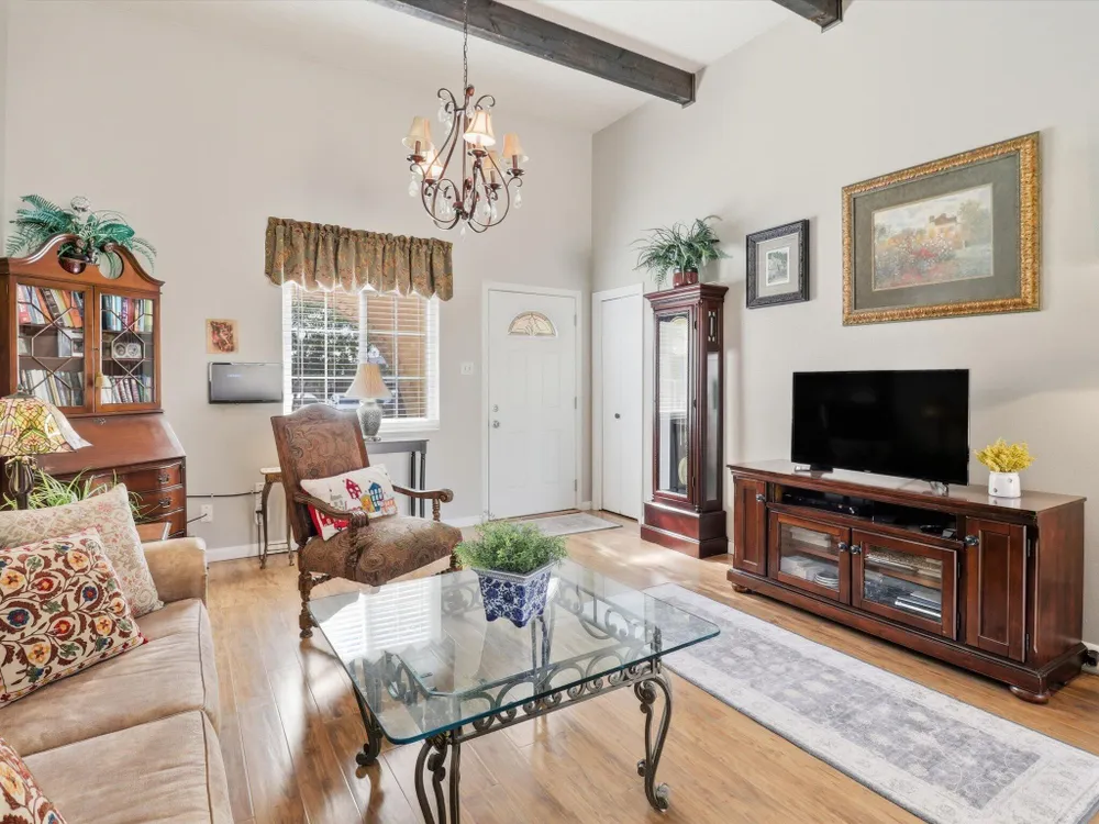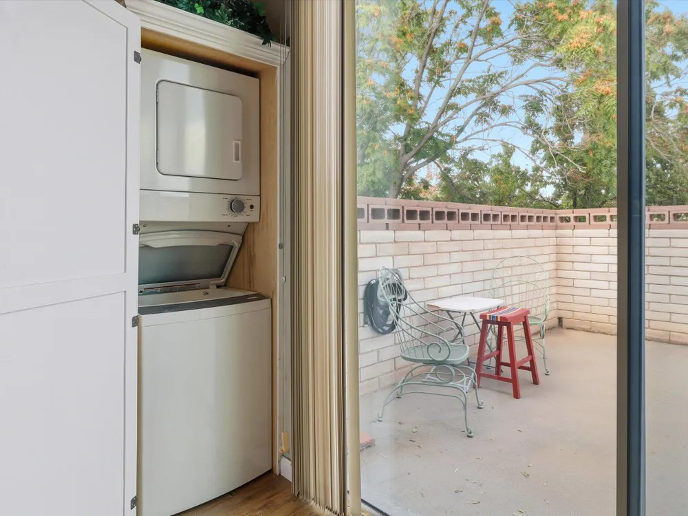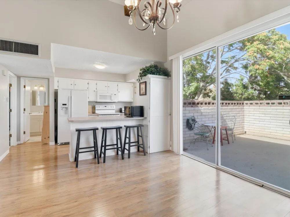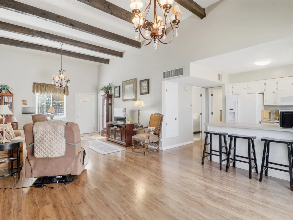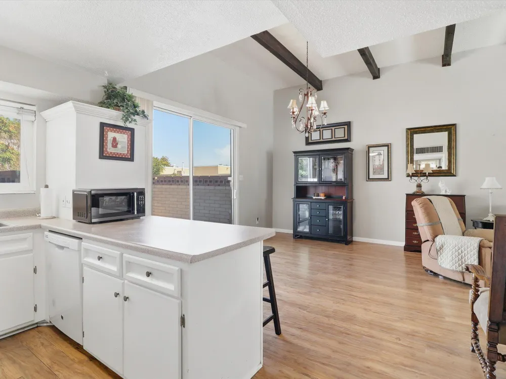 Welcome to this charming 1 bed, 1 bath condo in the desirable 55+ Golden West community! This inviting home features vaulted ceilings with exposed beams that add character and spaciousness to the open floorplan. The living and dining areas flow seamlessly, perfect for relaxing or entertaining. Enjoy private front and back patios and your own in unit washer/dryer. Community features include indoor heated pool, exercise equipment, sauna, party facility with kitchen, laundry room, and assigned parking. Beautifully landscaped and well-maintained, the community offers a friendly, low-maintenance lifestyle close to shopping, dining, and more. Don't miss this opportunity!