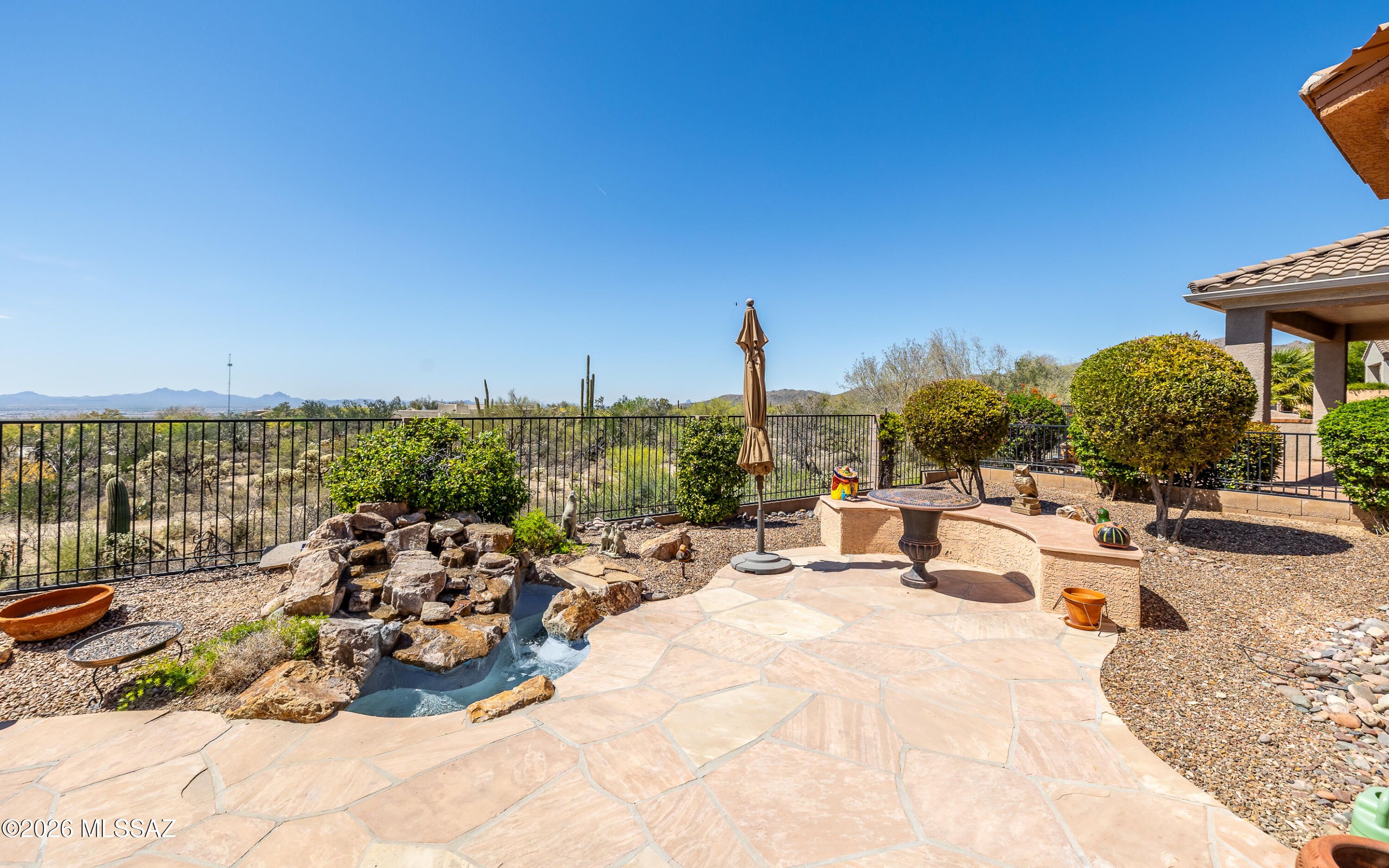 Ideal location - this lovely Hillsboro with 3 bay windows has one of the best Marana city light viewing backyard. Backs to nature - city lights to the south - mountains to the NW - just an overall tranquil and peaceful location. Brand new installed quartz kitchen countertops and backsplash- fresh, clean and bright. Master bathroom nicely updated with stylish shower. Two lovely water features - on located in the spacious gated front courtyard and the other against the rear view fencing of the backyard. Both water features just services and are sparkling clean. Lovely mountain views from gated front courtyard - even better city lights, mountain, sunset and nature views from the extended backyard. Come view this most popular Hillsboro model w/all three bay windows. And NO carpet!