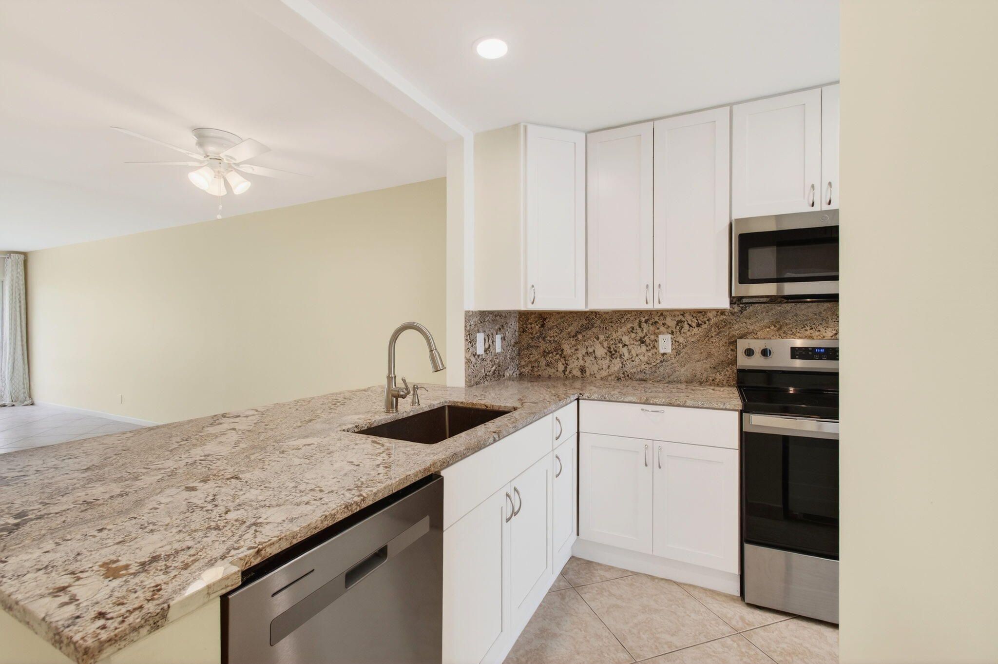 Welcome to your dream Villa in the highly desirable Palm Greens community, a vibrant 55+ active adult haven in beautiful Delray Beach, Florida! This stunning 2-bedroom, 2-bathroom corner unit Villa has wonderful natural light and features a desirable split-bedroom with an open floor plan that creates an airy layout perfect for relaxed Florida living and entertaining. The gourmet kitchen has been beautifully upgraded with spacious granite countertops, a full backsplash, a large eat-in island, and sleek new stainless steel appliances. Custom large cabinets with soft-close doors provide ample storage and a touch of elegance. Smooth ceilings throughout this Villa and gorgeous diagonal tile flooring seamlessly from room to room. Lighted ceiling fans in every room keep things