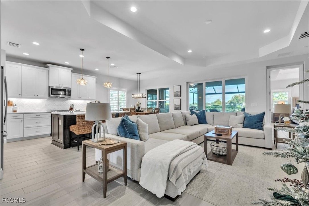 Welcome to this stunning 3-year-old home located in the Verandah gated community, being offered at an incredible price and move-in ready. This home embodies the perfect combination of luxury, comfort, and convenience, designed to enhance the ultimate SWFL lifestyle. With 2064 sq. ft. of living space, this home features 3 bedrooms, a spacious den, 2.5 bathrooms, and an open layout with modern décor. The kitchen is a focal point of the home, boasting modern quartz countertops, stainless steel appliances, ample cabinet space, elegant light fixtures, and accents, breakfast bar area, and an adjacent generous eat-in area with picturesque views of the Lanai overlooking a large lake and partial Golf Course view. Additionally, there is a butler pantry next to the kitchen with wine racks and additional storage for food prepping or staging. The upgraded tile flooring is featured throughout the home and master bedroom with upgraded carpet in the remaining 2 bedrooms. All bathrooms have a contemporary look with upgraded countertops, plenty of light with elegant fixtures, and luxurious tile. The primary Bathroom has a large walk-in shower, dual sinks with custom mirrors, and a separate commode. Adjacent to the kitchen is a generous eat-in area with picturesque views of the Lanai and partial Golf Course. It serves as the central point in the home to relax and entertain. All bedrooms in this contemporary home are generously sized and tastefully decorated with plenty of closet space. A large Den with French doors complete the internal features of the home. The outdoor Lanai area is full of upgrades and features including an extended under-roof area, outdoor kitchen with a natural gas grill and small refrigerator, larger size pavers, panoramic picture screen, custom heated pool with a water feature, heated spa, multiple areas for sunbathing and relaxing, and a spectacular view of the Lake and Golf course in the background. This is all set in a very quiet and private setting. Additional features of the home include IMPACT windows and doors, an epoxy garage floor with ample storage shelves, and a separate laundry room with a tub and cabinets. Situated in the Verandah community, residents have access to a plethora of amenities including 2 Championship Golf courses designed by Jack Nicklaus and Bob Cupp, a state-of-the-art fitness center, tennis and pickleball courts, bocce, playground, dog park, kayaks, 9 miles of walking and jogging paths, multiple restaurants, and a vibrant social calendar catering to everyone's needs. Don't miss the opportunity to schedule a viewing today and make this luxurious property your own piece of paradise.