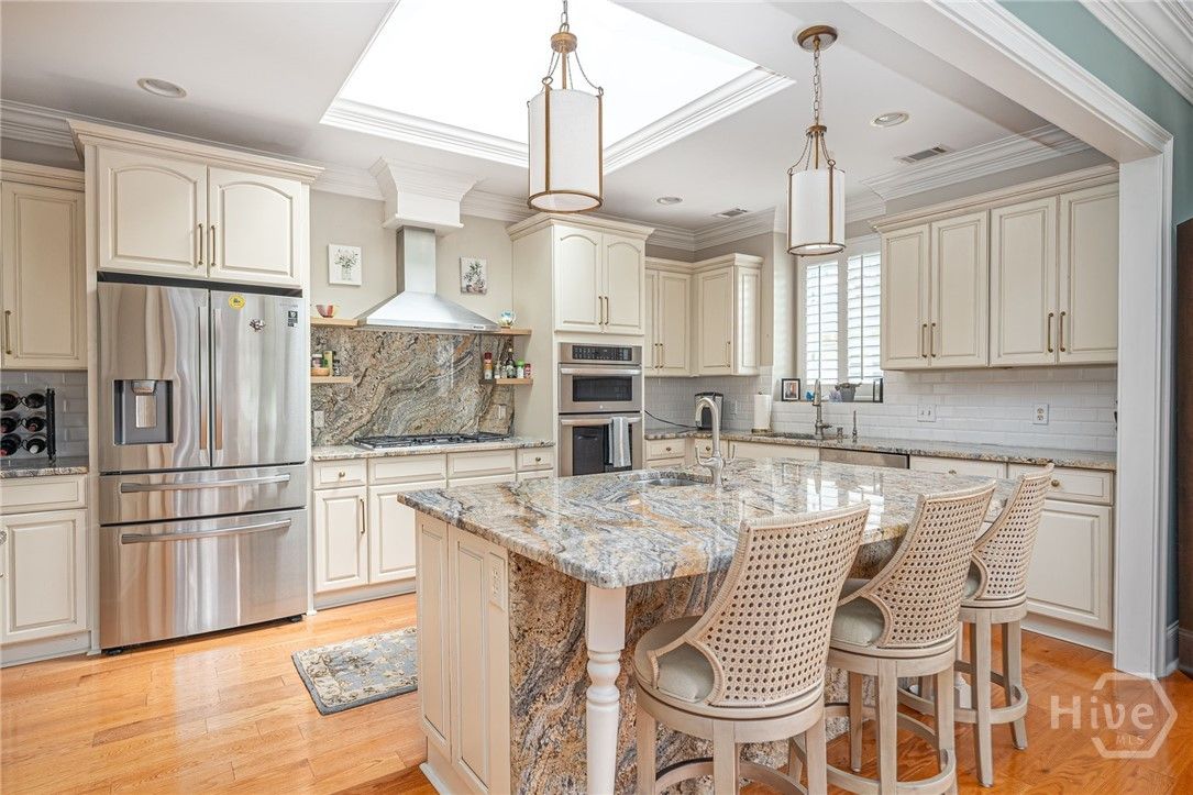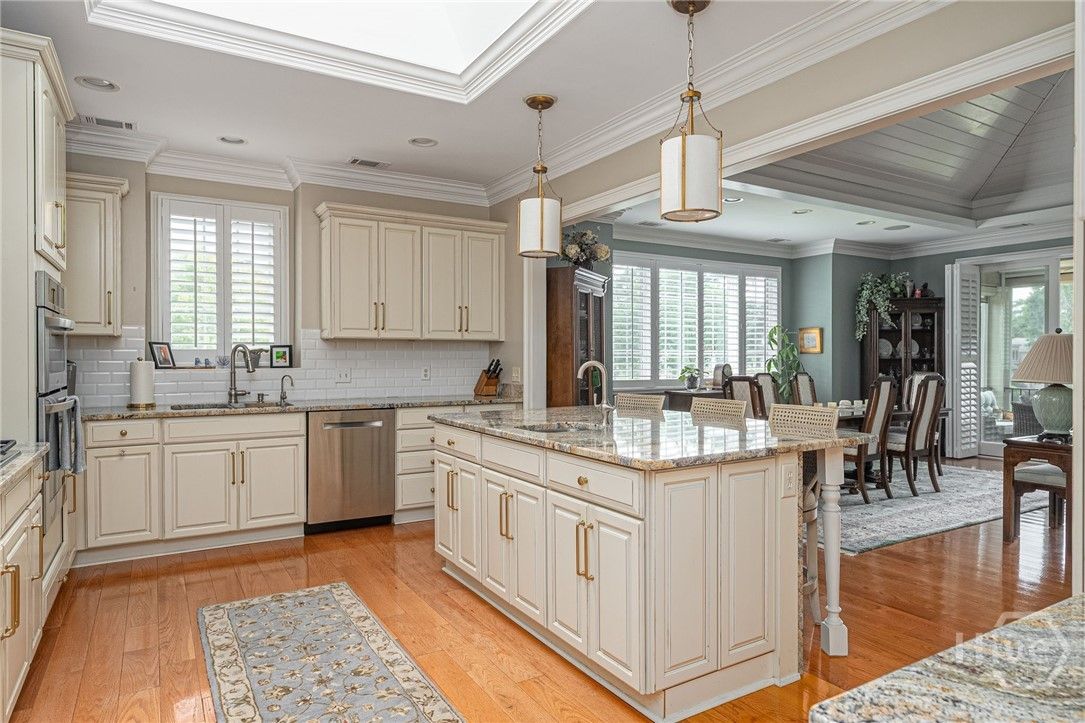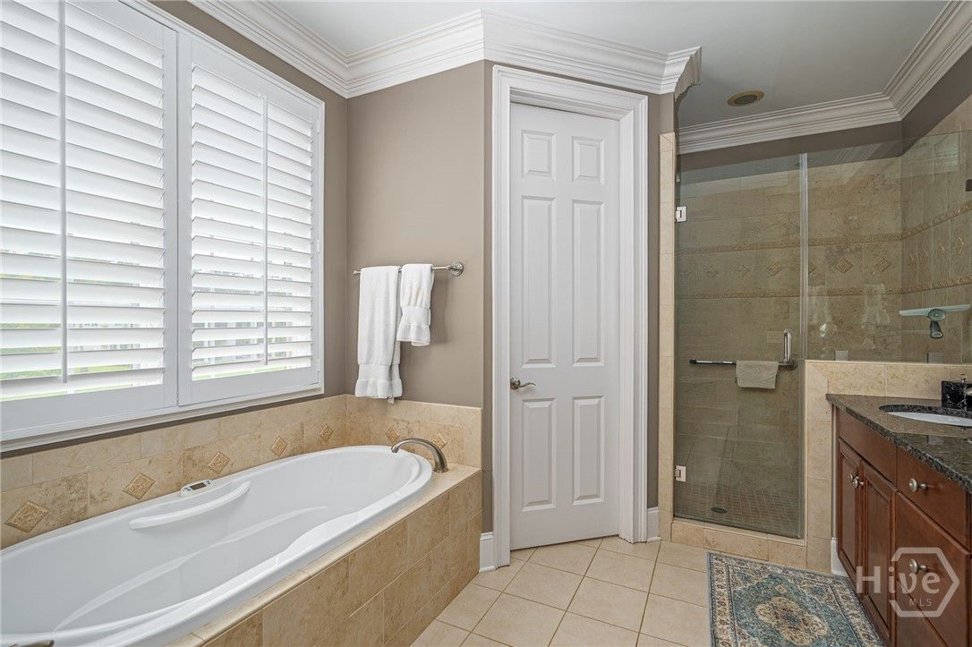 - Breakfast Bar, Built-in Features, Ceiling Fan(s), Double Vanity, Entrance Foyer, Fireplace, High Ceilings, Jetted Tub, Kitchen Island, Pantry, Pull Down Attic Stairs, Recessed Lighting, Skylights, Separate Shower, Upper Level Primary, Programmable Thermostat