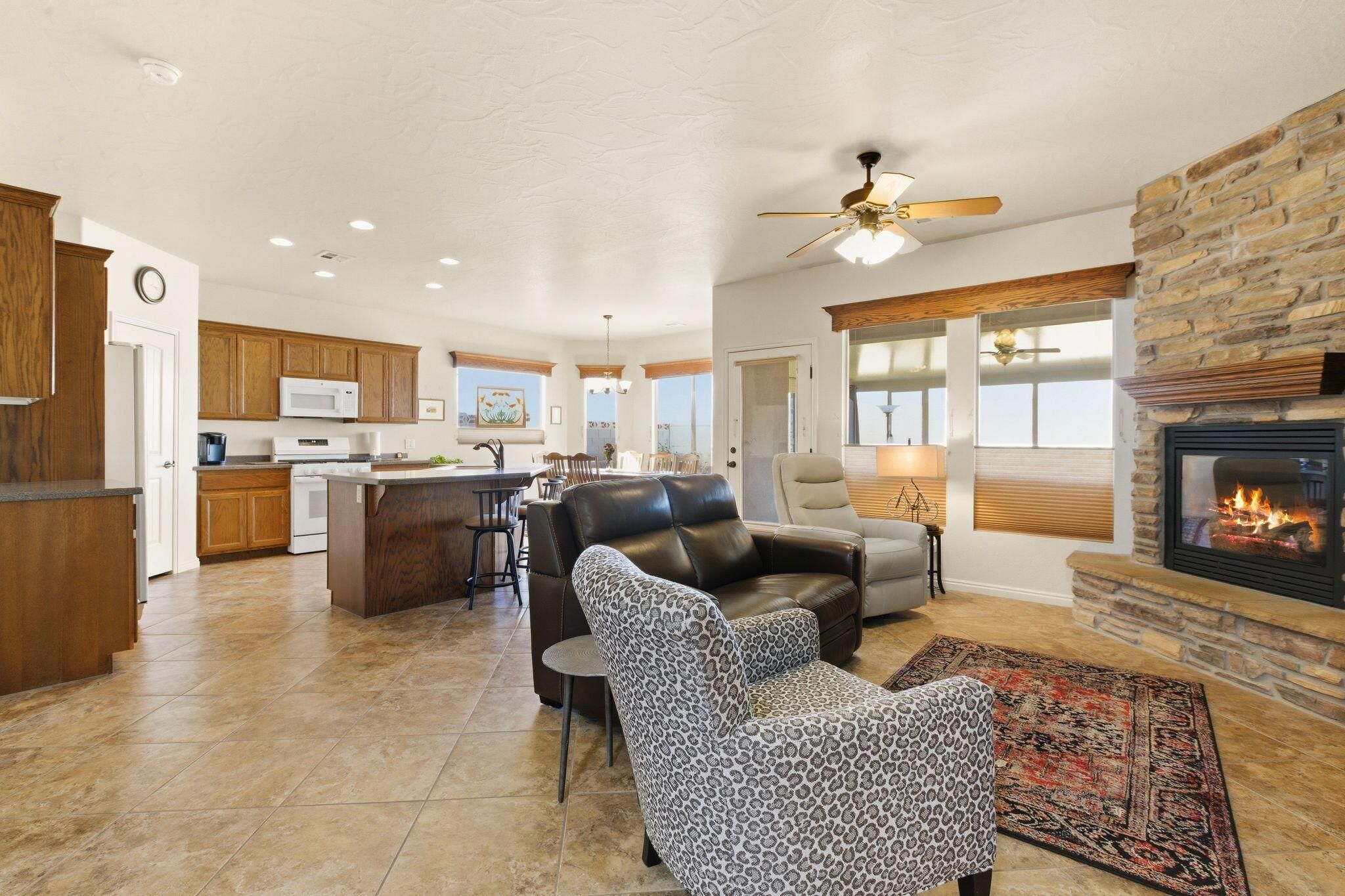 Unobstructed views in the SunRiver 55+ community capture sweeping vistas of the Virgin River, Pine Valley Mountain, and surrounding bluffs, mesas & plateaus. This well-cared-for home features desirable upgrades, including a stone surround gas fireplace with hearth and mantel, built-ins, tile flooring, ceiling fans, and window coverings. Enjoy year-round indoor-outdoor living with a front patio, two rear patios (one covered, one uncovered), a sunroom just off the living and dining areas, and a hot tub perfectly positioned to take in the views. Furnishings are negotiable. Home has reverse osmosis, solar tube, new HVAC & outdoor hot tub (installed in 2025), water heater & stove (replaced in 2024). Convenient access to biking, walking, and hiking trails enhances the outdoor lifestyle. In addition to this private retreat, residents enjoy access to a 35,000 sq ft community center, activities, pools, a golf course, and an on-site restaurant. Welcome home!