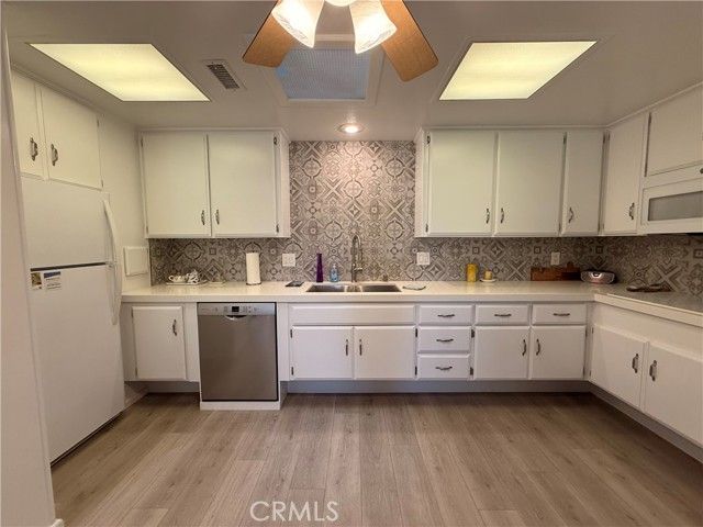 Set on a wide greenbelt framed by mature trees, this beautifully upgraded one-bedroom home blends modern comfort with Leisure World charm. The home features dual-pane windows, central heat and air conditioning, and wide-plank vinyl flooring throughout. The bright, spacious kitchen is highlighted by crisp white cabinetry, patterned tile backsplash, and solid-surface counters. A Bosch stainless-steel dishwasher, built-in oven and microwave, large sink, ceiling fan, and skylight make this a kitchen that’s both stylish and functional. The bathroom features a walk-in cut-down shower, a skylight, and an updated vanity with ample counter space and storage. Relax on the tiled front patio, complete with a ceiling fan—perfect for enjoying the ocean breeze and peaceful greenbelt views. A convenient Rubbermaid storage unit is also included. Move-in ready and ideally located, this home delivers comfort, light, and low-maintenance living in the heart of Leisure World Seal Beach. Mutual 5 - 72E (Carport 68, Space 17) SENIOR COMMUNITY-OFFERS THE FOLLOWING AMENITIES: 9 Hole Golf Course, Swimming Pool, Jacuzzi, Gym, Table Tennis, Shuffle Board, Billiards, Pickle Ball, and Bocce Ball courts. Amphitheater, 6 Clubhouses featuring: Art Room, Sewing, Crafts, Wood Shops, Lapidary, Pool Tables, Over 200 Clubs, LWSB is a Security-Guard-Gated Community. Also Library, Friends of Library Bookstore, Credit Union, Health Care Center, Pharmacy and Post Office.