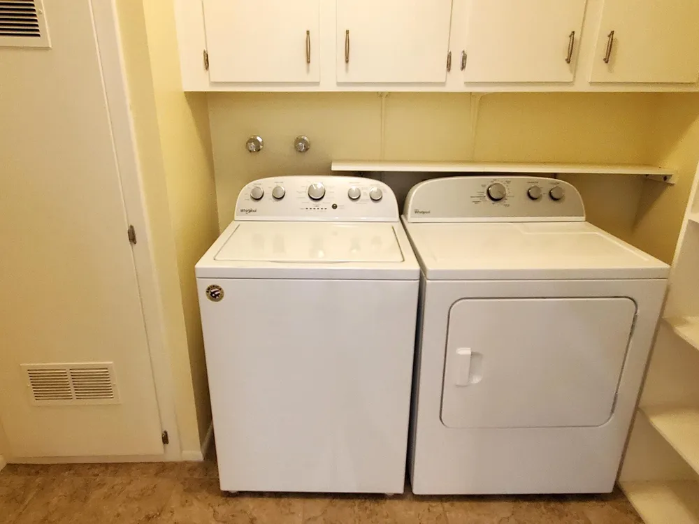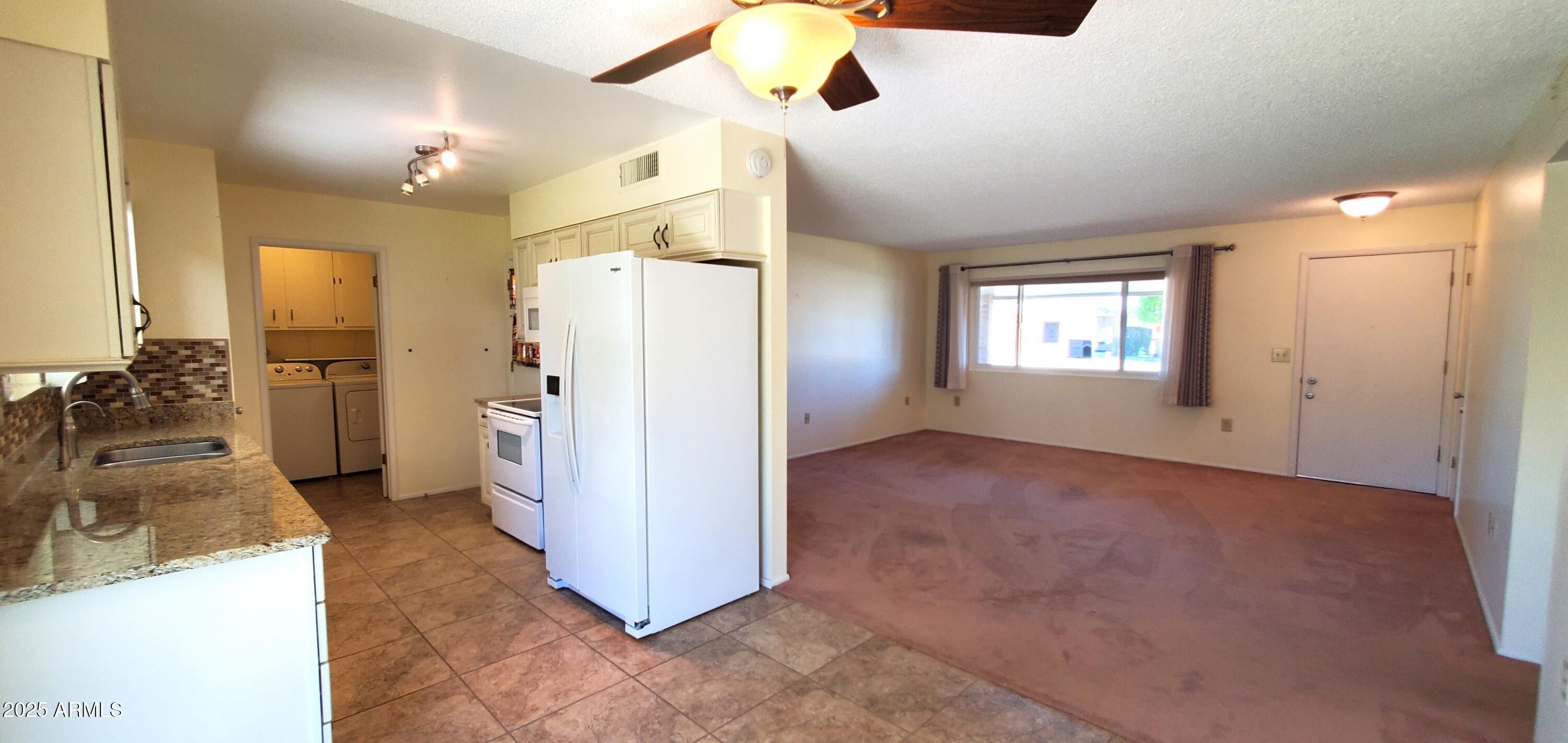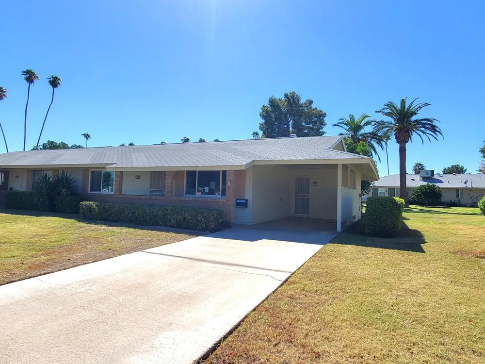 Discover the allure of this expansive 2-bedroom 1 bathroom charming Townhouse in an active senior living community. Of Thornwood. It welcomes you with a calming color scheme and features both carpet and tile flooring strategically placed for maximum comfort and style. Spacious living room invites relaxation, while the eat-in kitchen is equipped with abundant cabinetry, a mosaic tile backsplash, built-in appliances, granite counters, and a convenient pantry. Each bedroom ensures restful slumber with bi-fold closets for optimal organization. A handy laundry room boasts built-in cabinets for additional storage. Enjoy access to Sun City's 55+ amenities including pools, spas, pickle ball, tennis, fitness centers, arts & crafts studios