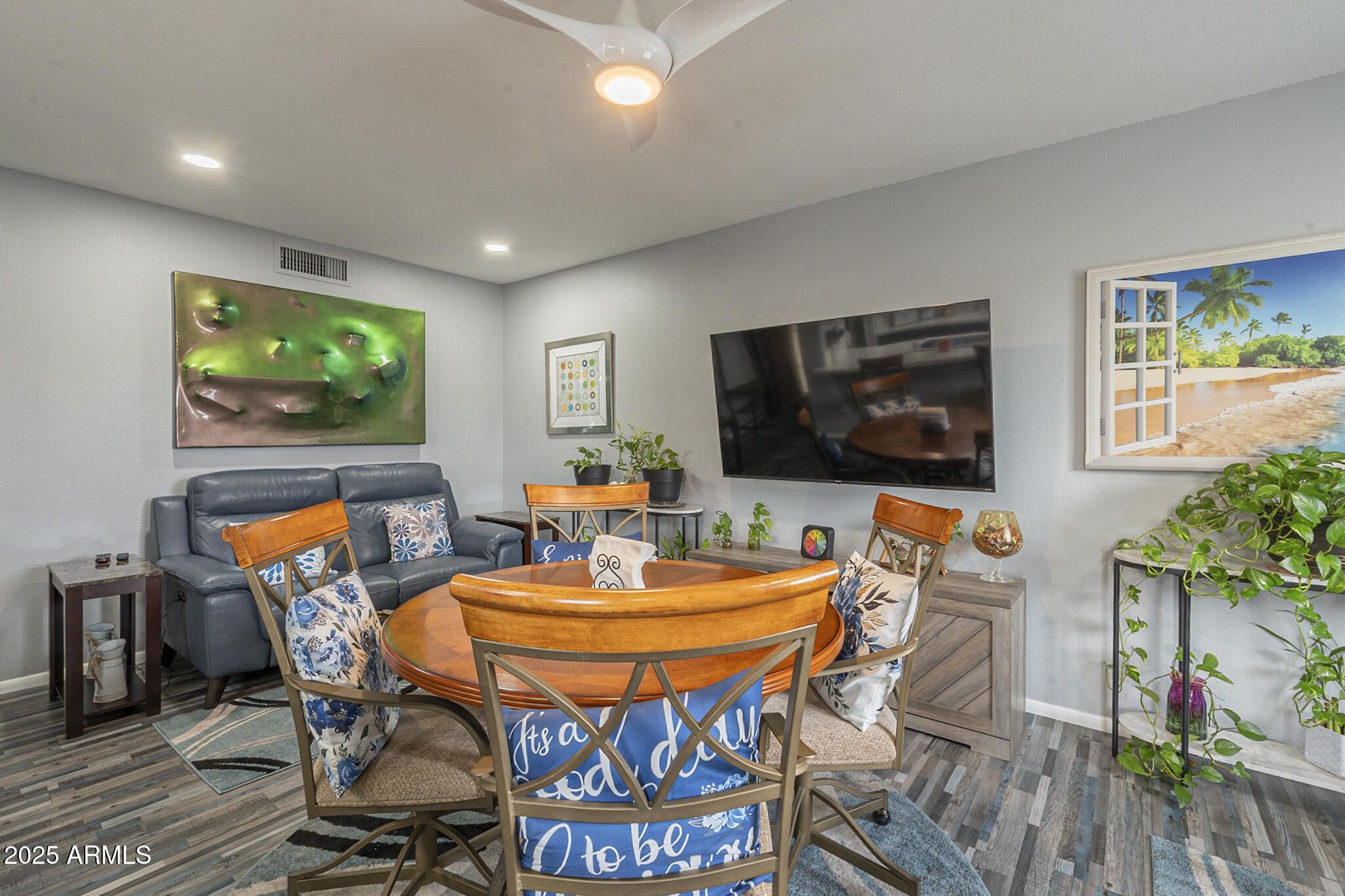 This Wonderfully Remodeled Home includes more!! Kitchen renovated with an Open Floor Plan (2022). Quarts Counters, Soft Close Cabinets, Modern Fans with Multicolor Lights. Vinyl Flooring (2022), Dual Pane Windows (2020), Newer Roof (2024), HVAC (2018). Split Spacious Bedrooms w/Walk-In Closets. Plumbing and Layout Updated to include Interior Laundry, which almost no other unit has! (2022) NO Popcorn Ceilings, light and bright Skylights and Recessed Lighting. Prime Location next to Golf, Rec Centers, Shopping/Dining. Includes large storage unit and golf cart parking. Ready for Move In... You're all that's missing.