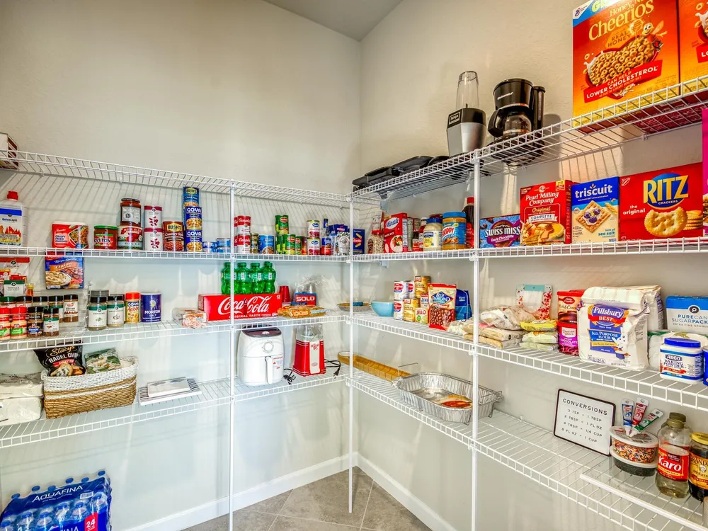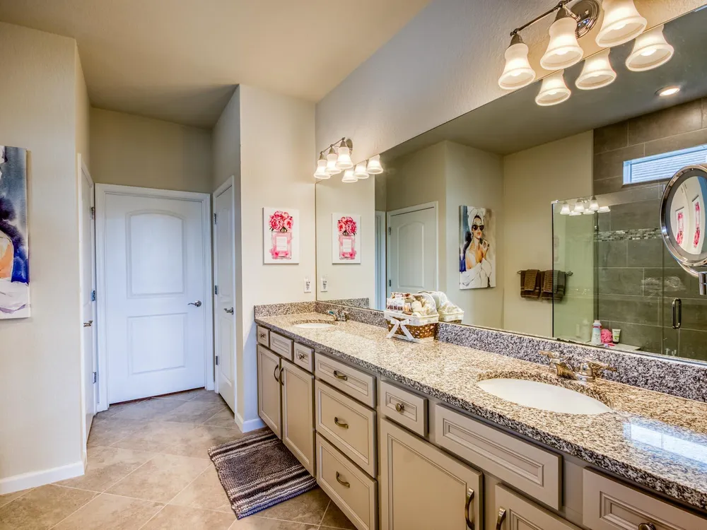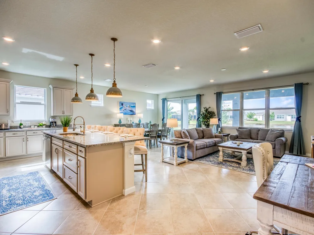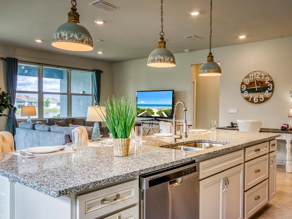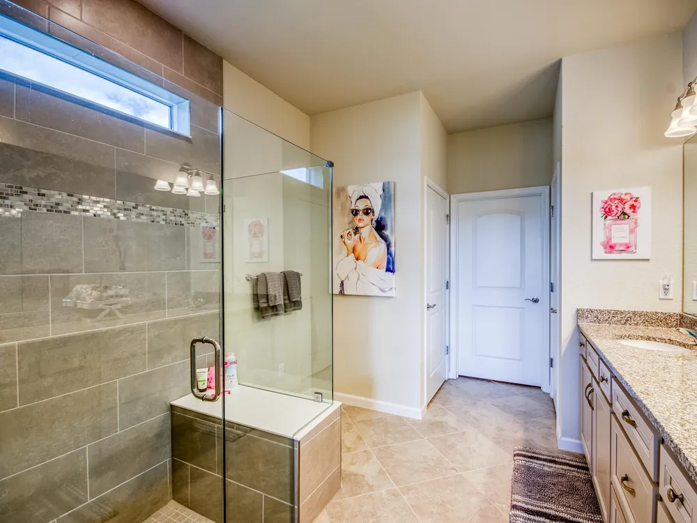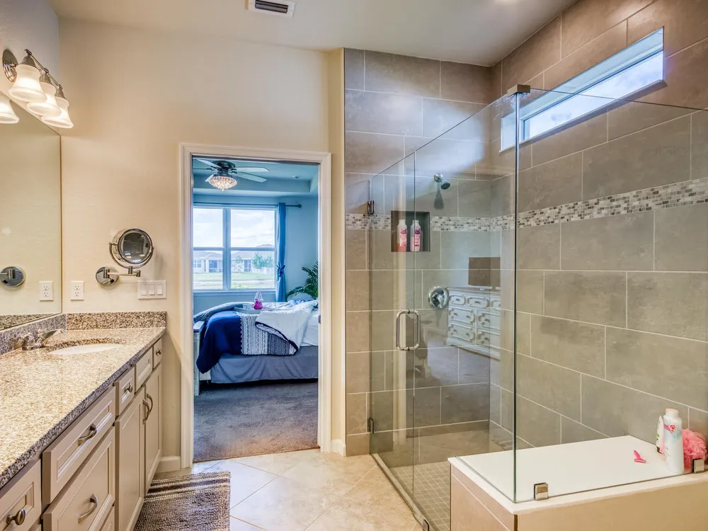 - Entrance Foyer, Kitchen Island, Pantry, Split Bedrooms, Walk-In Closet(s), Great Room, Living/Dining Room, Impact Glass, Dual Sinks, Primary Downstairs, Separate Shower