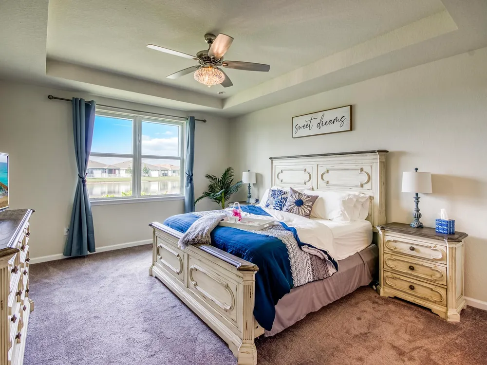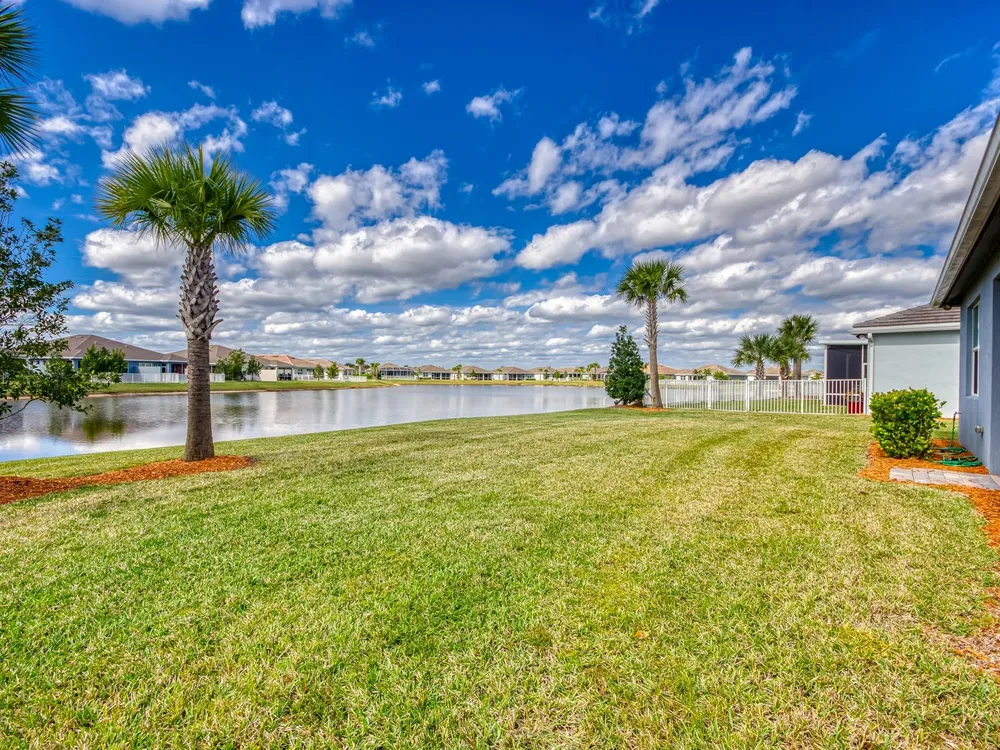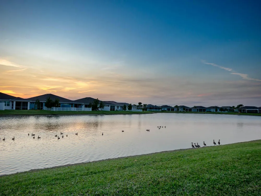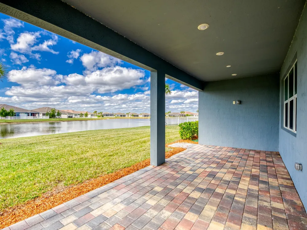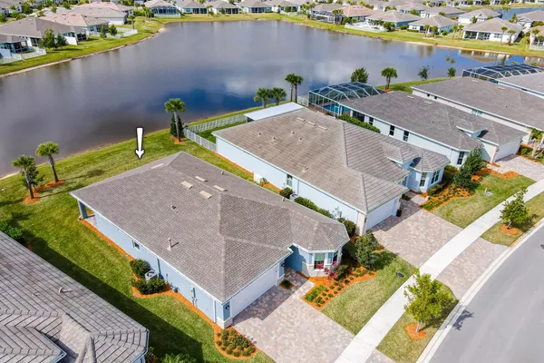Step into this almost new meticulously maintained lakefront home in the highly sought after 55+ community of Del Webb. Prepare to be wowed once you walk in and see the gorgeous lake views from your back patio. Sip your favorite beverage as you take in the spectacular sunsets overlooking the lake. This home features CBS Construction with hurricane impact windows and doors for total peace of mind. Some of the many other features include: Light gray wood cabinets with soft close drawers, stainless appliances, granite counters, and a large farm sink in the kitchen island. The bathrooms features gray cabinets, dual sinks, granite counters, tiled shower w/ frameless shower door. Accent stone added for that elegant look. One of the Best priced waterfront homes in the community.
