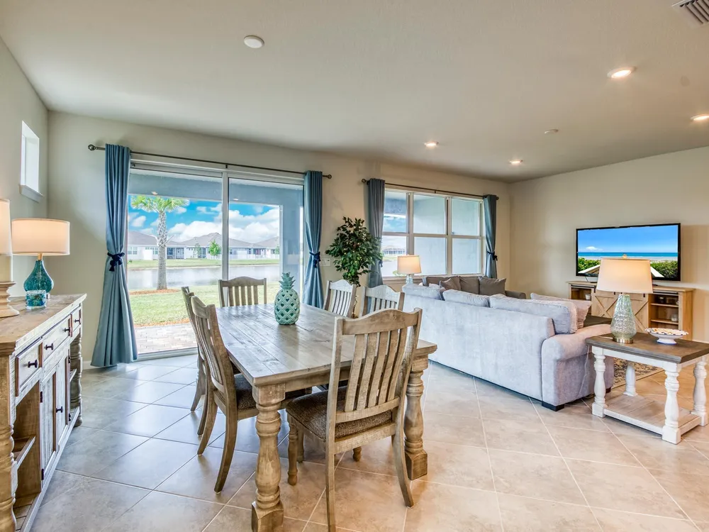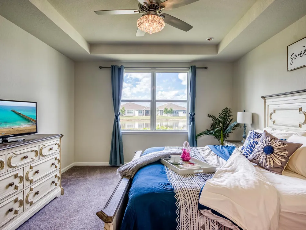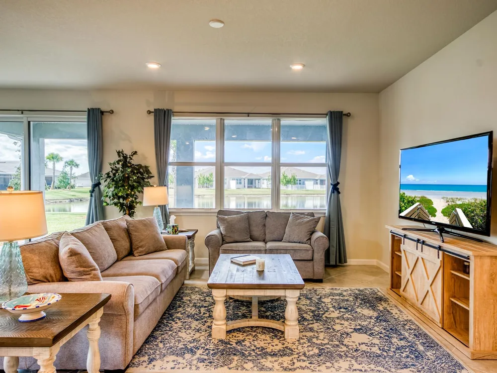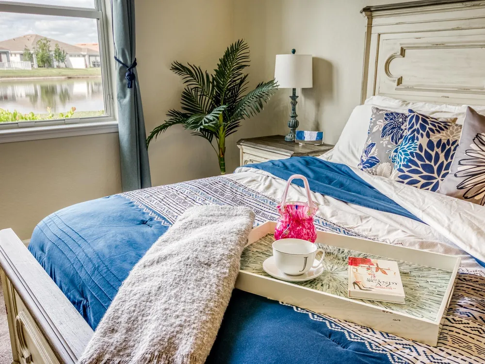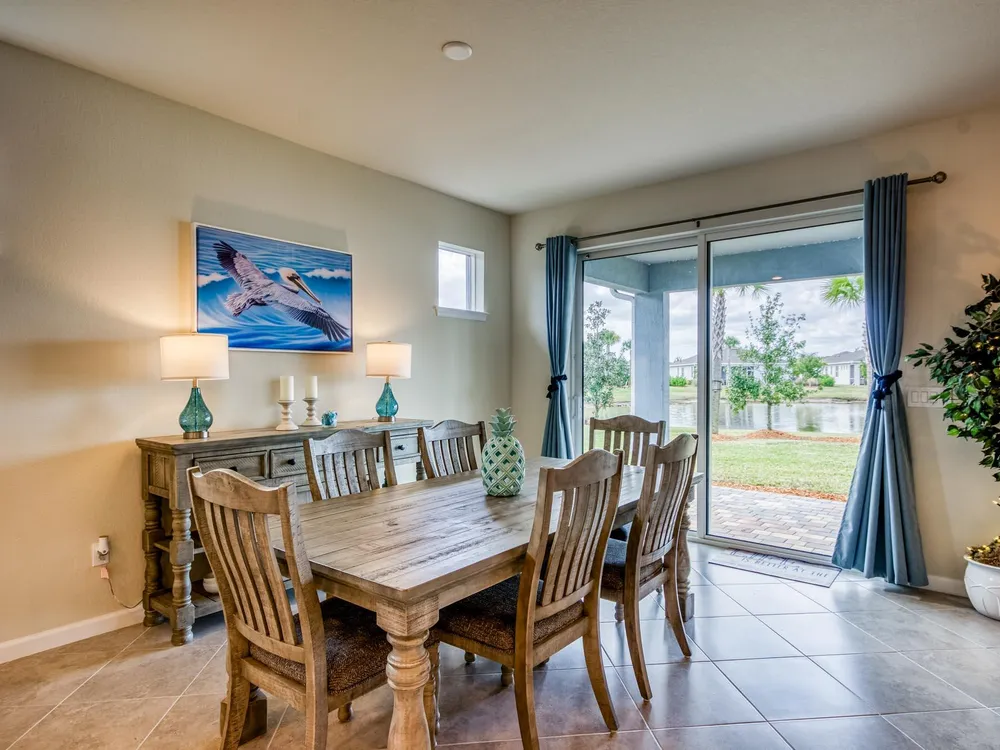 Step into this almost new meticulously maintained lakefront home in the highly sought after 55+ community of Del Webb. Prepare to be wowed once you walk in and see the gorgeous lake views from your back patio. Sip your favorite beverage as you take in the spectacular sunsets overlooking the lake. This home features CBS Construction with hurricane impact windows and doors for total peace of mind. Some of the many other features include: Light gray wood cabinets with soft close drawers, stainless appliances, granite counters, and a large farm sink in the kitchen island. The bathrooms features gray cabinets, dual sinks, granite counters, tiled shower w/ frameless shower door. Accent stone added for that elegant look. One of the Best priced waterfront homes in the community.