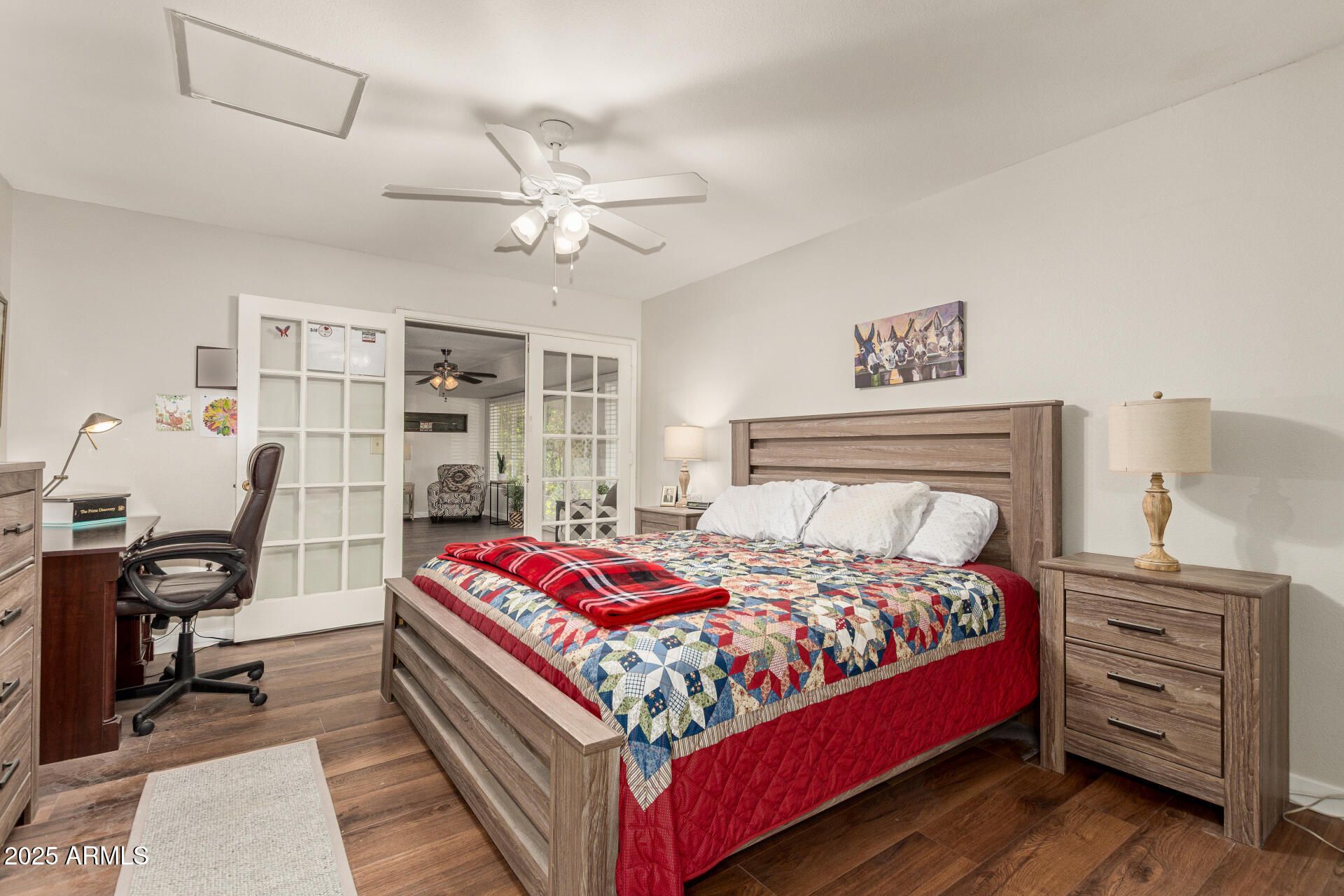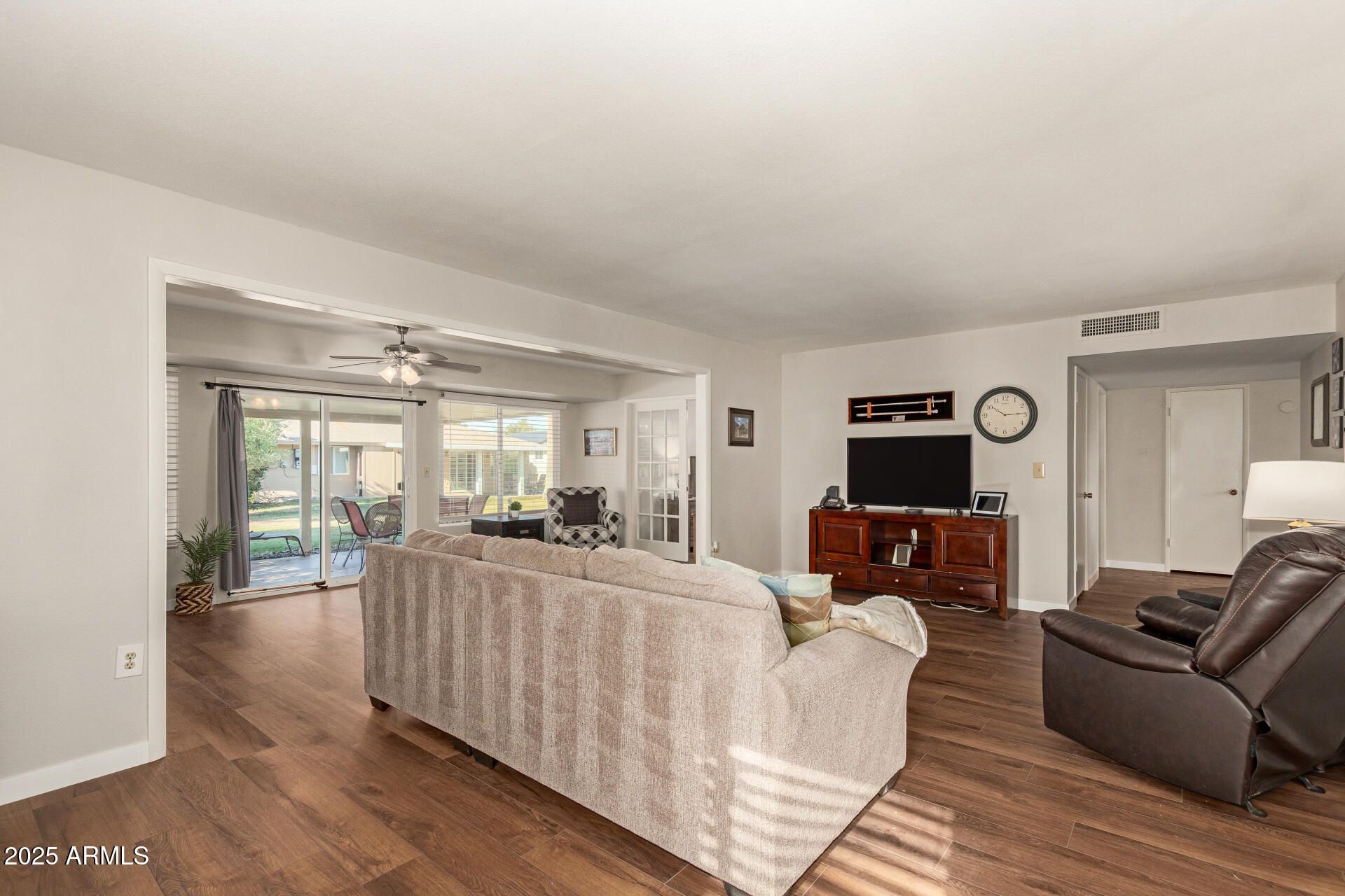 Beautifully updated 2 bed/2 bath FURNISHED twin home. Lush green grass and a private fenced courtyard. Kitchen has been completely updated with ample storage, breakfast bar, Quartz countertops, and a bright eat-in area overlooking the courtyard. New tile in the kitchen and new neutral laminate flooring throughout the rest of the home with an extended great room with French doors to the primary suite featuring a walk-in shower and closet. The guest room offers built-ins, and the guest bath has a walk-in shower. New roof in December,+ solar for savings. Updated Vinyl windows, and slider door. Move in ready! Golf cart is available. Close to spring training, Cardinals stadium, Arrowhead Mall, shopping, and dining. Enjoy this active age-restricted community 7 rec centers and 8 golf courses