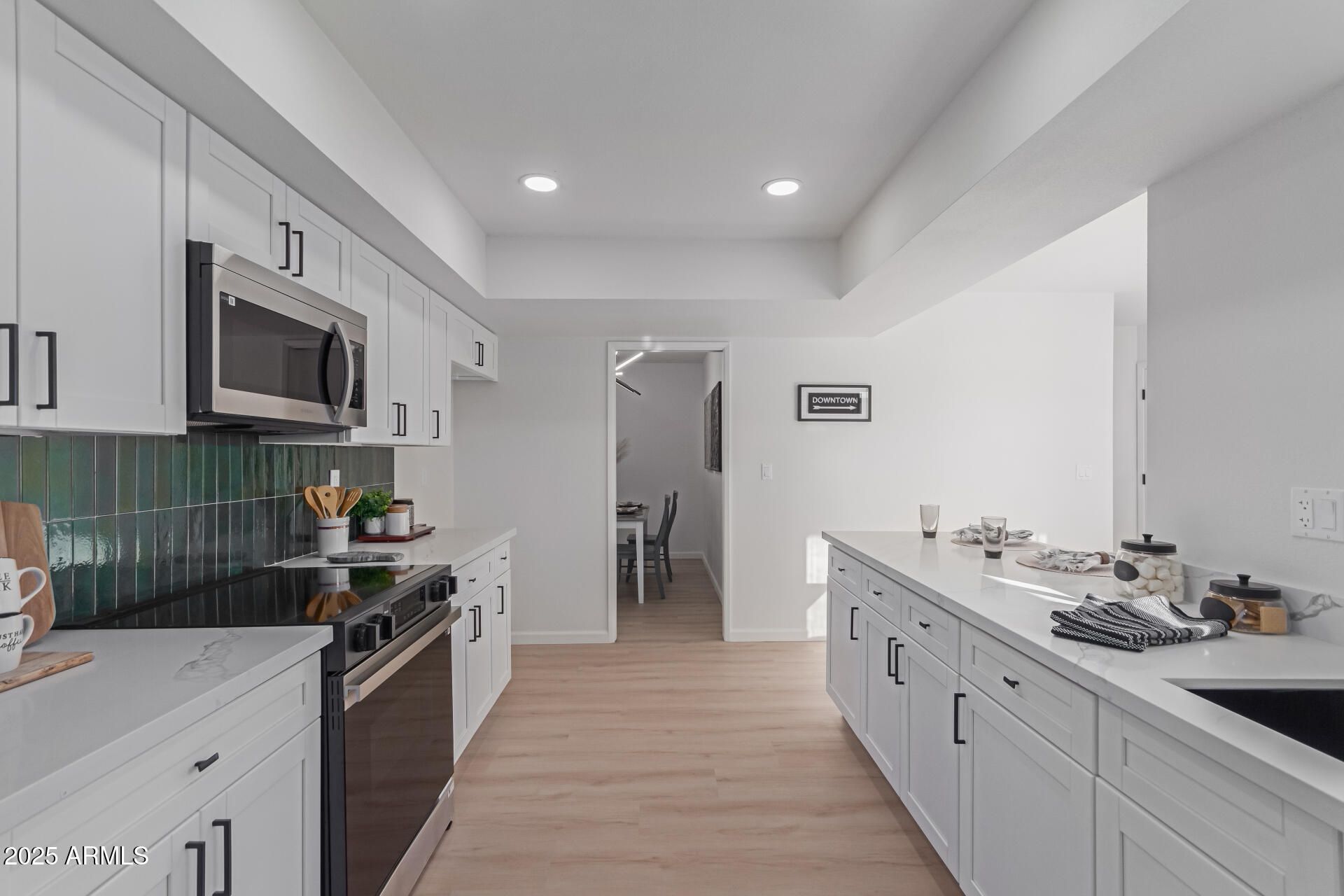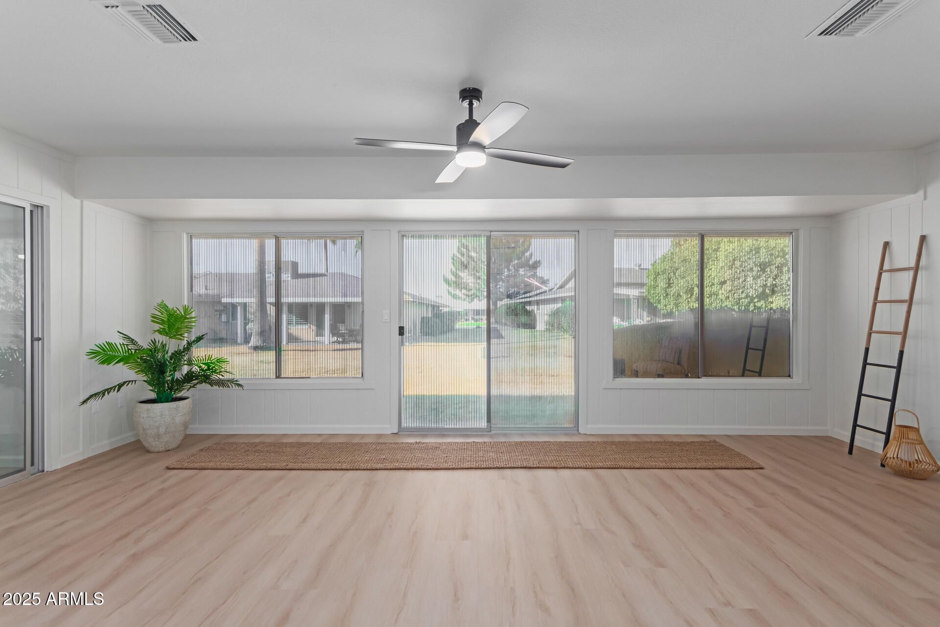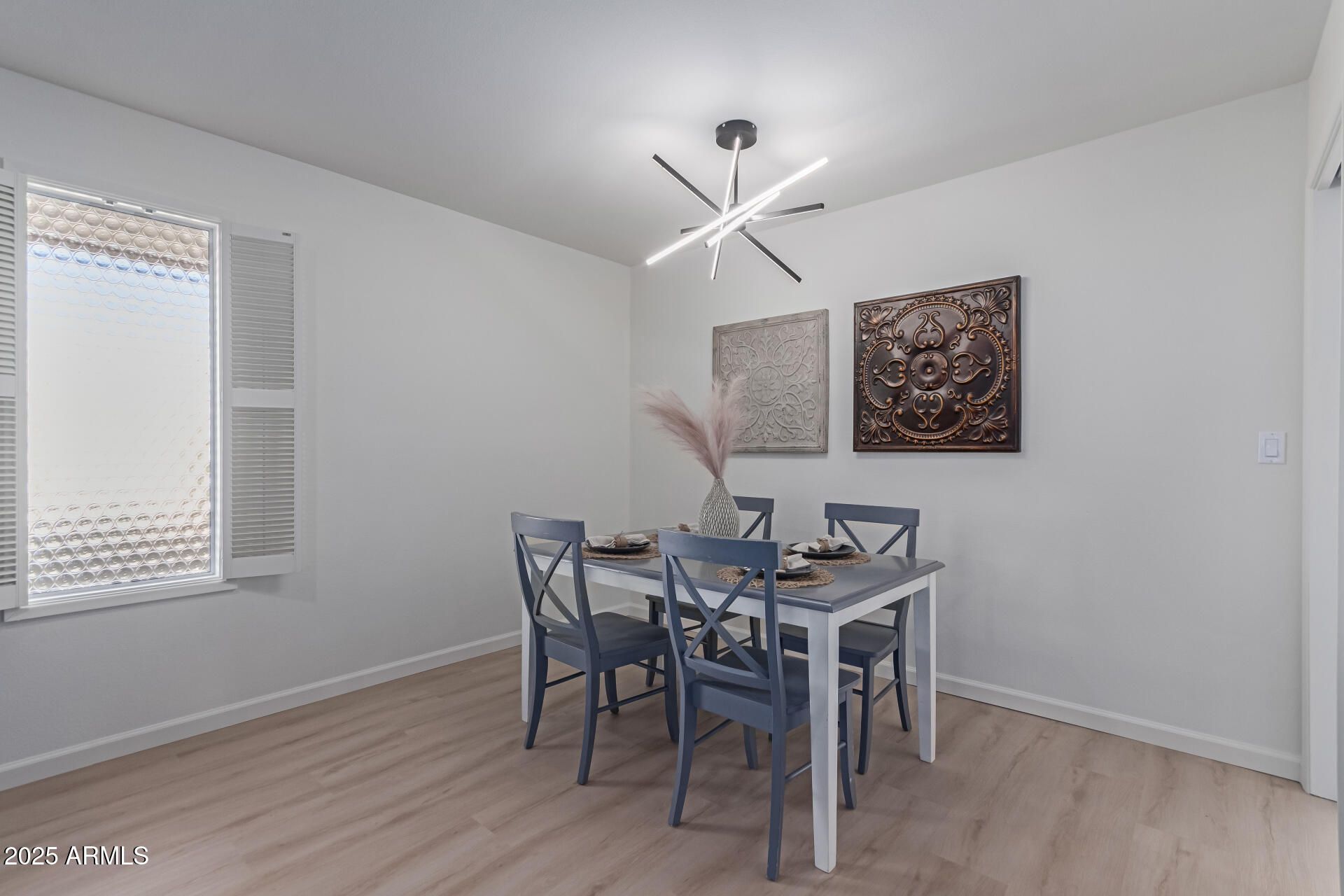 Beautifully upgraded Gemini home offering 2 bedrooms, 2 bathrooms, and 2 covered parking spaces. This charming single-level residence showcases a modern, open floor plan with fresh neutral paint, stylish wood-look flooring, and updated light fixtures throughout. The remodeled kitchen is a standout, featuring stainless steel appliances, quartz countertops, a tile backsplash, white shaker cabinets, and a cozy breakfast nook with patio access. The spacious primary suite includes direct access to the Arizona room, a walk-in closet, and a pristine en-suite bathroom. Additional highlights include a generous laundry room with built-in storage, a bright Arizona room perfect for relaxing or entertaining, and a low-maintenance backyard ideal for easy living. Move-in ready!