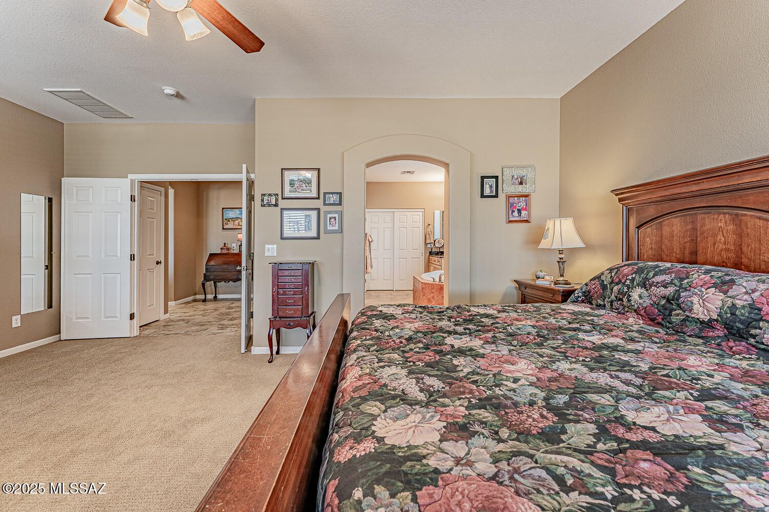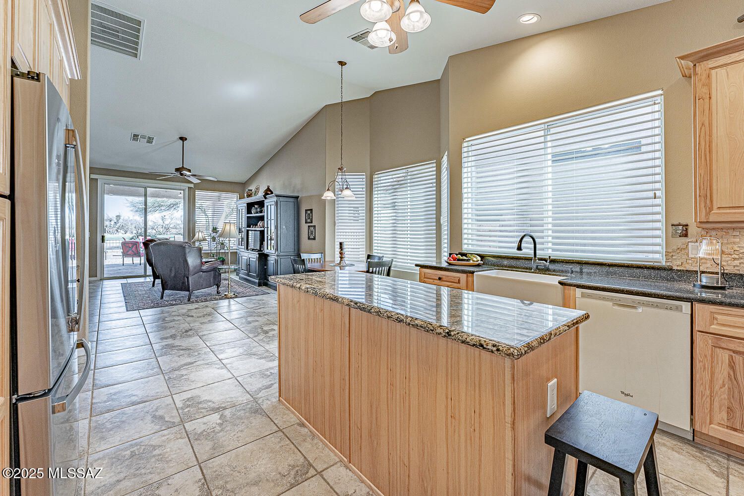 Welcome to your new home! Custom finishes throughout - a wall of windows in the back to enjoy the views and the golf course. The kitchen features raised panel cabinetry with under cabinet lighting and roll-out shelving, counter tops are engineered stone with tile backsplash/the center island has luxurious granite, smooth cooktop and new built in oven and microwave and new refrigerator - don't forget to see the oversized farmhouse sink. The owner's suite is entered in through double doors, has a sitting area and sliding glass door to the back patio. The bath has a soaking tub, step in shower with two shower heads and a walk in closet with built-ins. Hall bath counter tops are granite with a copper sink. Your visitors will enjoy the luxury of their own casita, complete with engineered stone