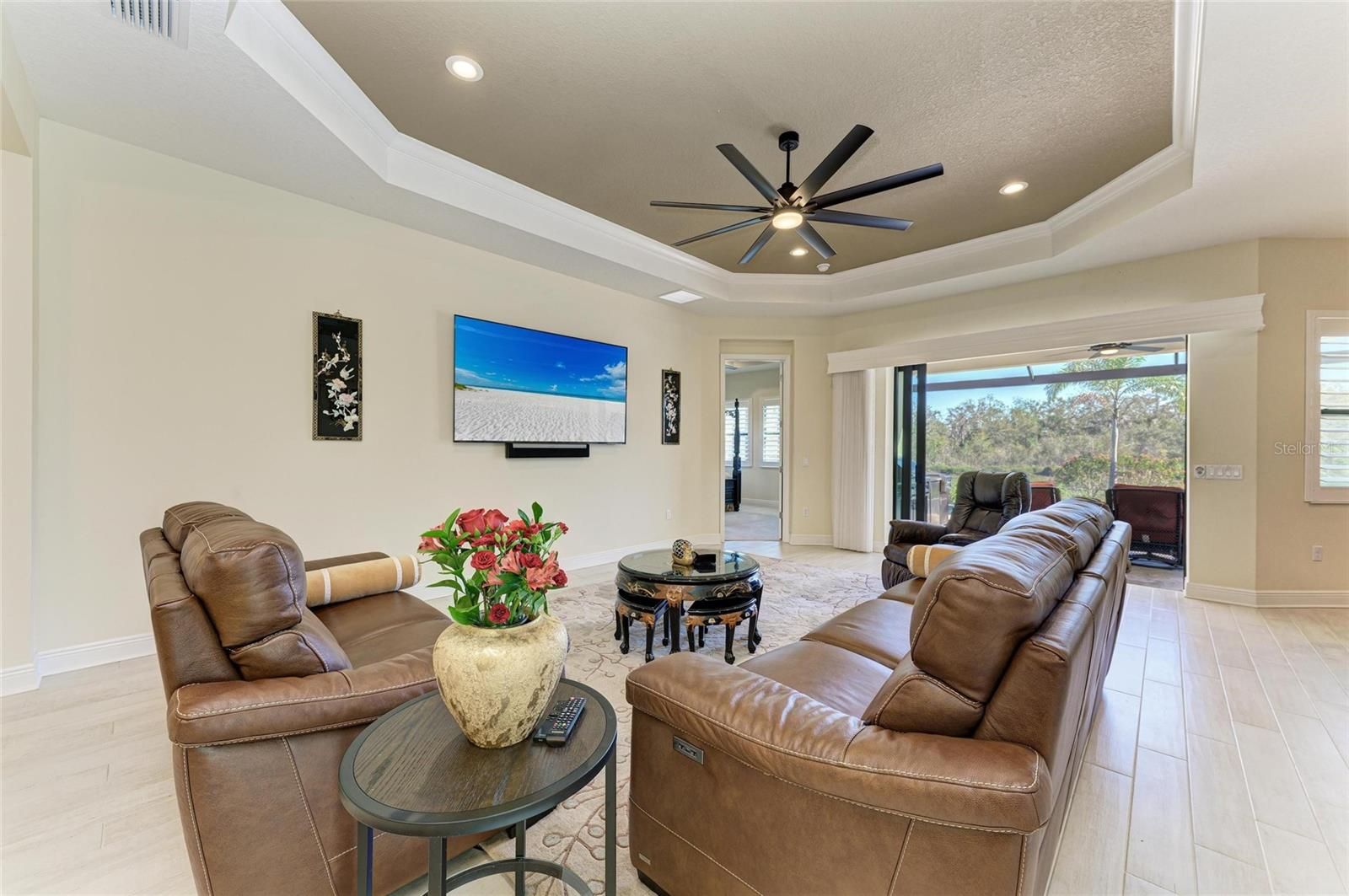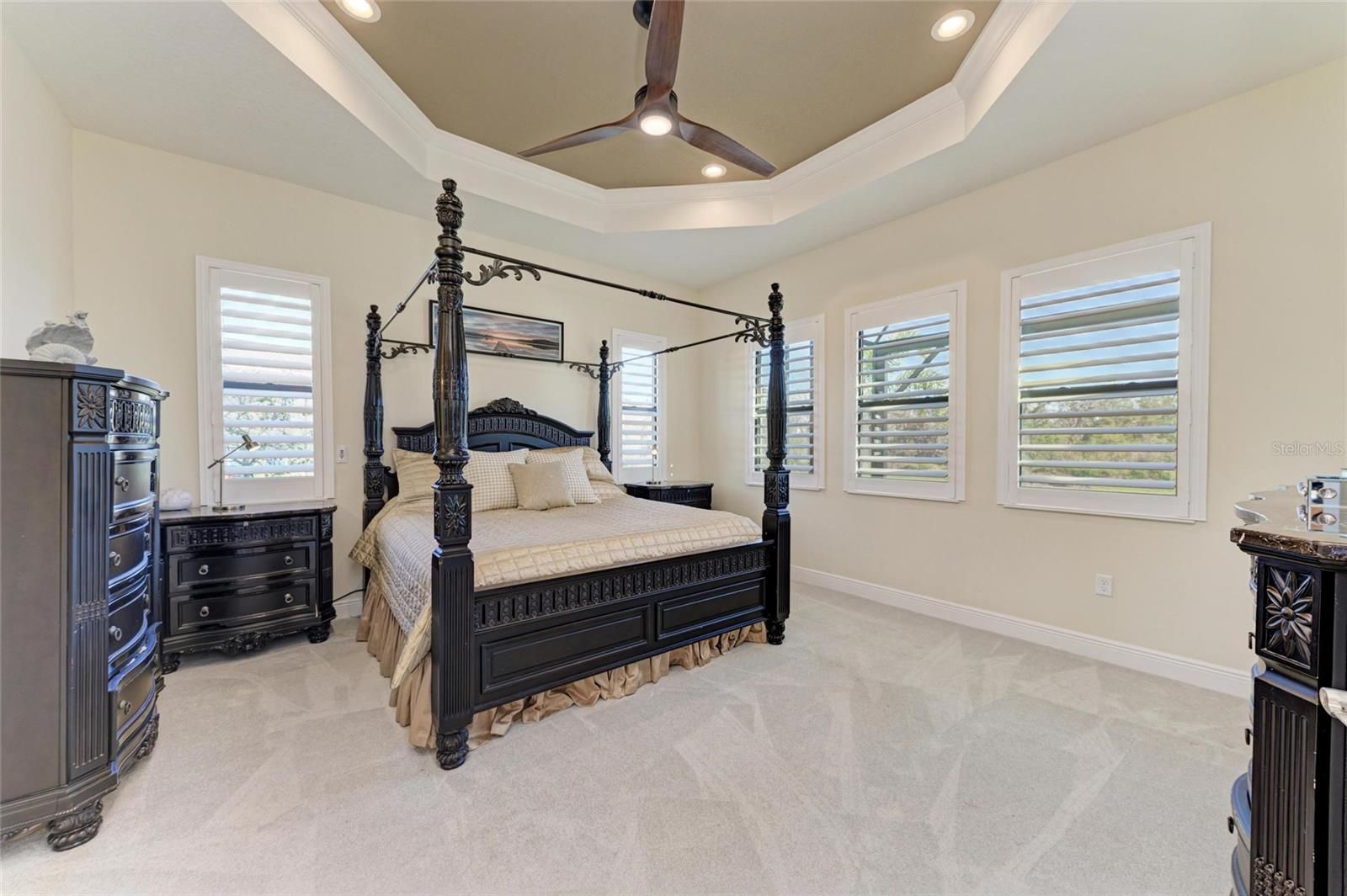 - Ceiling Fan(s), Central Vacuum, Crown Molding, Eat-in Kitchen, High Ceilings, Kitchen/Family Room Combo, Living/Dining Room, Open Floorplan, In-Wall Pest Control, Main Level Primary, Solid Surface Counters, Tray Ceiling(s), Walk-In Closet(s), Window Treatments
