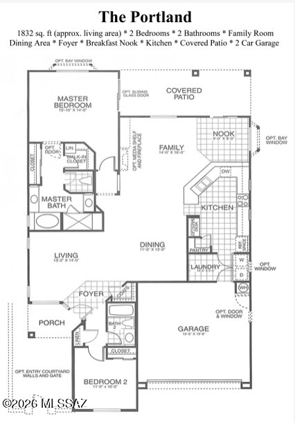 Extended Portland model with many upgrades- extended living/dining, extended garage & more. Beautifully landscaped, front courtyard, extended flagstone covered patio, raised sitting area & more on NE facing backyard with views of mountains & the 14th fairway! This beautifully updated home features 2 spacious bedrooms, remodeled primary bath, remodeled kitchen with eat in area and desk , large dining room, open den, and living room with a stone fireplace and built-in surround sound (equipment included).No carpet. Newer HVAC, water heater, and roof. Bay windows, garage with storage cabinets and water softener. Enjoy golf, pickleball, tennis, pool, hot tub, art and billiards room, restaurant and bar plus endless clubs and social activities. Many hiking and biking trails nearby.
