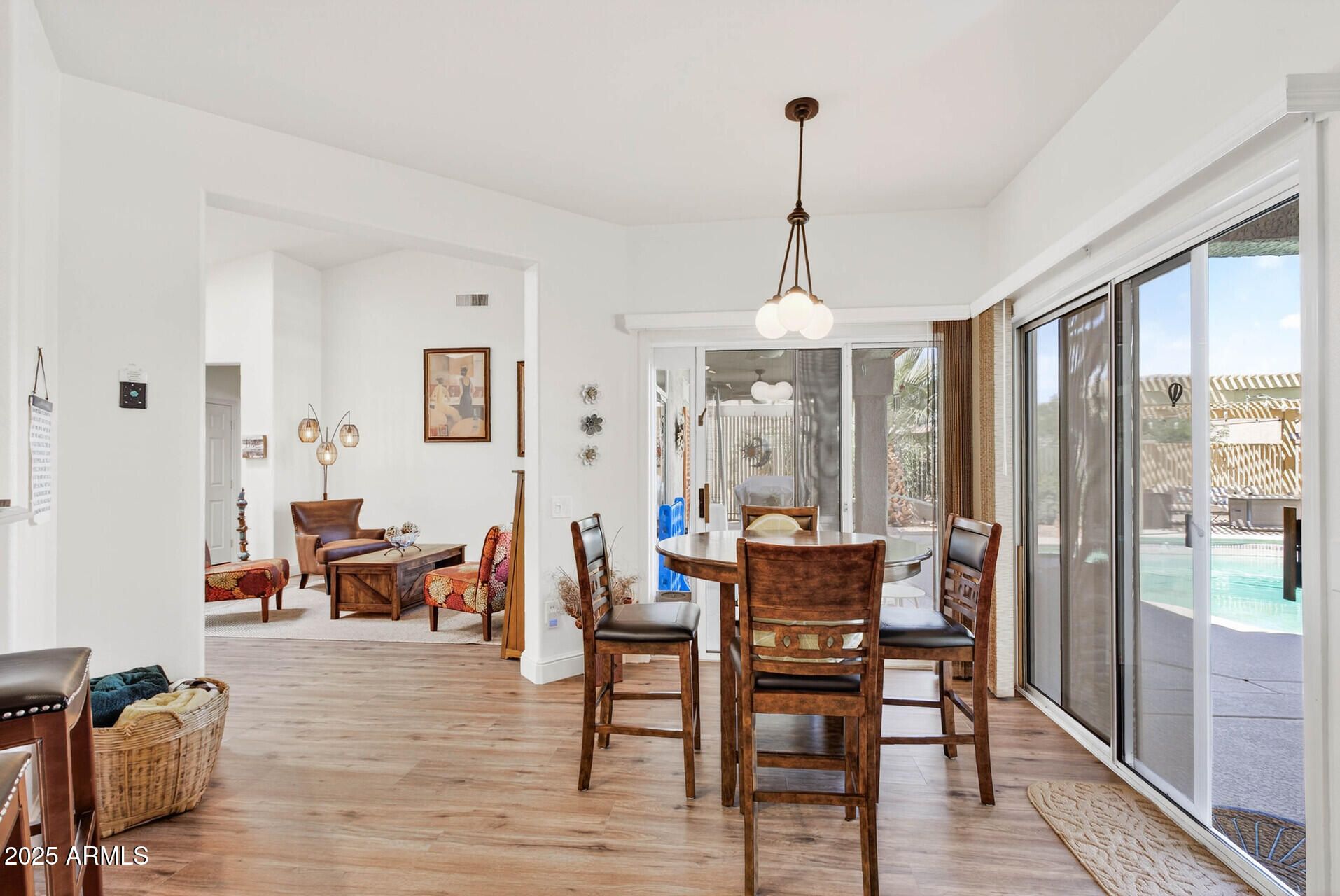 Welcome to this beautiful Lakeside model in the desirable 55-plus community of Sun City West, featuring 3 bedrooms, 2 bathrooms, 2.5-car garage and a split-bedroom floor plan. The spacious primary suite includes private patio access, leading directly to your very own sparkling, heated pool with cabana, perfect for relaxing or entertaining. Inside, you'll find vaulted ceilings, a cozy fireplace in the family room, kitchen cabinets with pull-outs & updated appliances, LVP flooring & updated baseboards, intercom sound system with speakers and much more. Solar panels help keep energy costs low year-round. Ideally located near golf, bowling, tennis, pickleball, shopping, restaurants, hospitals & clinics and more, this home offers the perfect blend of resort-style living & everyday convenience.