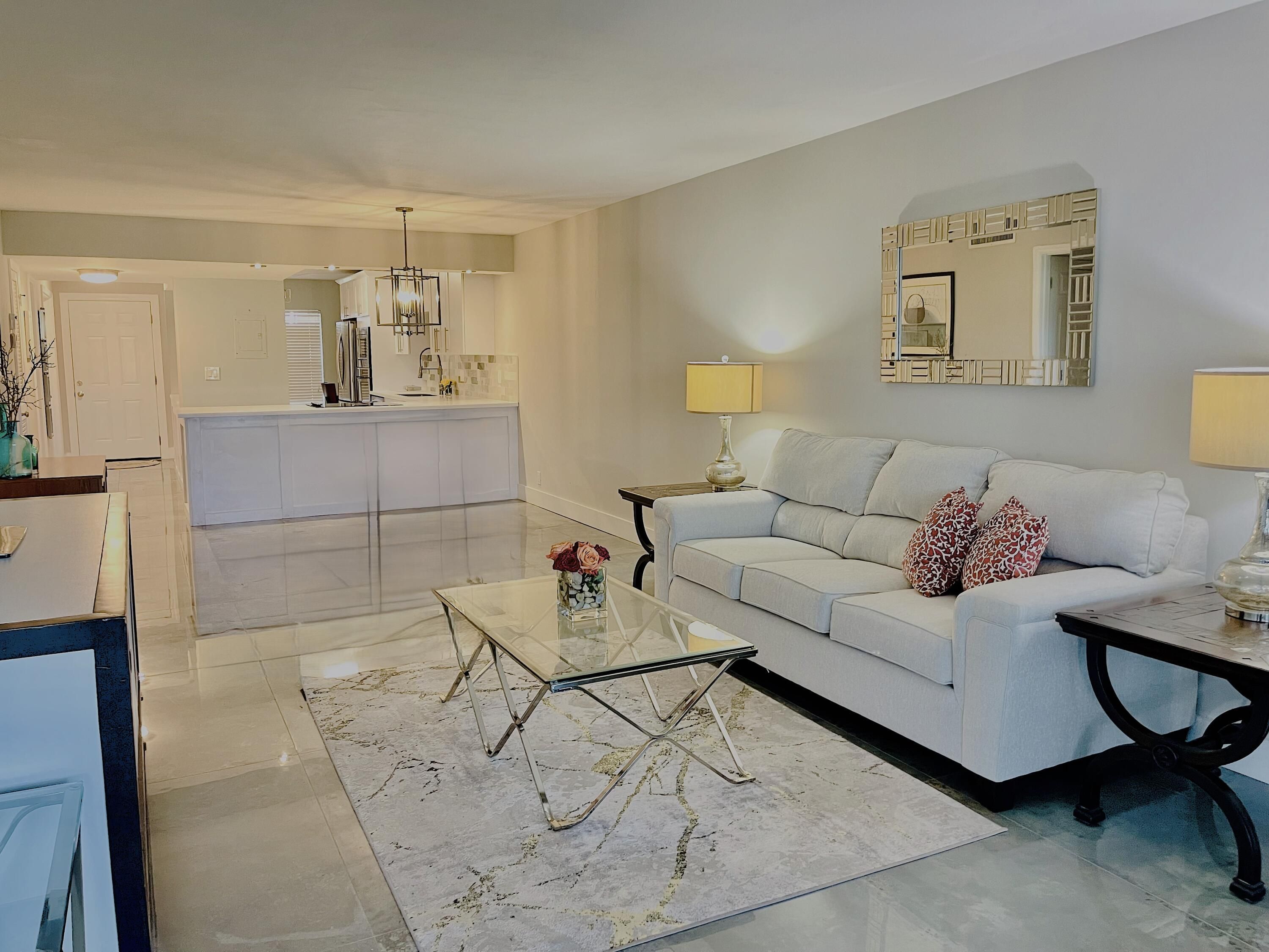 Palm Greens is a well-established 55+ community in Delray Beach, Florida, known for its vibrant lifestyle, affordable homes, and resort-style amenities.Beautifully Renovated 2BR/2BA Corner Unit First-floor residence featuring a spacious split floor plan, designer kitchen with quartzite counters and stainless steel appliances, marble flooring throughout, and volume ceilings. Enjoy serene lake views from the enclosed Florida Room and expansive patio. Both bedrooms offer ensuite baths for added privacy. Tastefully furnished and move-in ready! Amenities include; Heated indoor/outdoor pools, tennis & pickleball courts, fitness center, cafA(c), walking trails, and a vibrant social calendar. Minutes to Downtown Delray, beaches, shopping, and dining. Secure 55+ community offering the perfect blend