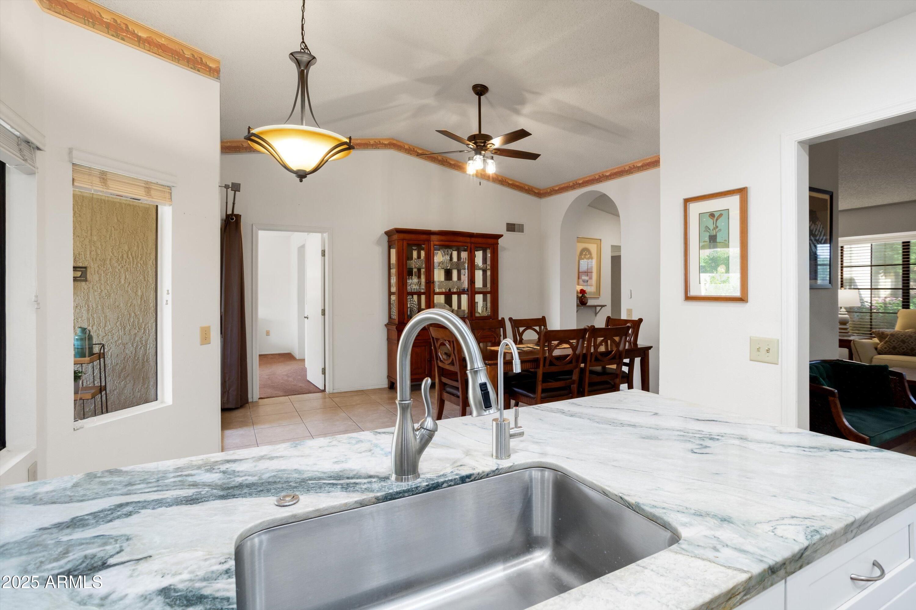 This charming 2-bedroom, 2-bath home offers a versatile split floor plan that ensures privacy for you and your guests. You'll love the modern kitchen featuring a raised ceiling with indirect lighting, newer soft-close cabinets, quartz countertops, and updated appliances, perfect for cooking and entertaining. Vaulted ceilings create a bright, inviting ambiance. The flexible layout allows you to design your living and dining spaces exactly how you like them. Outside is a spacious backyard and patio surrounded by fruit trees—your own little oasis for morning coffee or evening relaxation. Forget the chores and focus on fun! The HOA takes care of the front yard, common areas, roof, water, and more, giving you more time to enjoy all the amenities in a 55+ thriving community.