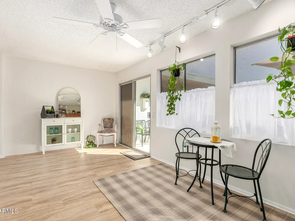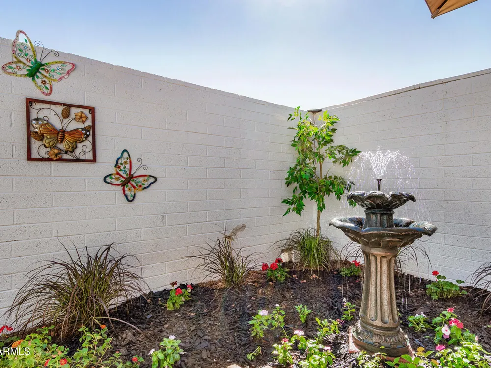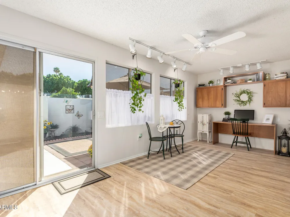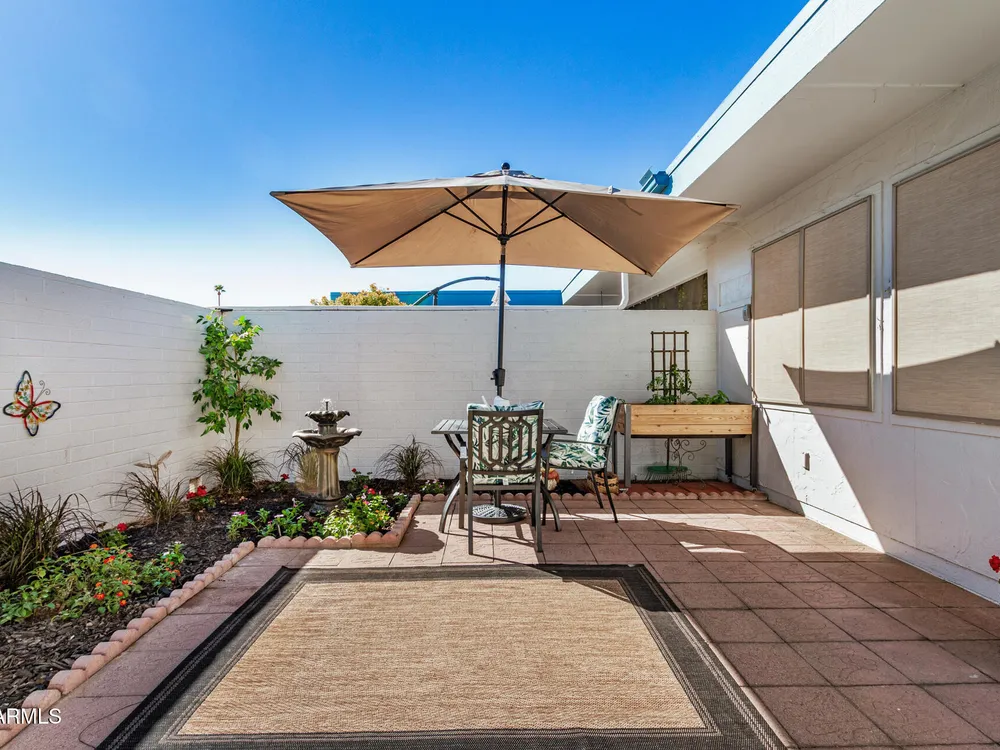 This beautifully maintained condominium boasts a fantastic layout that maximizes space and comfort. This property features a stunning courtyard sanctuary, perfect for enjoying your morning coffee or unwinding after a long day. The home offers two spacious walk-in closets, providing ample storage and organization. One of the standout features of this condominium is the unique, versatile space off the bedroom and dining room area. This area can be transformed into a hobby room, library, or any creative space you desire, a wonderful retreat for relaxation and inspiration. Experience the perfect blend of comfort & convenience. Close to shopping, banks, medical center, golf course and the Loop 101, with 7 recreation centers just for you, with one just 2 blocks away.