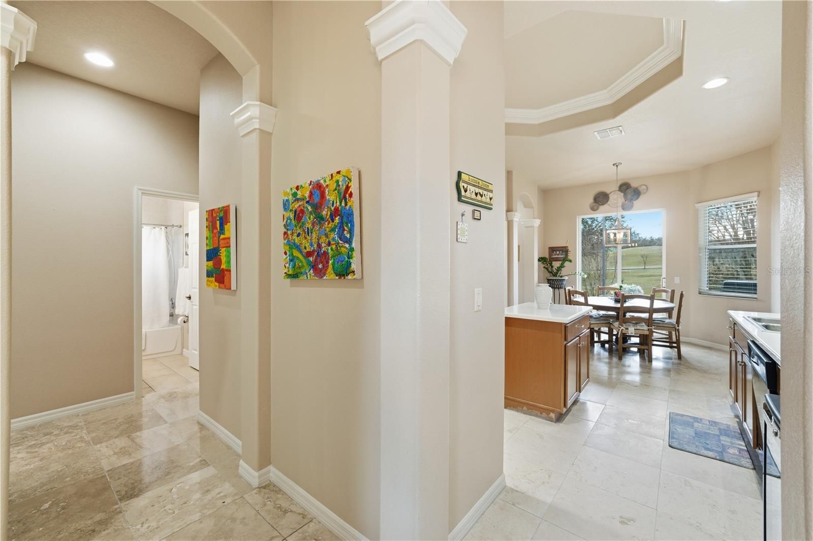 This beautiful 3 bedroom, 3 bath room, 3-car garage home in gated Lake Jovita Golf and Country Club, features ample arches, columns, niches, moldings, and tray ceilings throughout its 2,153 sf of living area. The open floor plan is perfect for entertaining and its numerous windows allow for an abundance of natural light. Sitting on a 1/2 acre lot with scenic views towards the front and the backyard facing the golf course, Lake Jovita is conveniently located 20 minutes from the shopping, dining, and entertainment scene of Wesley Chapel and nearby the small historic feel of downtown Dade City. It offers low quarterly HOA fees covering common areas and a community park. A clubhouse, two championship golf courses, gym, tennis courts, pool, and dining. Ready to enjoy this stunning property? Make it yours! *Membership to the clubhouse is optional.