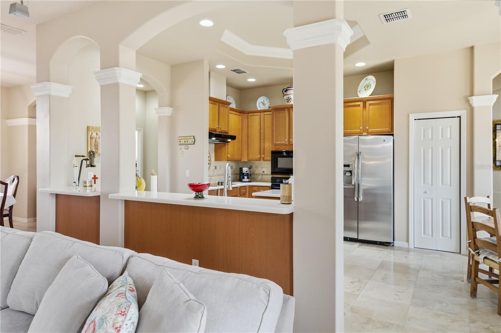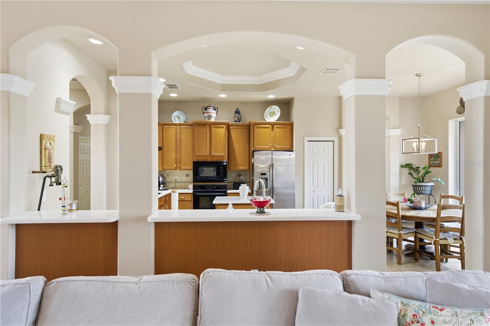 - Ceiling Fan(s), Crown Molding, High Ceilings, Kitchen/Family Room Combo, Living/Dining Room, Open Floorplan, Thermostat, Tray Ceiling(s), Window Treatments