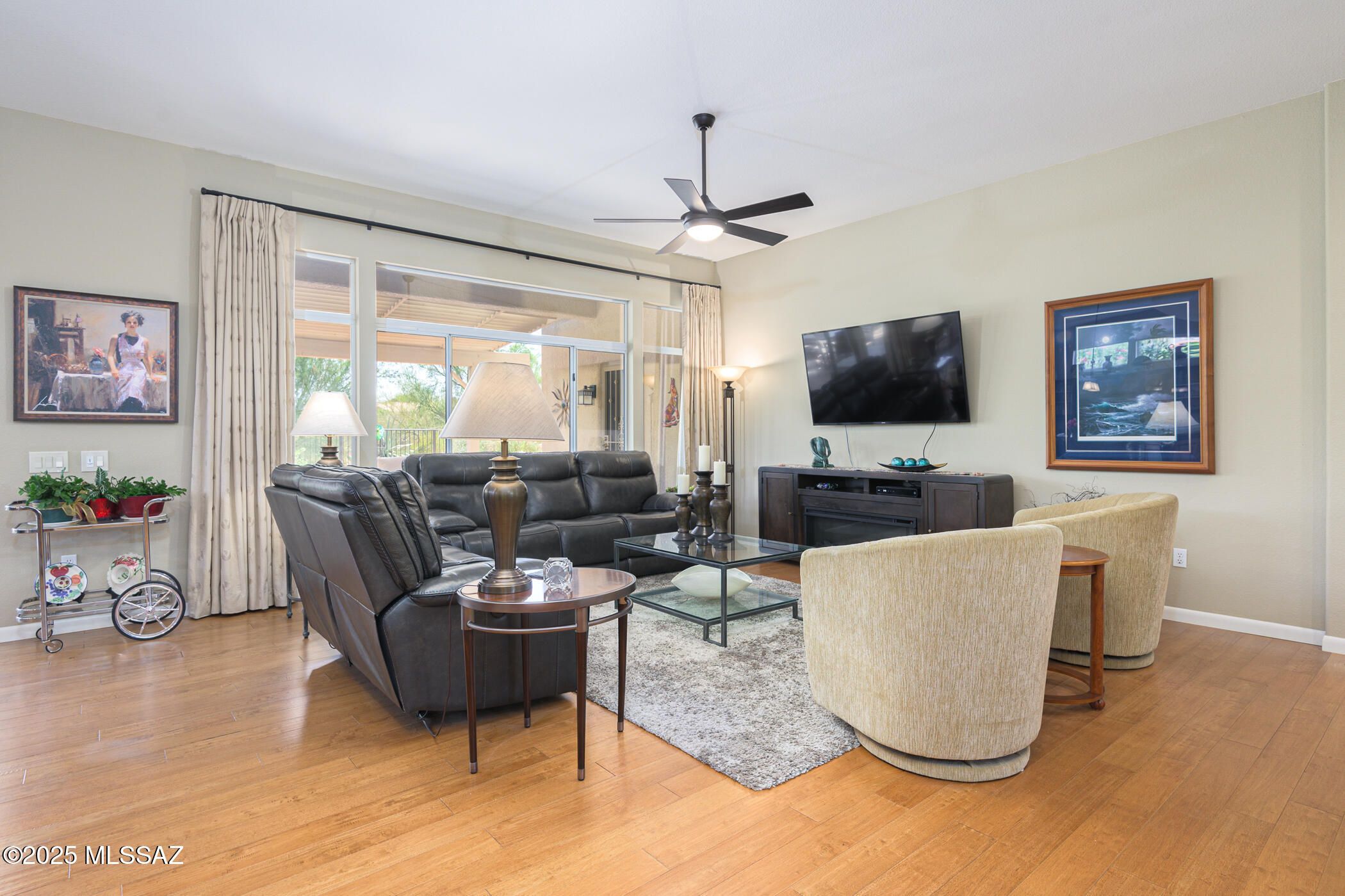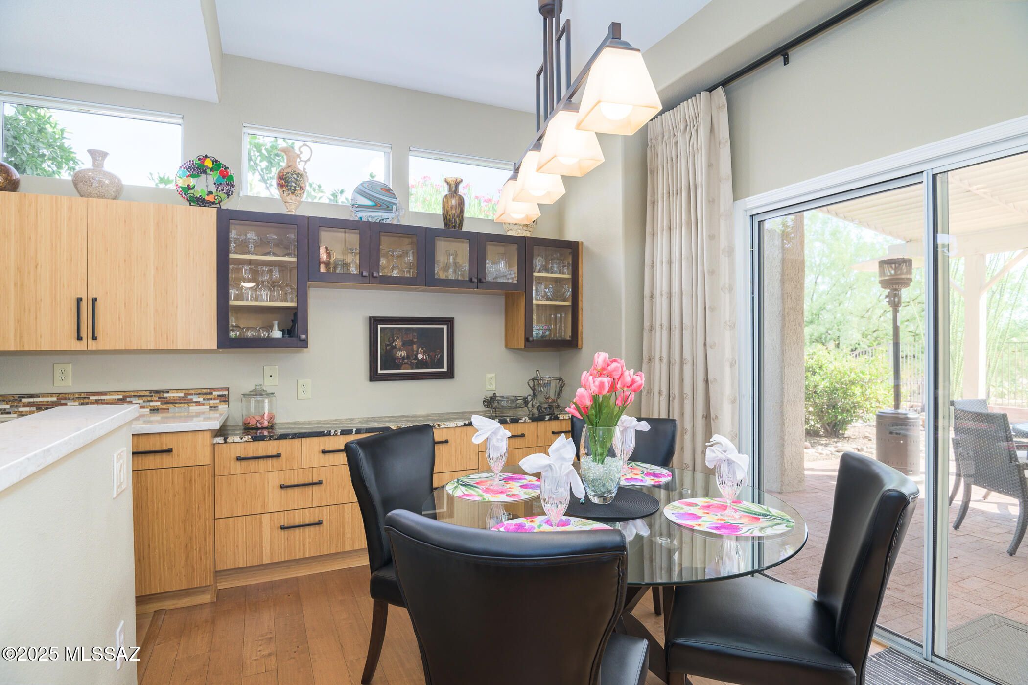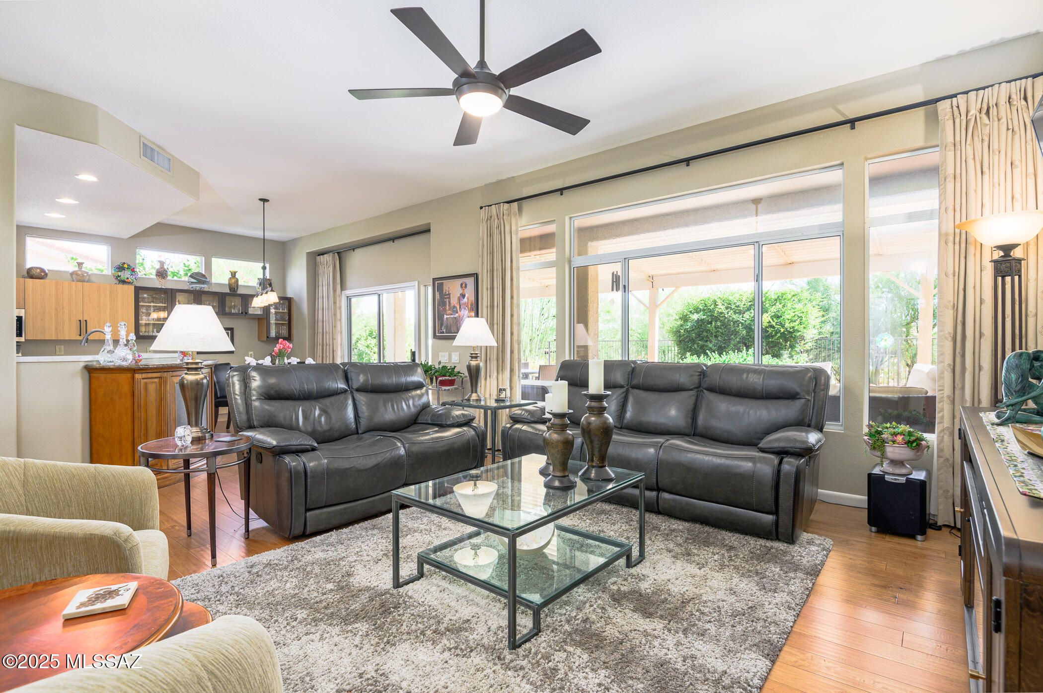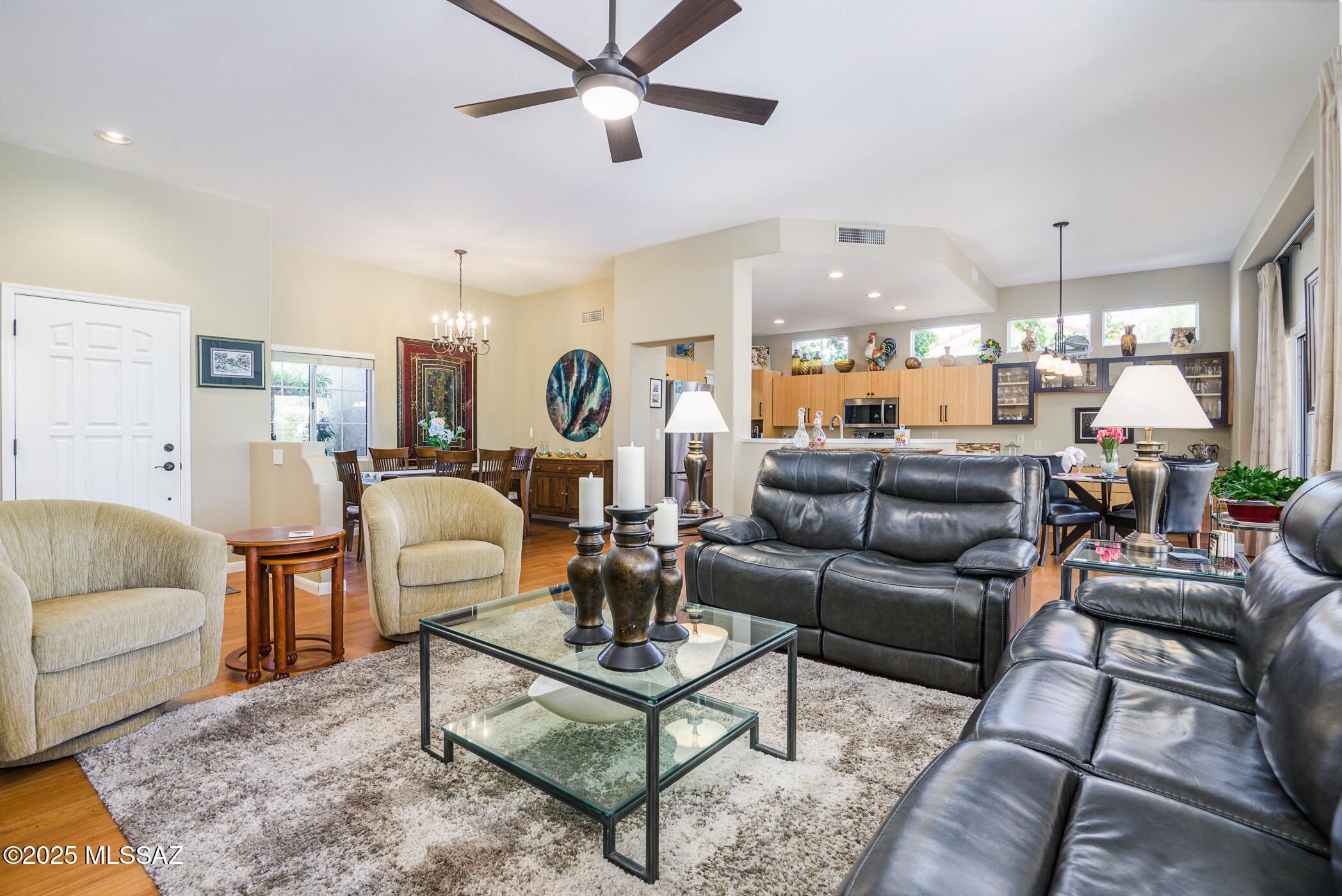 You'll love the feeling you have as you enter this beautifully updated and highly desirable Crescent model home - located in the heart of Oro Valley's highly desirable Sun City community. This bright, 2 bedroom, 2 bath home with additional office/den offers timeless elegance, modern upgrades and the tranquil desert lifestyle you've been searching for. You'll feel welcomed by the inviting, open concept living space which showcases expansive picture windows and rich Hevea and Oak wood flooring, plus soft neutral tones - creating a warm, modern feel. The remodeled kitchen is a standout and features sleek, custom cabinetry, quartz countertops, stainless steel appliances, stylish tile backsplash and extended bar area with gorgeous granite and glass-doored display cabinets. The spacious