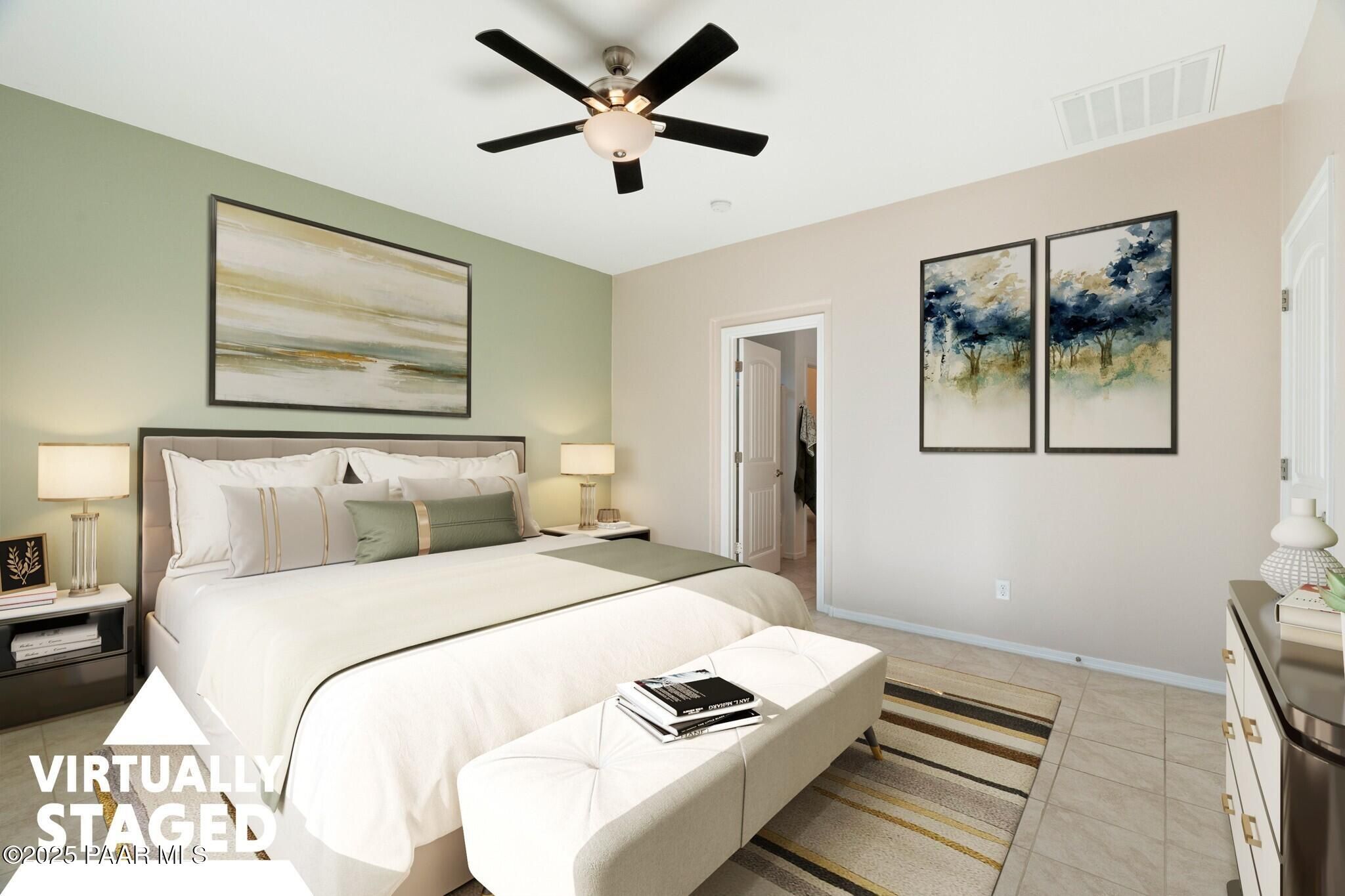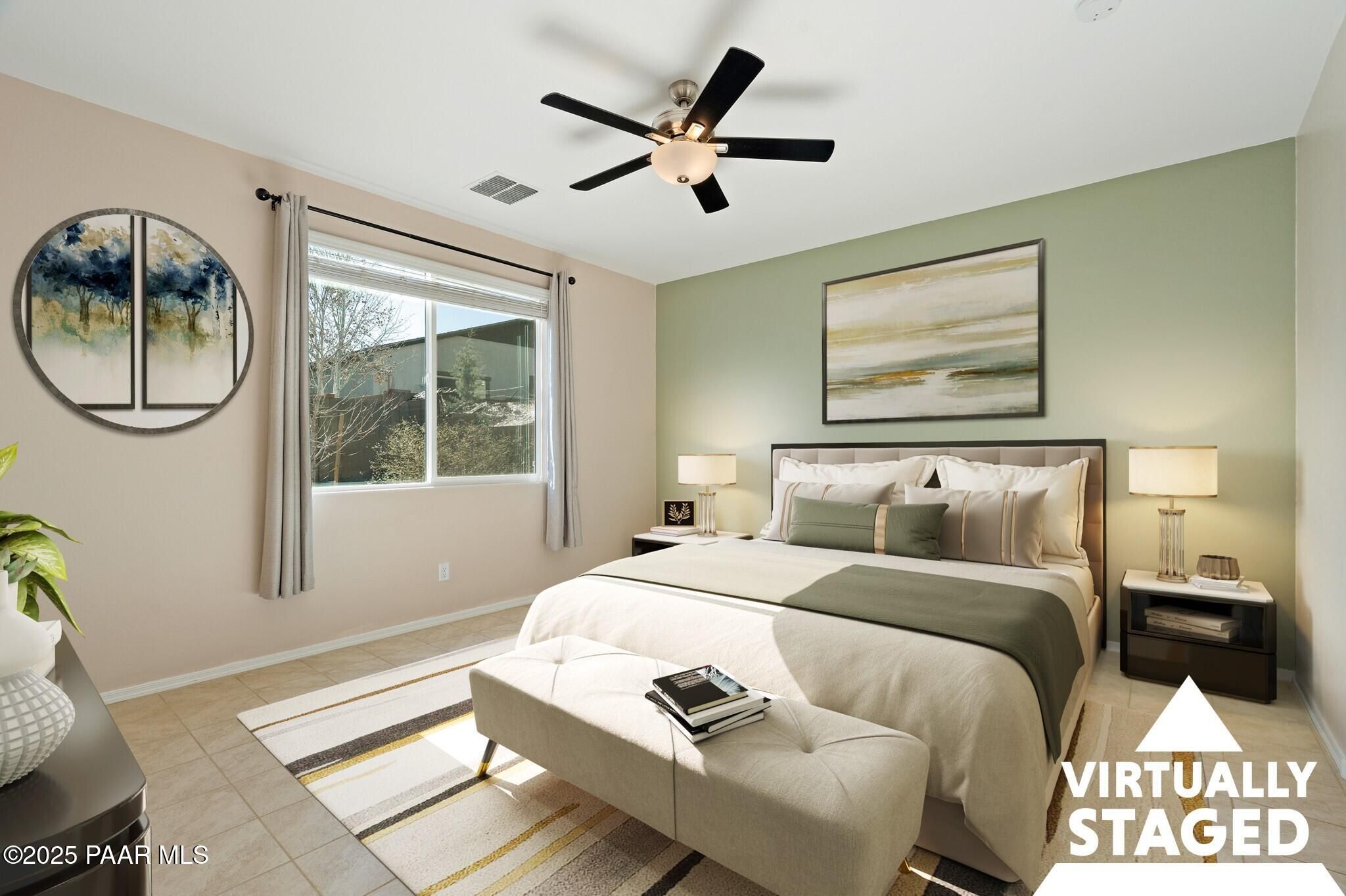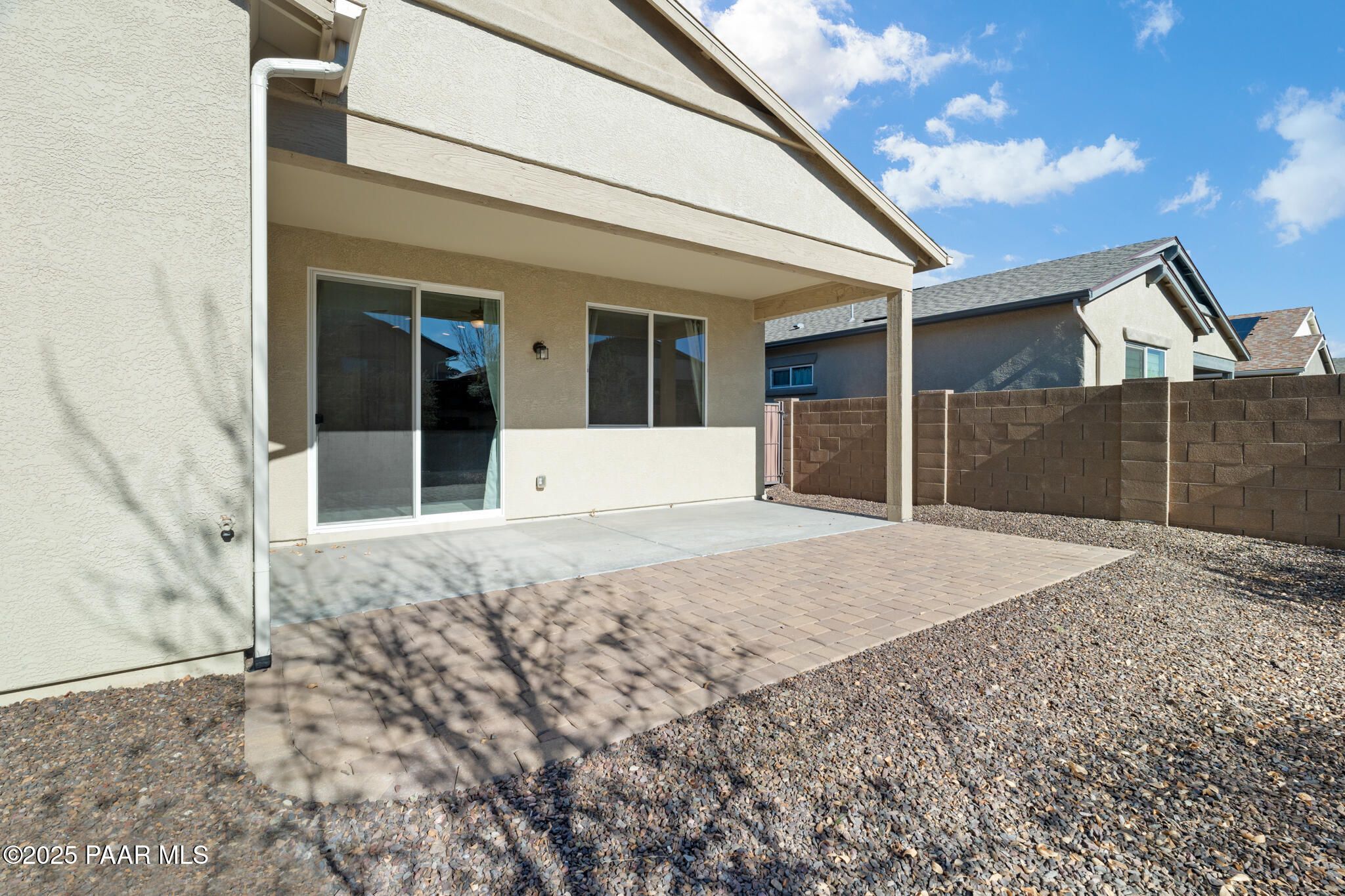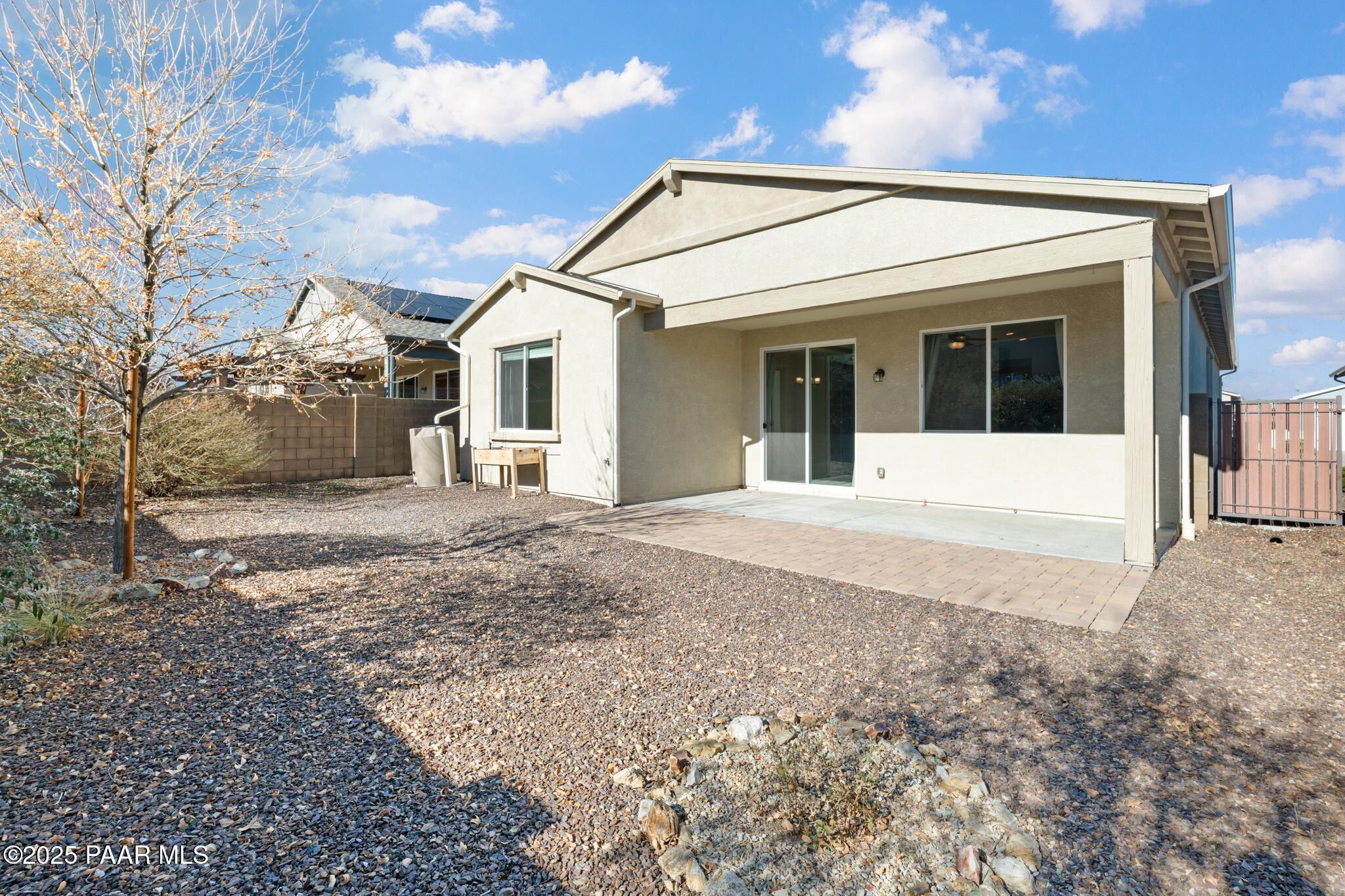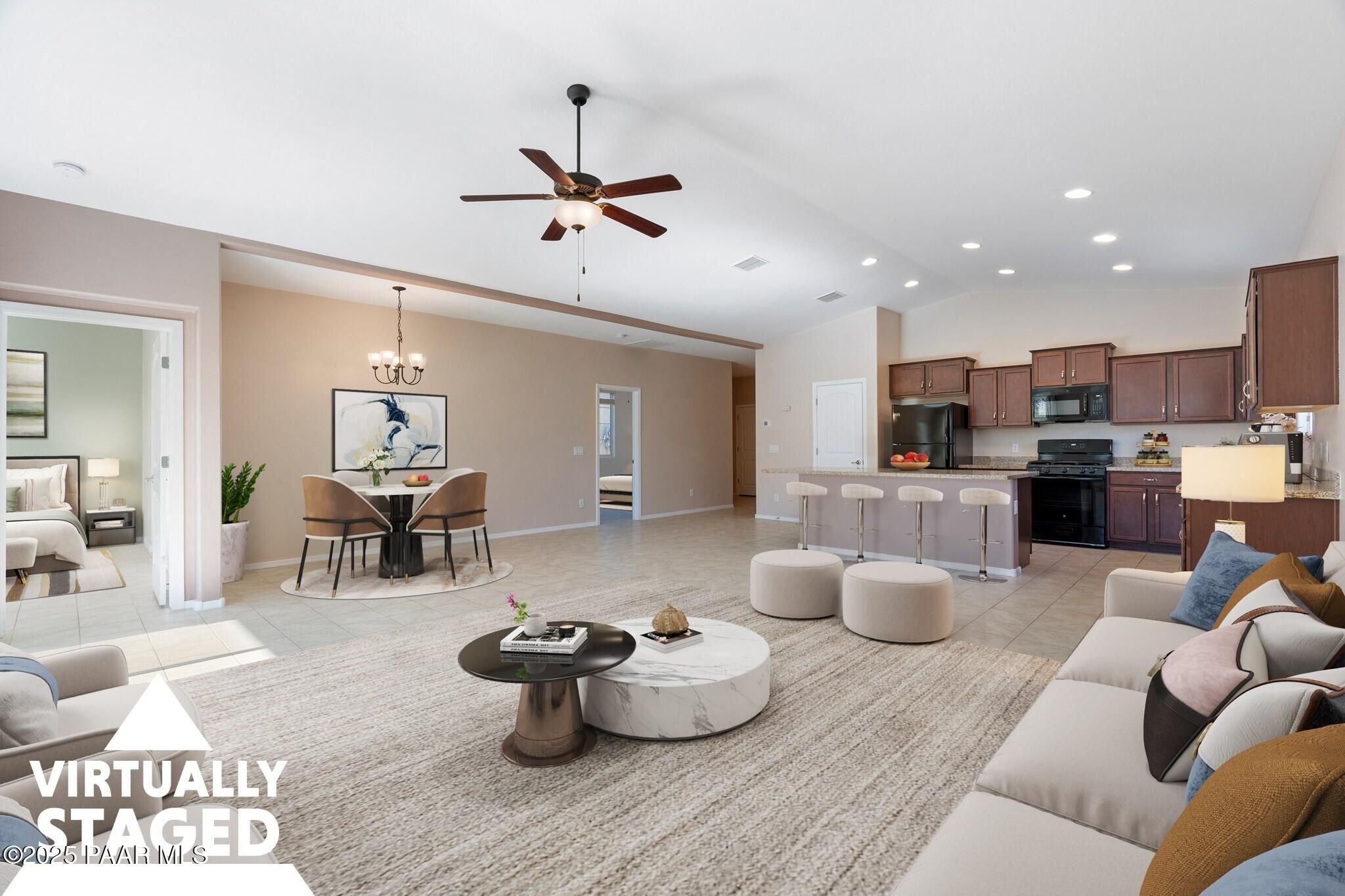 A contemporary ranch-style home built in 2019 welcomes you with clean lines, easy-care landscaping, and a charming covered entry that sets the tone for the inviting spaces inside. Step through the front door and into a bright, open great room where vaulted ceilings enhance the spacious feel. Beautiful tile flooring runs throughout the entire home offering both style and effortless maintenance. The expansive living and dining areas sit just off the kitchen and enjoy views of the extended covered patio, creating a seamless indoor-outdoor flow.The kitchen is designed for both function and appeal, featuring a generous island, abundant cabinetry, black appliances including a gas range, solid-surface counters, and a large pantry. Its open layout makes entertaining easy and keeps everyday living comfortable and connected.Privately tucked at the back of the home, the primary suite provides a peaceful retreat with a spacious bedroom, walk-in shower, dual-sink vanity, linen storage, and a large walk-in closet. Two additional bedrooms are thoughtfully separated from the primary suite--one just off the great room, perfectly suited for guests or a home office, and another at the front of the home near a full guest bath. A sizable laundry room with a utility sink and washer/dryer hookups adds everyday convenience.The backyard offers low-maintenance enjoyment with an extended paver patio, rock landscaping, trees, privacy block walls, and rainwater catchment. An attached two-car garage, city utilities, and proximity to golf, the airport, and Embry-Riddle Aeronautical University further enhance the appeal. Spotless and move-in ready, this home blends comfort, contemporary style, and practical living in one exceptional package.