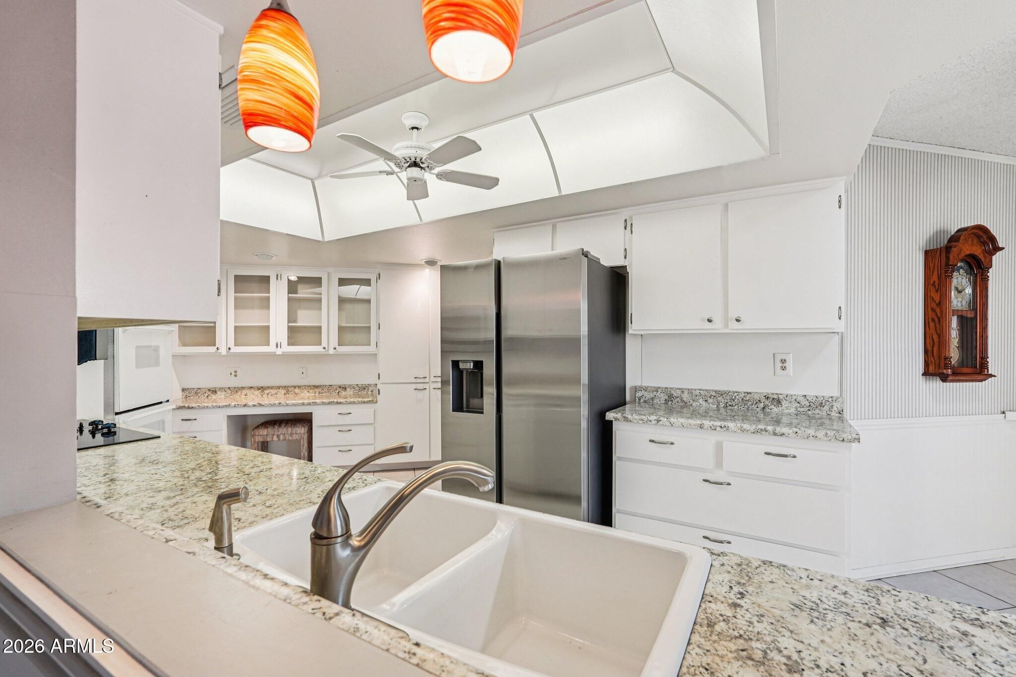 Enjoy easy living in this well-maintained 2-bedroom, 2-bath patio home in Sun City. The layout offers bright, open living spaces with tile flooring in the main areas and plenty of natural light. The kitchen features white cabinetry, double ovens, and skylights, opening comfortably to the dining and living areas. The primary bedroom includes mirrored closet doors, built-in storage, and an ensuite bath with a walk-in shower. A spacious secondary bedroom and bath work well for guests or a home office. The large garage and utility area provide exceptional storage with built-in cabinets, work surfaces, and a laundry sink. Step outside to a private, enclosed patio with covered seating, ceiling fan, paver accents, and mature citrus trees, ideal for relaxing or entertaining. Residents enjoy access to golf courses, recreation centers, pools, fitness facilities, clubs, and social activities, making this a great opportunity to enjoy the Sun City lifestyle.