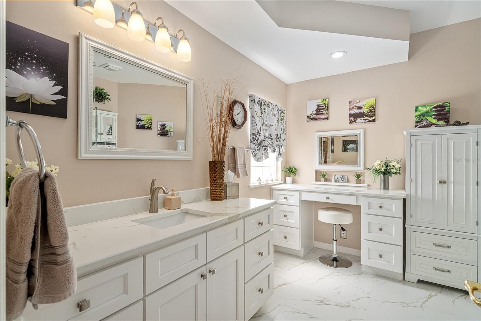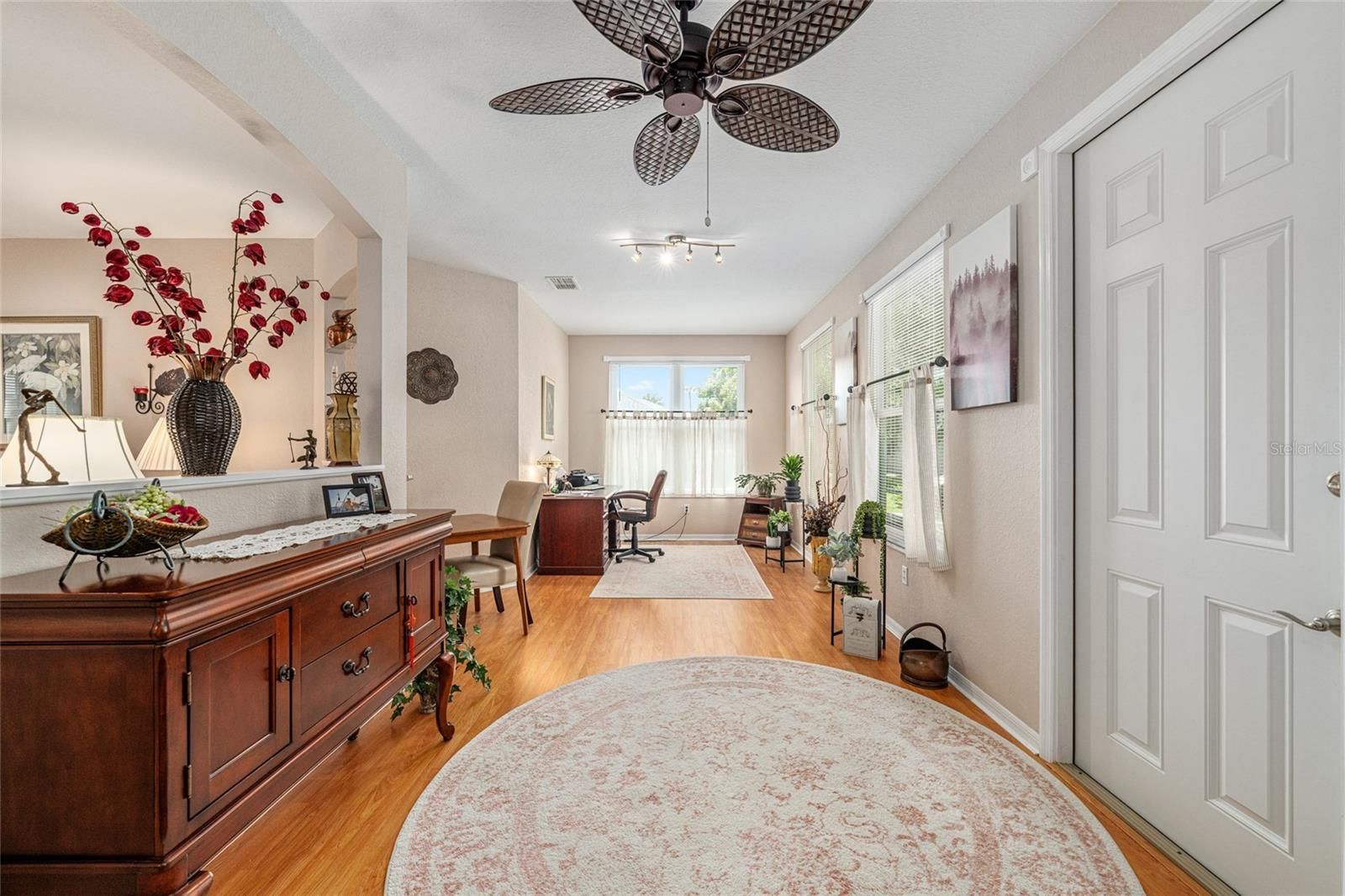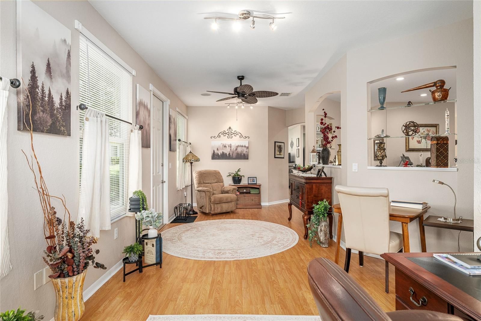 - Ceiling Fan(s), High Ceilings, Kitchen/Family Room Combo, Living/Dining Room, Open Floorplan, Solid-Wood Cabinets, Split Bedrooms, Stone Counters, Thermostat, Walk-In Closet(s), Window Treatments
