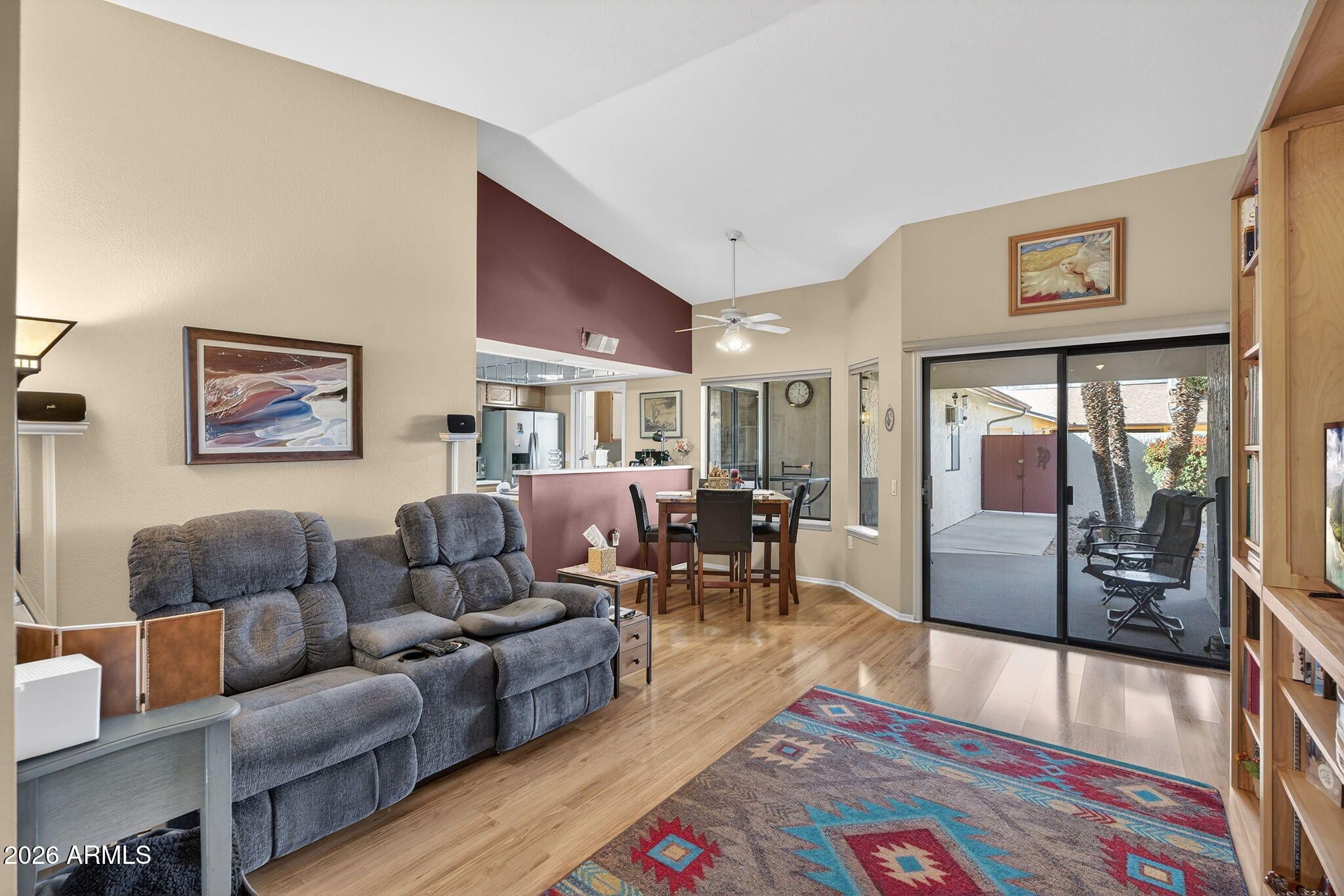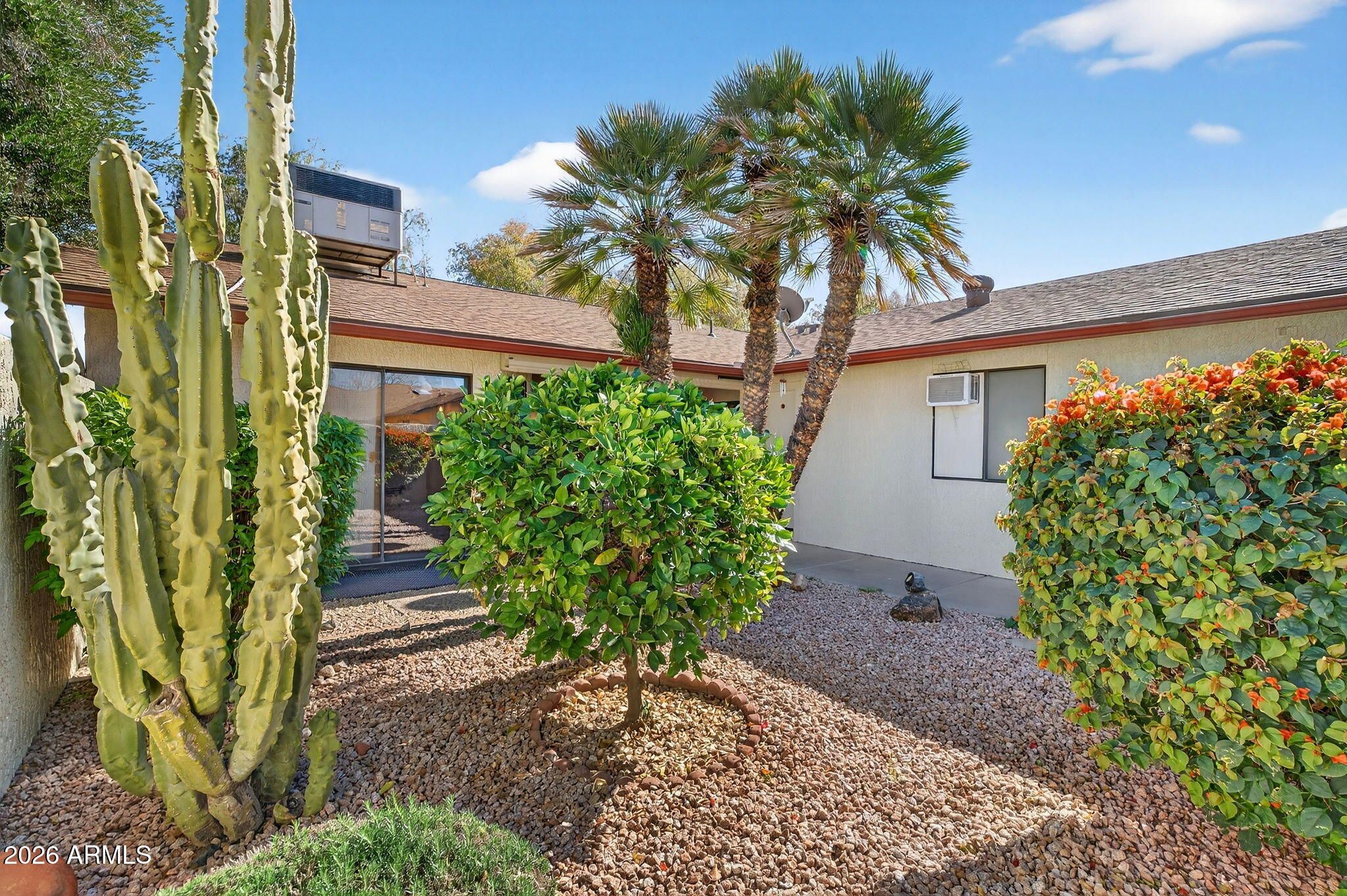 This pristine jewel box is MOVE-IN READY and priced BELOW MARKET, having been kept meticulously by the owners. Enter the tranquil, tree-lined courtyard and step through the door to this beautiful Pueblo model 2 bed, 1.75 bath home with updated Interiors by Thomas. Terrific natural light abounds from the vaulted ceilings, solar tubes and large windows with remote controlled shades. Updates include new hot water heater (2024), newer appliances (2012, 2025), custom paint (2012), updated flooring (2012) and surround sound system. Enjoy an expansive primary suite with a generous bathroom that features double sinks and private toilet. Laundry room includes newer washer and dryer (2016) and storage. Single car garage features wet/dry vac, stand-alone freezer, and A/C, as well as ample storage. Enjoy stunning Arizona sunrises and sunsets in the lush, private backyard with covered patio, double gate, and slab for golf cart/bike parking. This home is central and convenient to all amenities in a serene yet active 55+ community.
