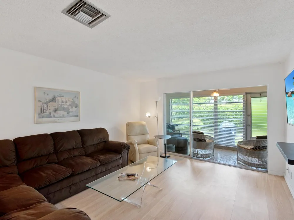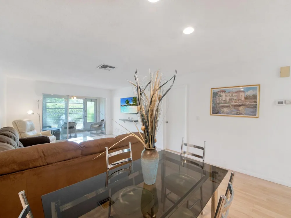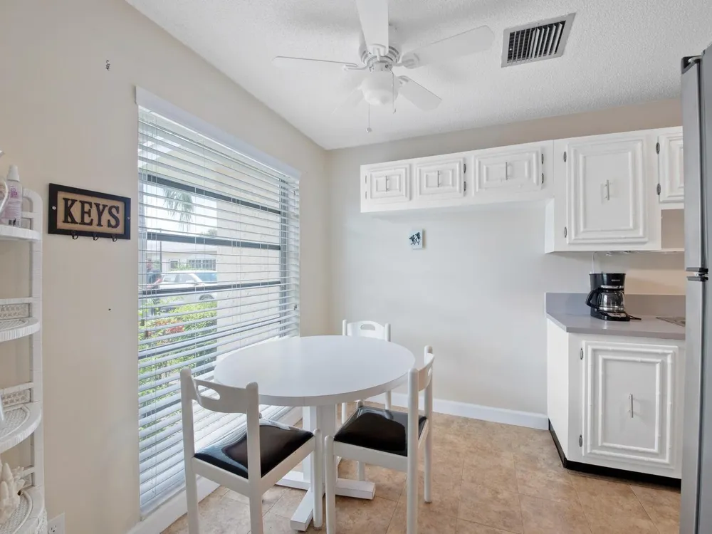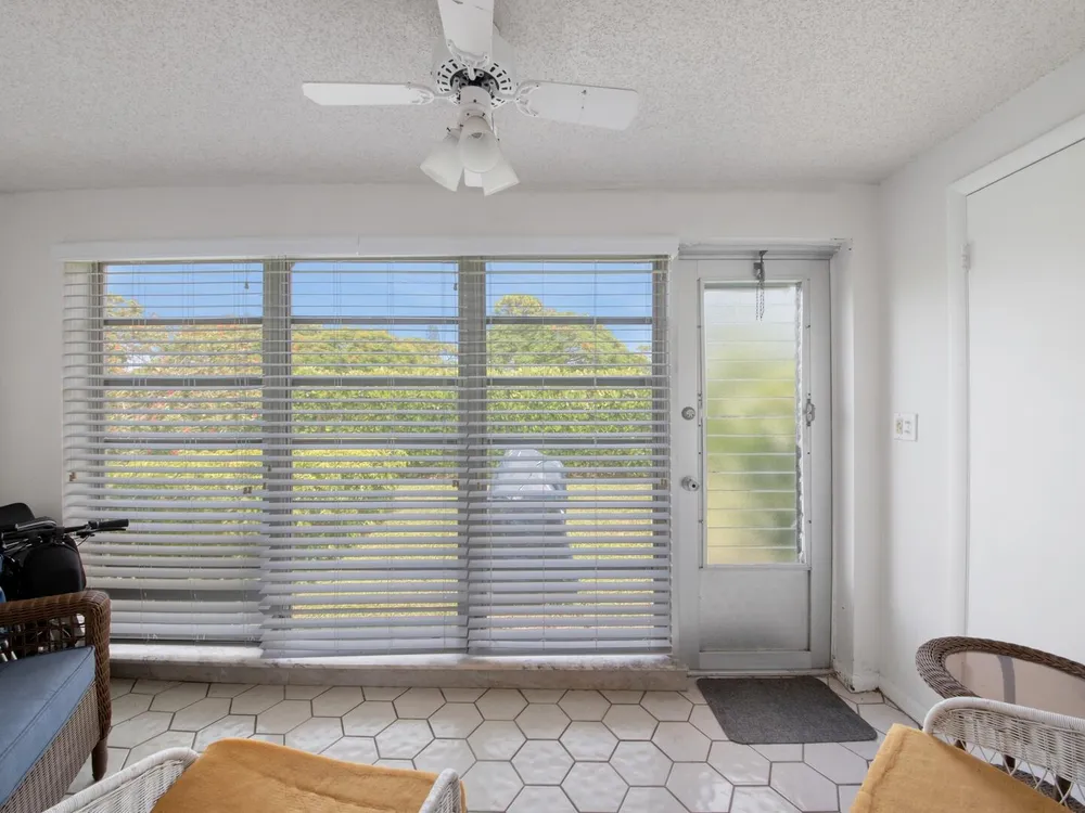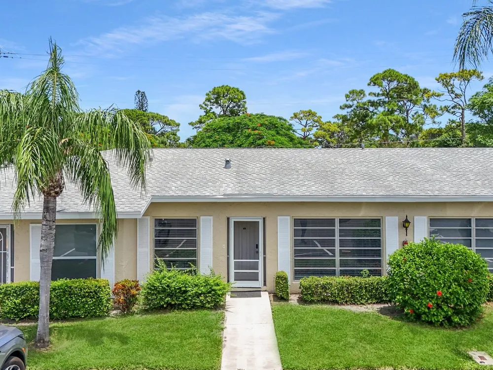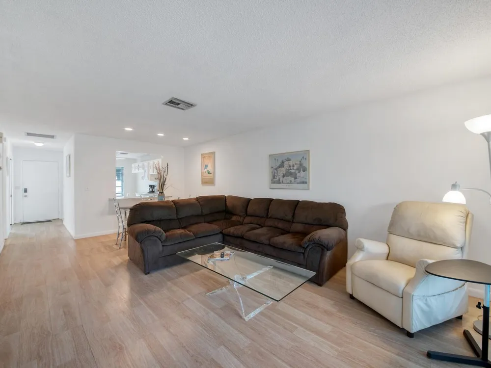 Furnished 2-bedroom, 2-bath villa in sought-after Palm Greens! This charming home features a bright and spacious living room, dedicated dining area, and easy-care laminate flooring throughout. The kitchen offers white cabinetry, a cozy breakfast nook, and a convenient pass-through to the dining area. Enjoy indoor-outdoor living on the enclosed patio, perfect for relaxing or entertaining. Filled with natural light and thoughtfully furnished, this villa offers comfort and convenience in a vibrant 55+ community.