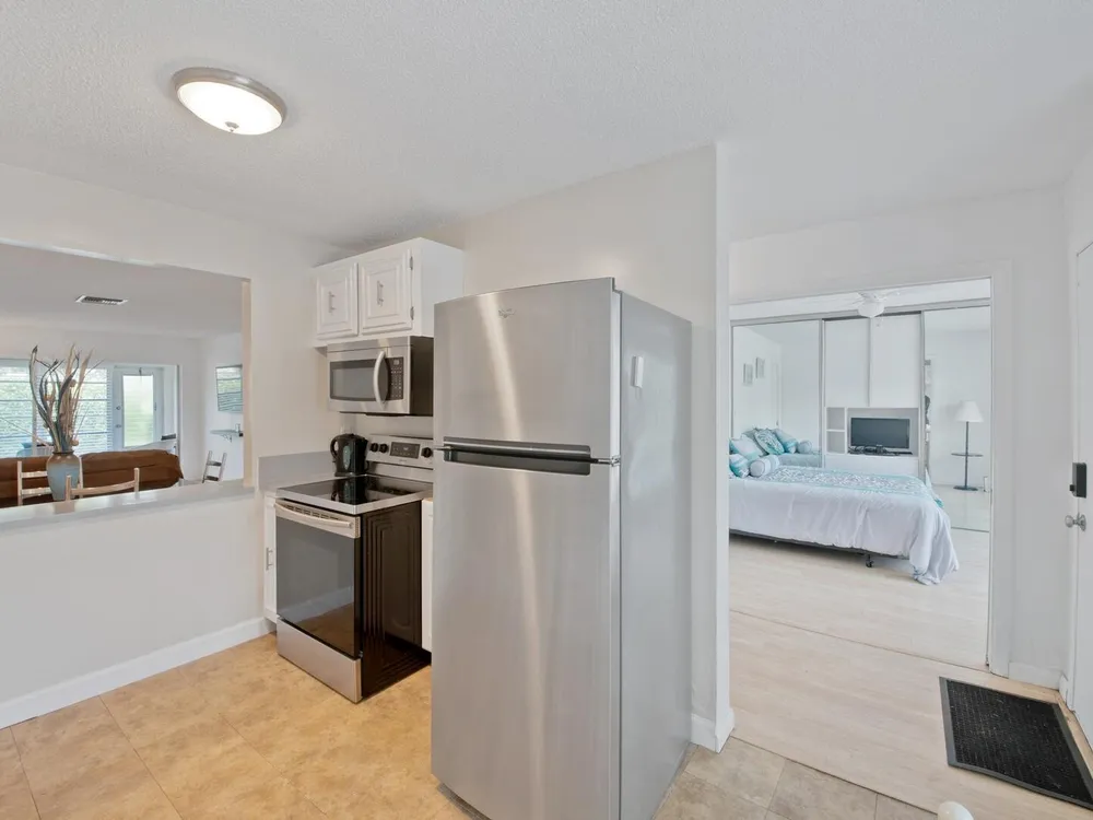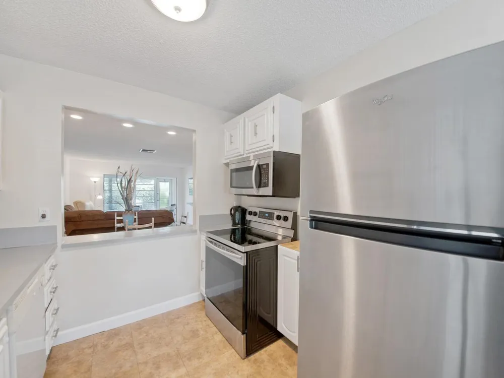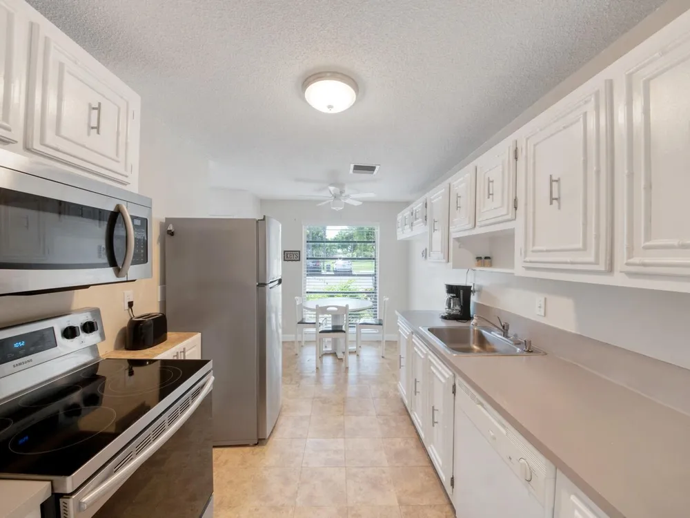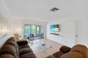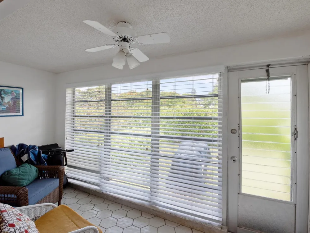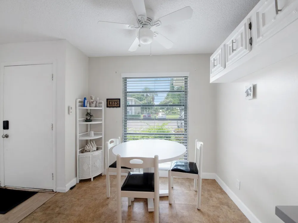 Furnished 2-bedroom, 2-bath villa in sought-after Palm Greens! This charming home features a bright and spacious living room, dedicated dining area, and easy-care laminate flooring throughout. The kitchen offers white cabinetry, a cozy breakfast nook, and a convenient pass-through to the dining area. Enjoy indoor-outdoor living on the enclosed patio, perfect for relaxing or entertaining. Filled with natural light and thoughtfully furnished, this villa offers comfort and convenience in a vibrant 55+ community.
