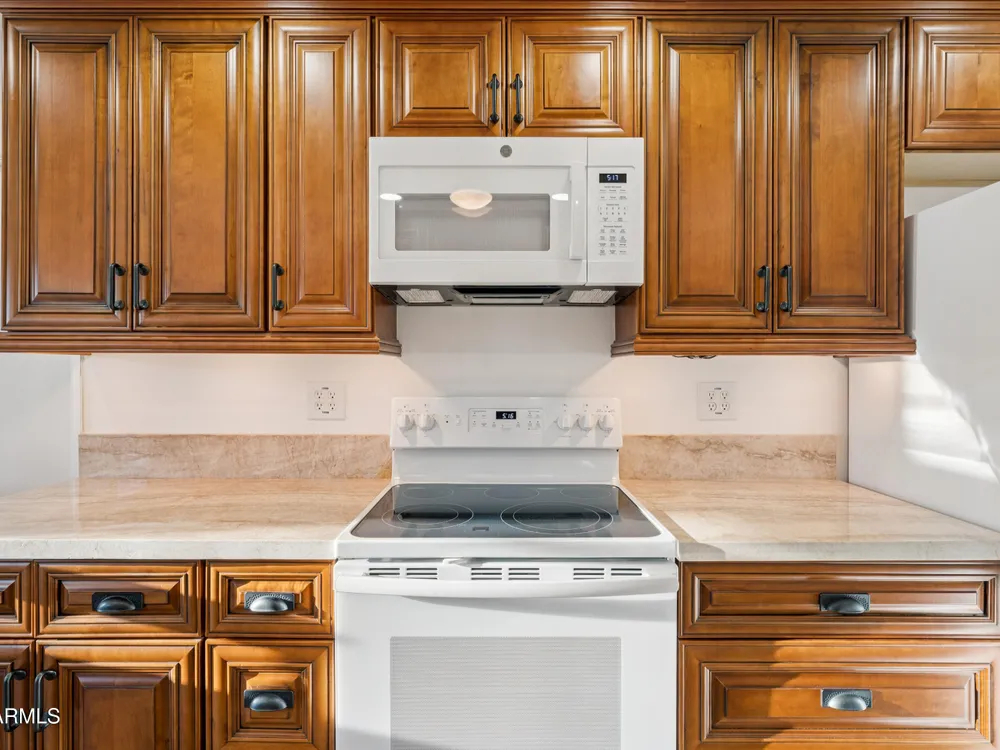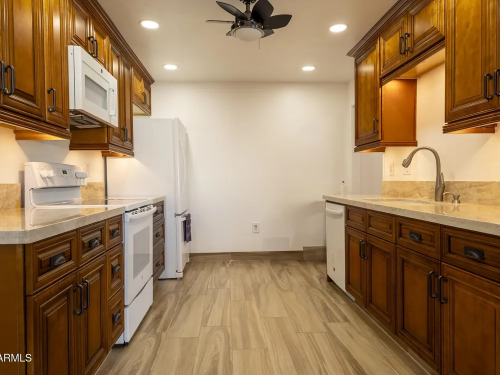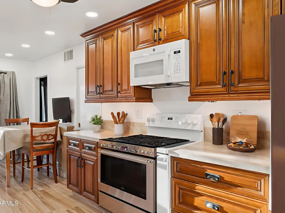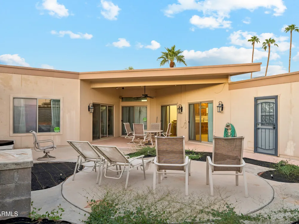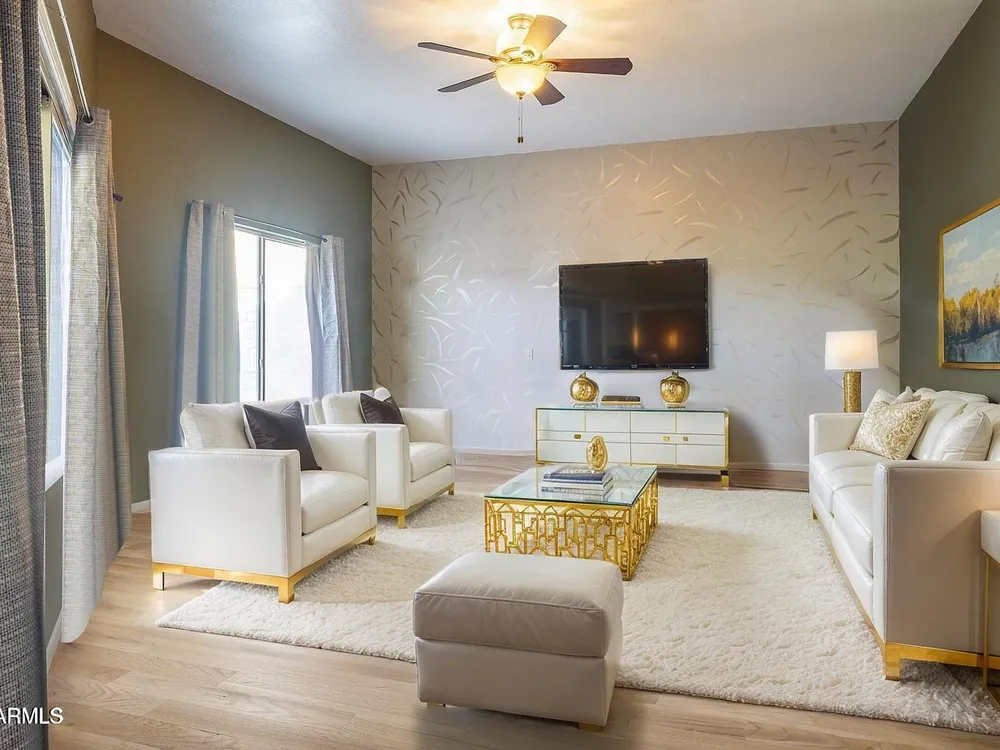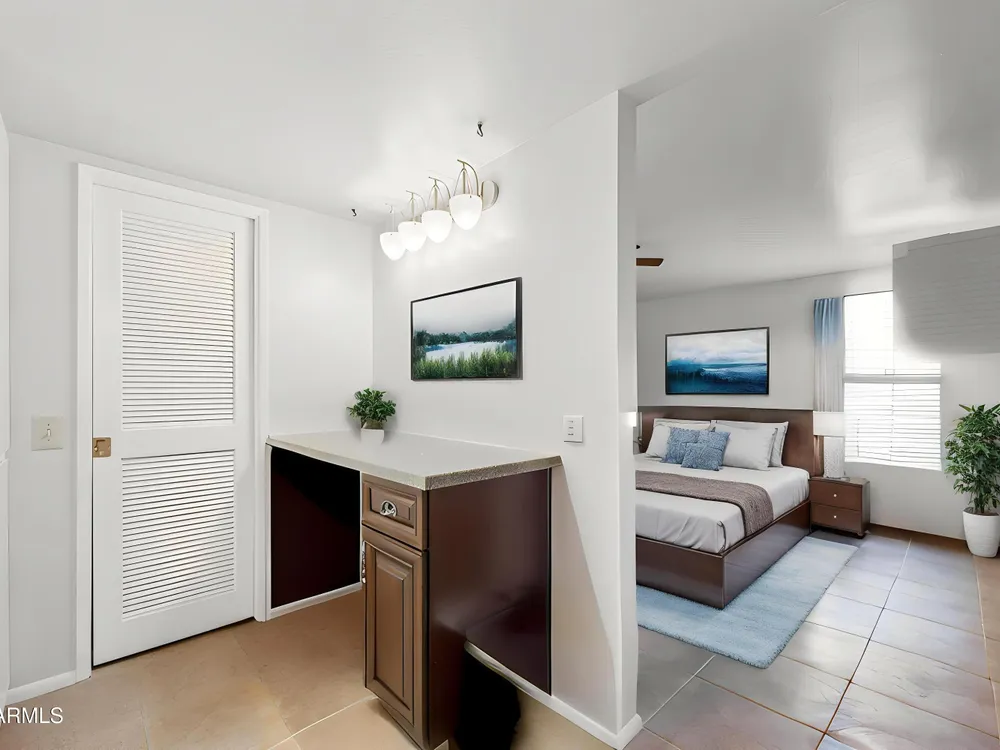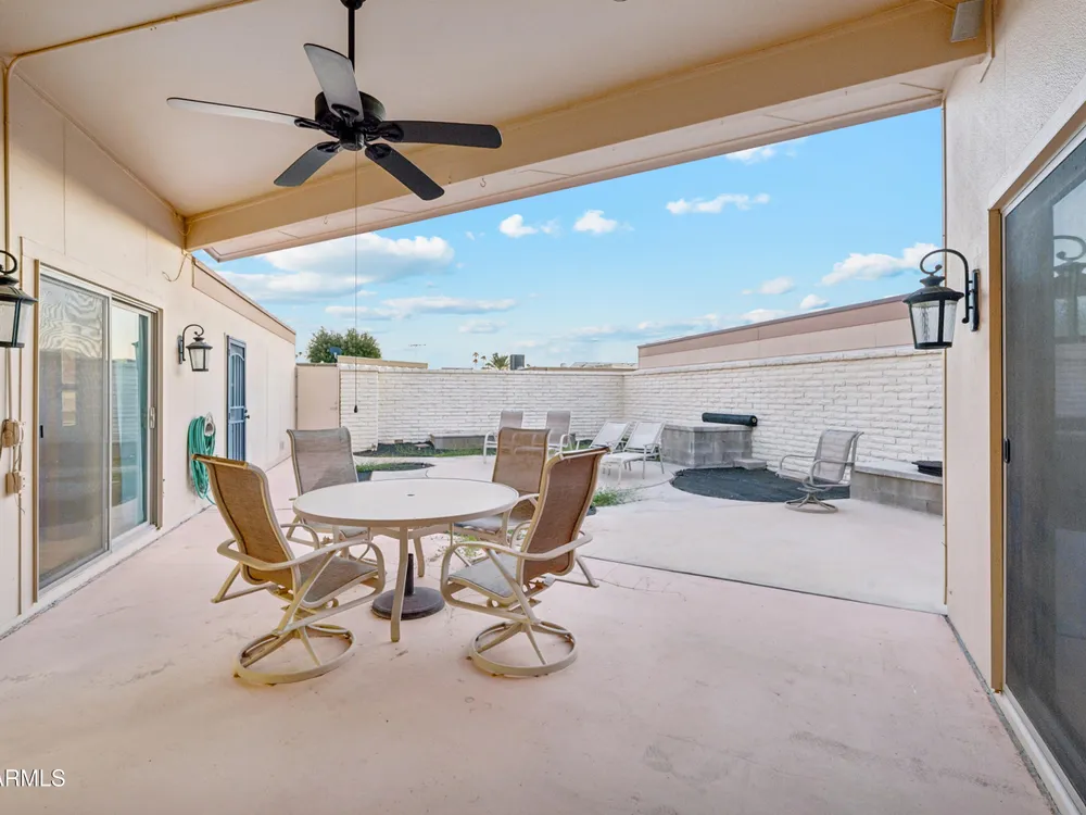 Welcome to elegance, comfort, and unbeatable value! The upgrades to this 1,835 square foot home make it one of a kind in the heart of Sun City. Don't blink or you will miss all the unique features. Skip-trowel textured walls and ceilings, a locally commissioned metallic focal wall that's an artistic centerpiece that shifts with the light, and a Butler's kitchen are just a few examples of elegant upgrades that aren't found in surrounding 2 bedroom, 2 bath homes. In the list of additional upgrades, you will find Cambria quartz countertops in the bathrooms, premium tiled shower, a cast-iron soaking tub in the hall bath, kitchen cabinets with maple solid raised-panel doors, quartzite kitchen countertops, a high-efficiency Goodman HVAC and Rheem hot water heater, and so much more. Behind the scenes, electrical and plumbing systems have been professionally upgraded, including GFCIs, LED lighting, pressure-assist toilets, and all new ¼-turn water valves. Enjoy the large private patio, perfect for outdoor living and entertaining and plant-ready soil for your favorite foliage. The HOA covers common-area landscaping, water, sewer, trash, pest control, roof maintenance, and exterior insurance. You will also enjoy access to 7 golf courses, 8 rec centers, pools, fitness, clubs, and countless classes for every interestfrom pickleball to pottery. Built by Del Webb in 1972 and updated with precision and care, this home is your gateway to affordable luxury in iconic Sun City.