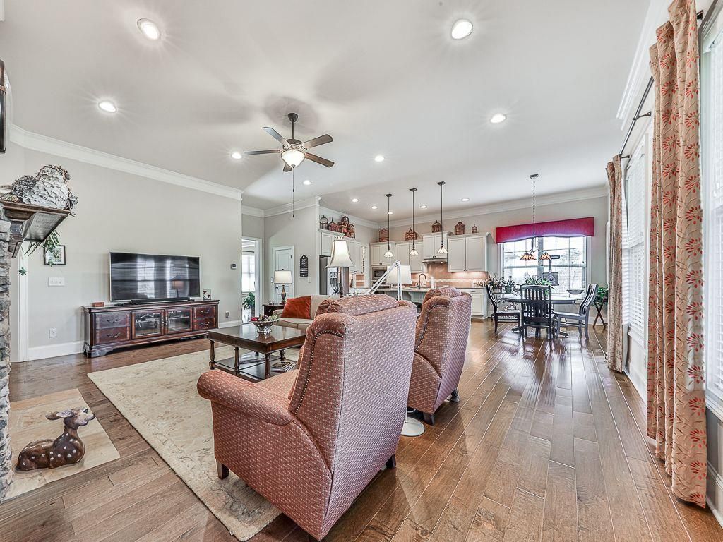 This is the one you have been waiting for! The Trenton, in fabulous Soleil Laurel Canyon has coveted 3rd garage bay for golf cart and extended driveway. Situated on a private, cul-de-sac lot and overlooking woods, you will love the open side lot with no neighbor. Extensive crown molding, tray ceilings, recessed lighting, and gorgeous wood floors welcome you in to cozy foyer! Foyer flanked by dedicated office space and large dining room. Convenient Butlers Panty connects dining room to kitchen for ease of entertaining. Expansive, open floor plan makes gatherings a breeze! Stone surround and hearth fireplace is focal point in living room with open sight lines to kitchen with white cabinets and island perfect to pull up a chair and chat with the host or hostess! Eat in area and extra space off of kitchen could be keeping room or set up a game/puzzle area for relaxing evenings. Primary suite is oversized and leads to serene spa bath with oversized tile HEATED flooring, separate vanities, soaking tub and walk in shower with bench. Primary suite also offers walk in closet with convenient built-ins and ease of access to laundry room. Main floor houses additional bedroom and bath, while finished basement includes third bedroom and full bath. All bathrooms are beautifully appointed! Hallway from garage offers extra storage with cabinets and countertop. Basement includes a copious amount of unfinished space for storage or workshop area! Comfortable deck with two ceiling fans and additional patio off of walk out basement rounds out this stunning home in popular active adult neighborhood. Soleil Laurel Canyon has so much to offer, including 24 hour manned gate, clubhouse with library, billiards, indoor-outdoor pools/sauna, garden plots and greenhouse, tennis and pickleball, copious amounts of clubs will always keep you social and engaged. Truly, a remarkable lifestyle close to shopping, restaurants, and state of the art medical facilities!