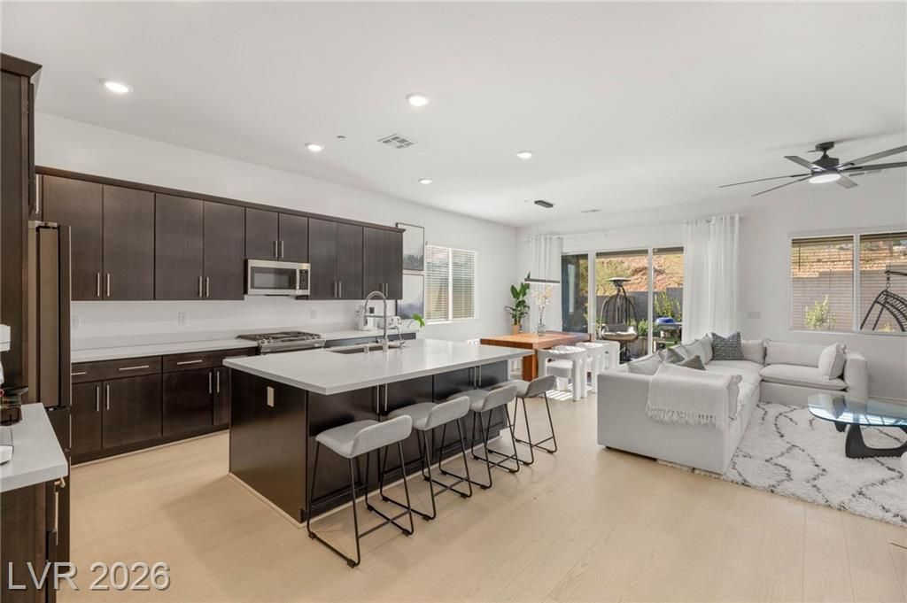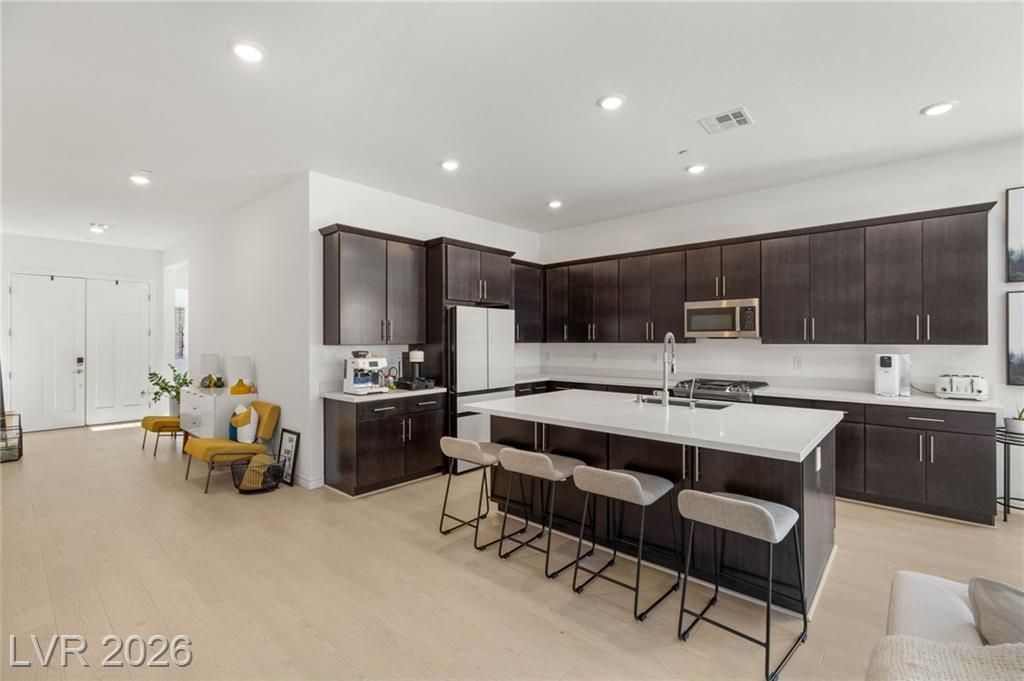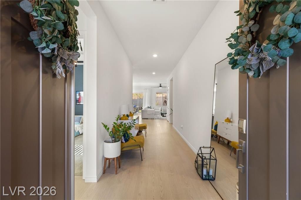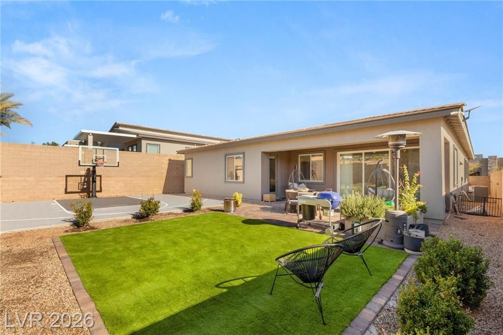Experience elevated desert living in this beautifully upgraded, move-in ready single-story home in the gated community of Reverie in Lake Las Vegas. Designed with both style and function in mind, the home offers 4 bedrooms and 3 bathrooms, including a private Next Gen suite with its own entrance, kitchenette, washer/dryer, and living space, ideal for guests or flexible living. Abundant natural light fills the home, enhancing the open layout and main living areas. The kitchen features a large island, quartz countertops, ample cabinetry, and flows into the dining and living spaces. Sliding glass doors open to a finished backyard with pavers, low-maintenance turf, a covered patio, and no rear neighbors. Life in Lake Las Vegas offers a resort-style setting with access to a clubhouse, fitness center, golf, pools and spa, tennis and pickleball courts, jogging paths, and an active social calendar. Comfort, design, and lifestyle come together in one of Henderson’s most desirable communities.