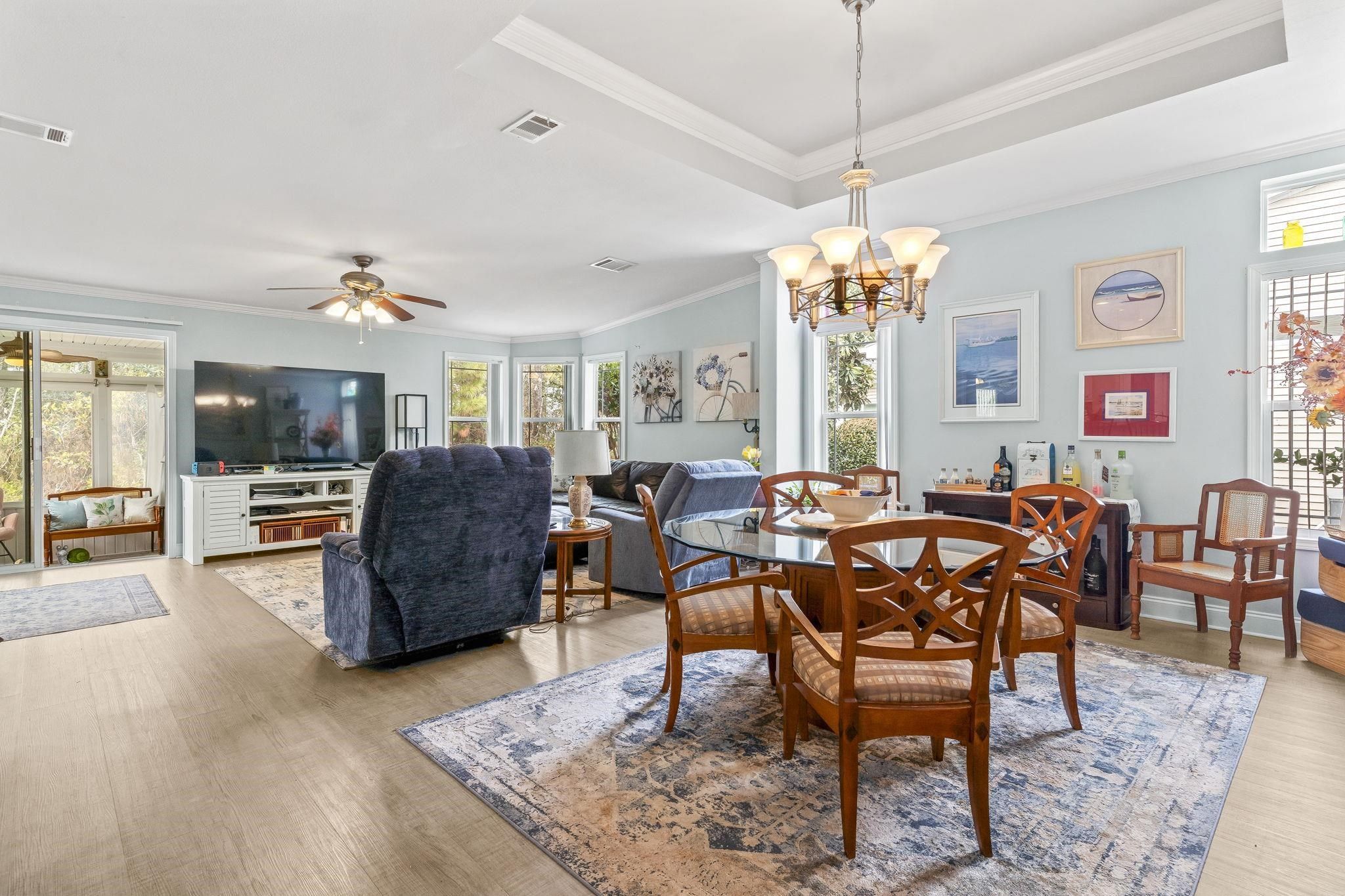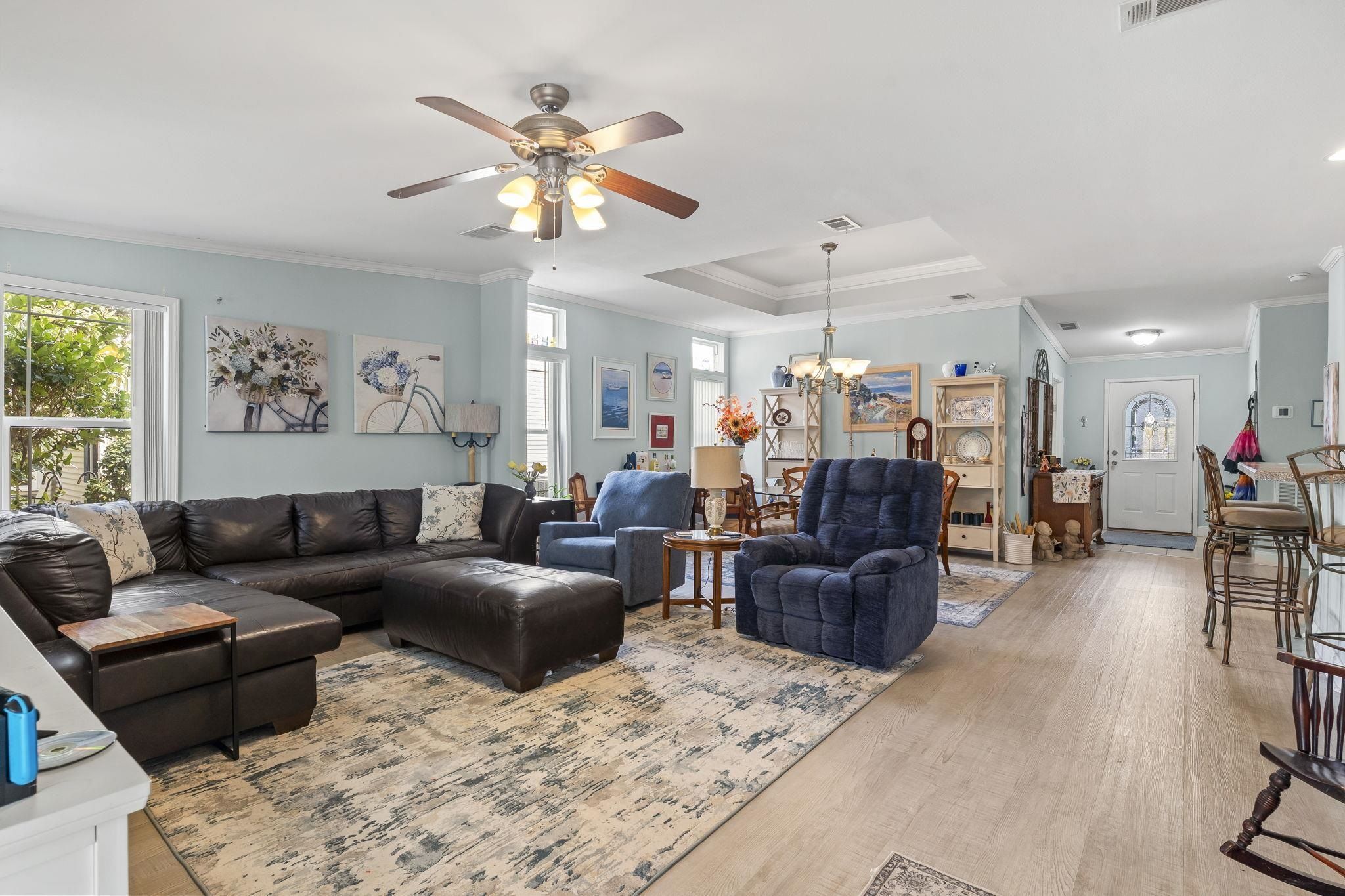 Welcome to this beautifully maintained 3-bedroom, 2-bath double-wide manufactured home in the gated Lakeside Crossing 55+ community! This Palm Harbor Aberdeen model offers 1780 sq ft of comfortable living space, combining quality craftsmanship with an open, functional layout. A charming covered front porch and lush landscaping create inviting curb appeal. Step inside to a versatile floor plan featuring a welcoming entry and a flexible bedroom/office with built-in work areas. The heart of the home is the spacious kitchen with abundant cabinetry, a center island, breakfast bar, stainless steel appliances, and a walk-in pantry, perfect for everyday living and entertaining. The dining area flows seamlessly into the generous living room with built-in bookshelves and access to the Carolina room for extra relaxation space. The primary suite is a peaceful retreat with ample storage and a luxurious en-suite bath with double sinks, a garden tub, and a walk-in shower. Attached 2-car garage adds convenience and extra storage. Enjoy resort-style amenities including indoor and outdoor pools, fitness center, clubhouse, tennis and pickleball courts, social activities, and more. Ideal for active adult living. Don't miss your chance to call this exceptional property home!