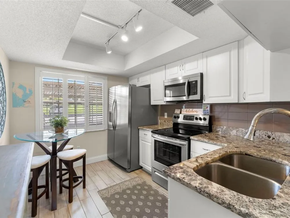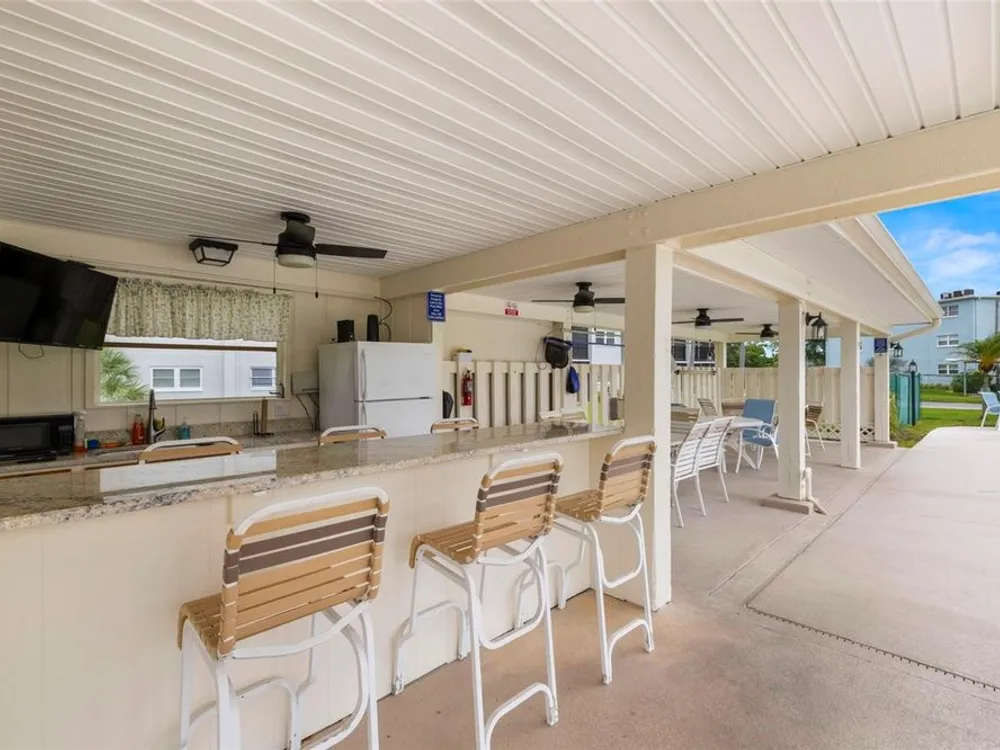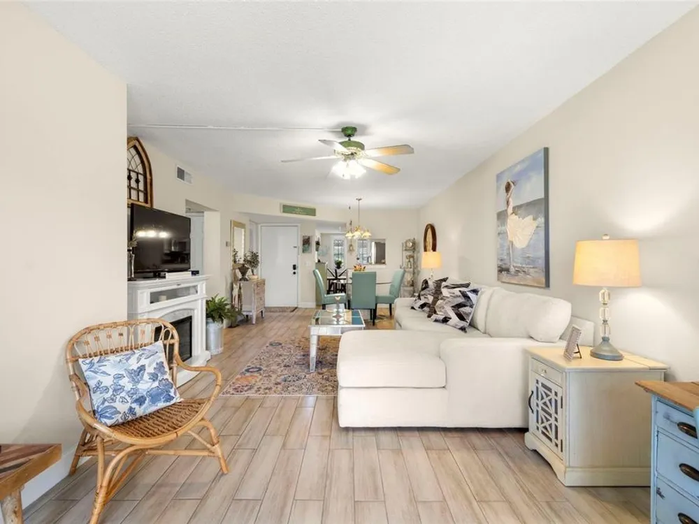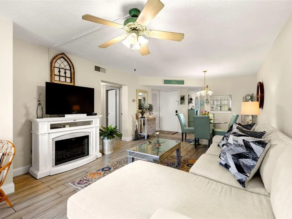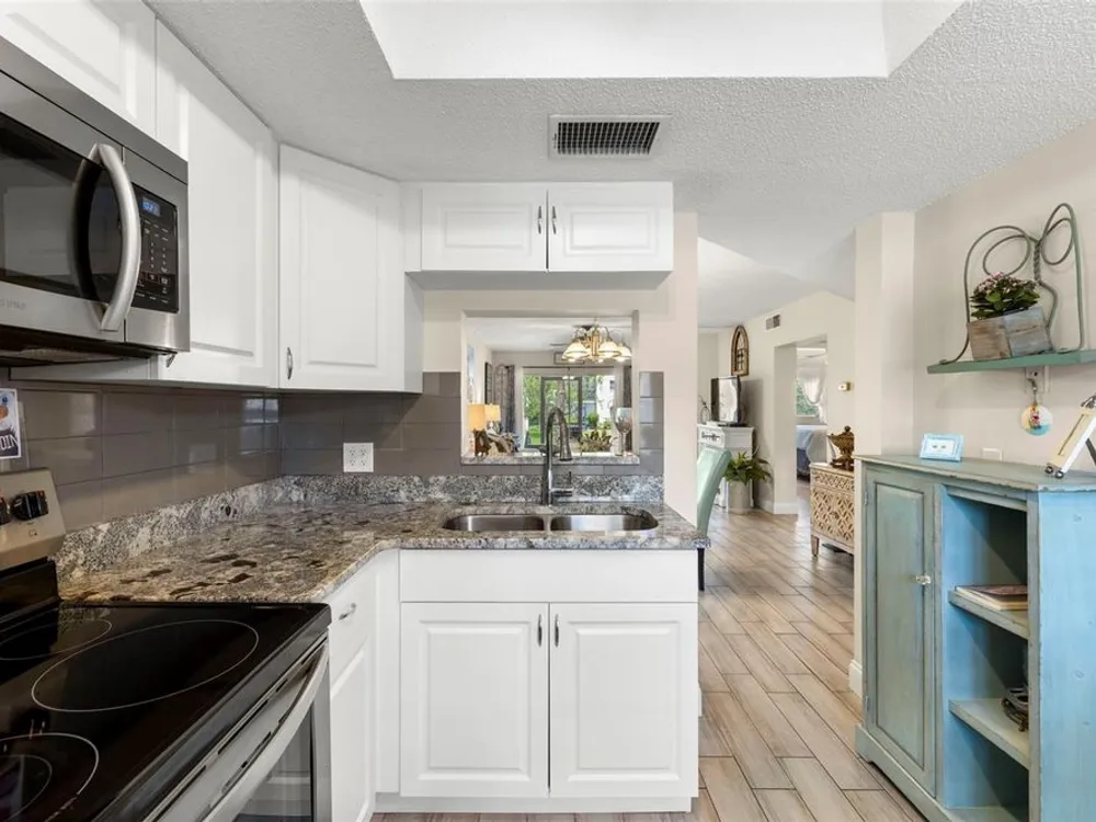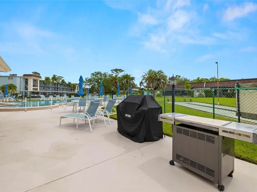 Welcome to easy living in the highly desirable 55+ community of Heather Ridge, located in the heart of Dunedin. This ground-floor condo offers a bright and welcoming retreat with stylish updates all tucked within a non-flood zone (X), meaning no flood insurance is required. As you arrive, enjoy the convenience of a covered parking space just steps from your front door. Inside, an open-concept design welcomes you with ceramic wood-look tile flooring that flows throughout the space. The light and airy kitchen features granite countertops, a double stainless steel undermount sink, and stainless steel appliances replaced in 2019. Plantation shutters add a charming touch, while the pass-through window connects the kitchen seamlessly to the dining and living areas. The spacious bedroom offers two large closets and easy access to an updated bathroom with a walk-in tiled shower and granite-topped vanity. Sliding doors from the living room lead out to a screened-in patio, perfect for enjoying your morning coffee or relaxing with a good book in the evening. Heather Ridge residents enjoy a vibrant, amenity-rich lifestyle with a heated pool, outdoor kitchen, shuffleboard courts, and a covered picnic area—all just a short stroll from your unit. Monthly HOA fees include cable, water, sewer, trash, building insurance, exterior maintenance, and lawn care. Roof replacements are built into the HOA budget for added peace of mind—both the flat roof (2014) and mansard roof (2021) are under 20-year warranties. And the location? Truly unbeatable. Just minutes from historic downtown Dunedin, you'll have access to charming boutiques, nostalgic ice cream shops, award-winning breweries, local restaurants, and a year-round calendar of art festivals, concerts, and parades. Hop on the Pinellas Trail or catch sunset views at Honeymoon and Caladesi Islands. You’re also conveniently close to Clearwater Beach, shopping malls, movie theaters, and both Tampa and St. Pete–Clearwater airports. This move-in-ready condo is more than just a place to live, it’s a lifestyle filled with charm and a connection to everything that makes Dunedin one of Florida’s most treasured coastal towns