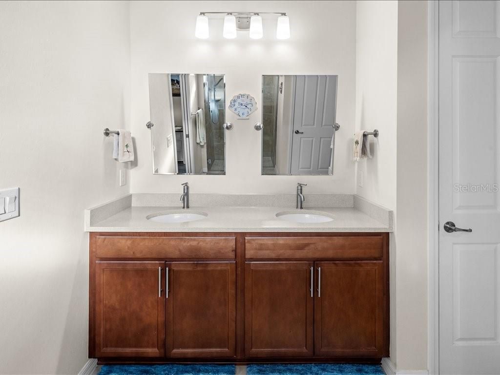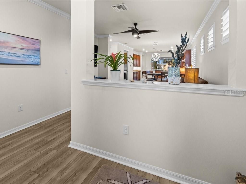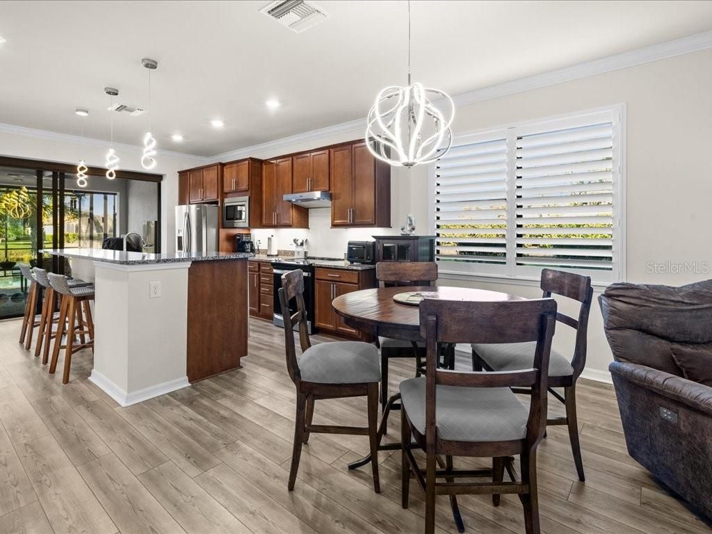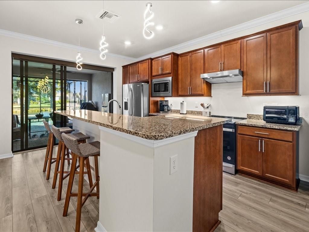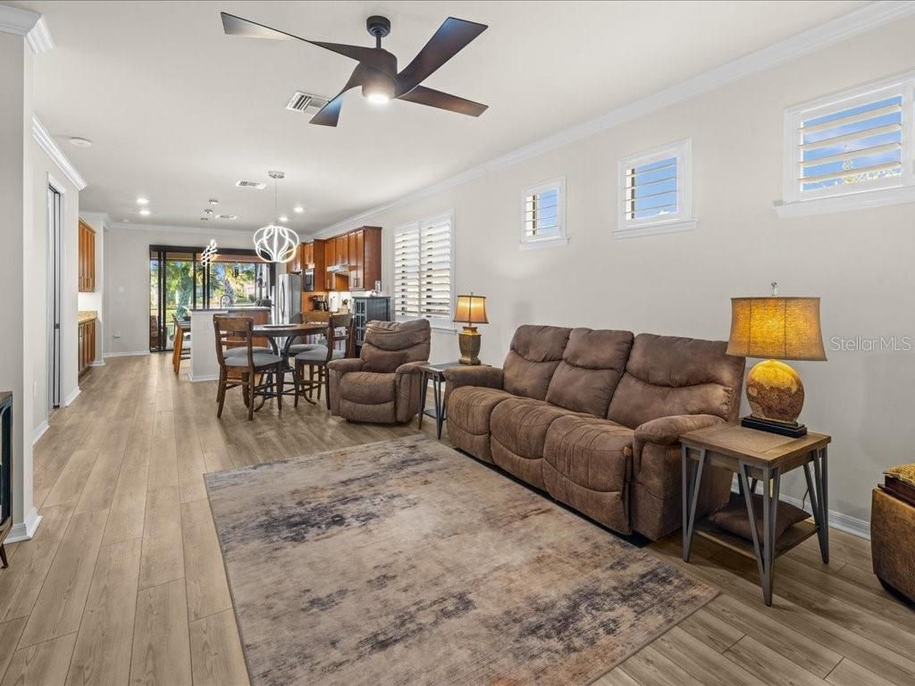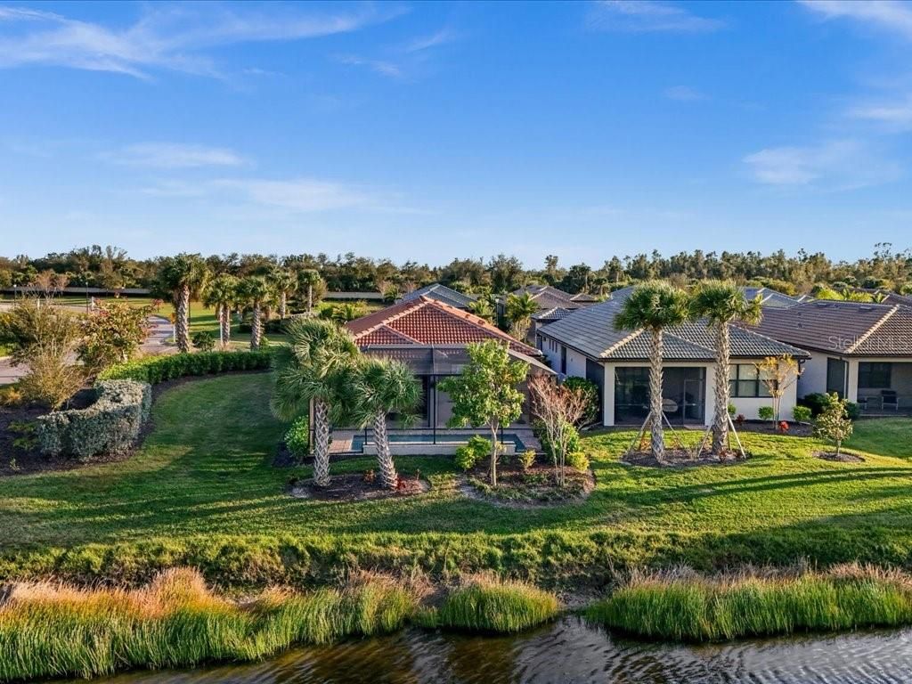 Live the Florida lifestyle you’ve been dreaming of in this beautifully appointed 3-bedroom, 2-bath home situated on a corner lot located in the highly desirable IslandWalk at the West Villages in Venice. From the moment you step through the decorative glass front door, your eyes are drawn through the open living space to the sliding glass doors and out to the heated saltwater pool overlooking a tranquil lake—the perfect setting for morning coffee, sunset swims, or entertaining friends. The pool boast of a built up wall, waterfall and the upgraded lighting. It has been plumbed for an outdoor kitchen. Electric rolling Impact Ultra Shield Screens and hand override were installed on the lanai. Clear guard storm panels for all windows. The thoughtfully designed kitchen blends style and function with granite countertops, upgraded cabinetry, stainless steel appliances, under-cabinet lighting, a raised dishwasher, pull-out cabinet trays, and a built-in trash bin. The primary suite is a private retreat featuring a custom walk-in closet, spa-like bath with double vanity, private water closet, and a walk-in shower with a rain showerhead. Two guest bedrooms and a well-appointed guest bath provide comfort and privacy for family or visitors. Additional highlights include a laundry room with cabinetry, sink, and a convenient pass-through laundry chute, crown molding and plantation shutters throughout, smart-home wiring, and a digital front door lock. The recently epoxied two-car garage includes upgraded shelving for ample storage. Enjoy resort-style living in a peaceful lakefront setting—this home truly has it all. IslandWalk Amenities: Gated, resort-style community with clubhouse, lagoon & lap pools, spa, fitness center, pickleball & tennis courts, bocce, walking/biking trails, dog parks, playground, and year-round social activities. Maintenance-free living with lawn care included and convenient access to Wellen Park
