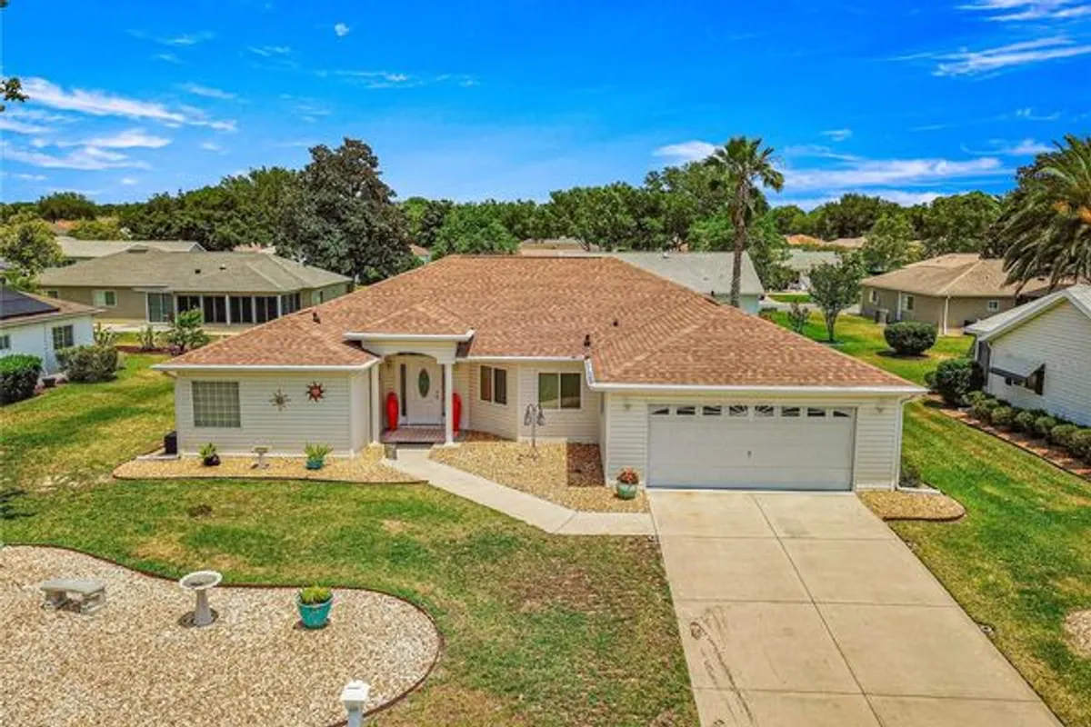 Here is your opportunity to purchase this meticulously maintained 3 bedroom, 2 bath Aspen floor plan in Del Webb Spruce Creek Golf & Country Club, a premier 55 plus community nestled in the heart of Summerfield, Fl. Just a short 10-15 minute drive to The Villages. This Aspen floor plan spans 2,342 sq ft under heat and air. The home exudes curb appeal with its easy to maintain vinyl siding, leaded glass entry door, and completely refreshed landscape. As you step inside, you will discover the heart of the home is an expansive open floor plan with both a formal living and dinning room, as well as a great room which is open to the kitchen and great for entertaining. The kitchen is ideal for hosting gathering with its bright white cabinets, and well-placed solar tube, enhancing the airy ambiance. The primary suite is a sanctuary, featuring an en-suite with double closets, a generous soaking tub, and updated walk in shower with direct access to the heated and cooled Lanai. Updates include some newer windows, full leaf guard gutter system, roof re-shingled in 2014, HVAC (2013), new stainless steel microwave, and refrigerator, and newer warm carpeting in the bedrooms. Both guest bedrooms are of ample size to allow privacy for guests. The vaulted ceilings amplify the sense of space throughout the main living area, while the split floor plan ensures privacy. The highlight of outdoor living is the enclosed, heated, and cooled lania with access from both the great room, and primary suite, providing the perfect setting for year round enjoyment.