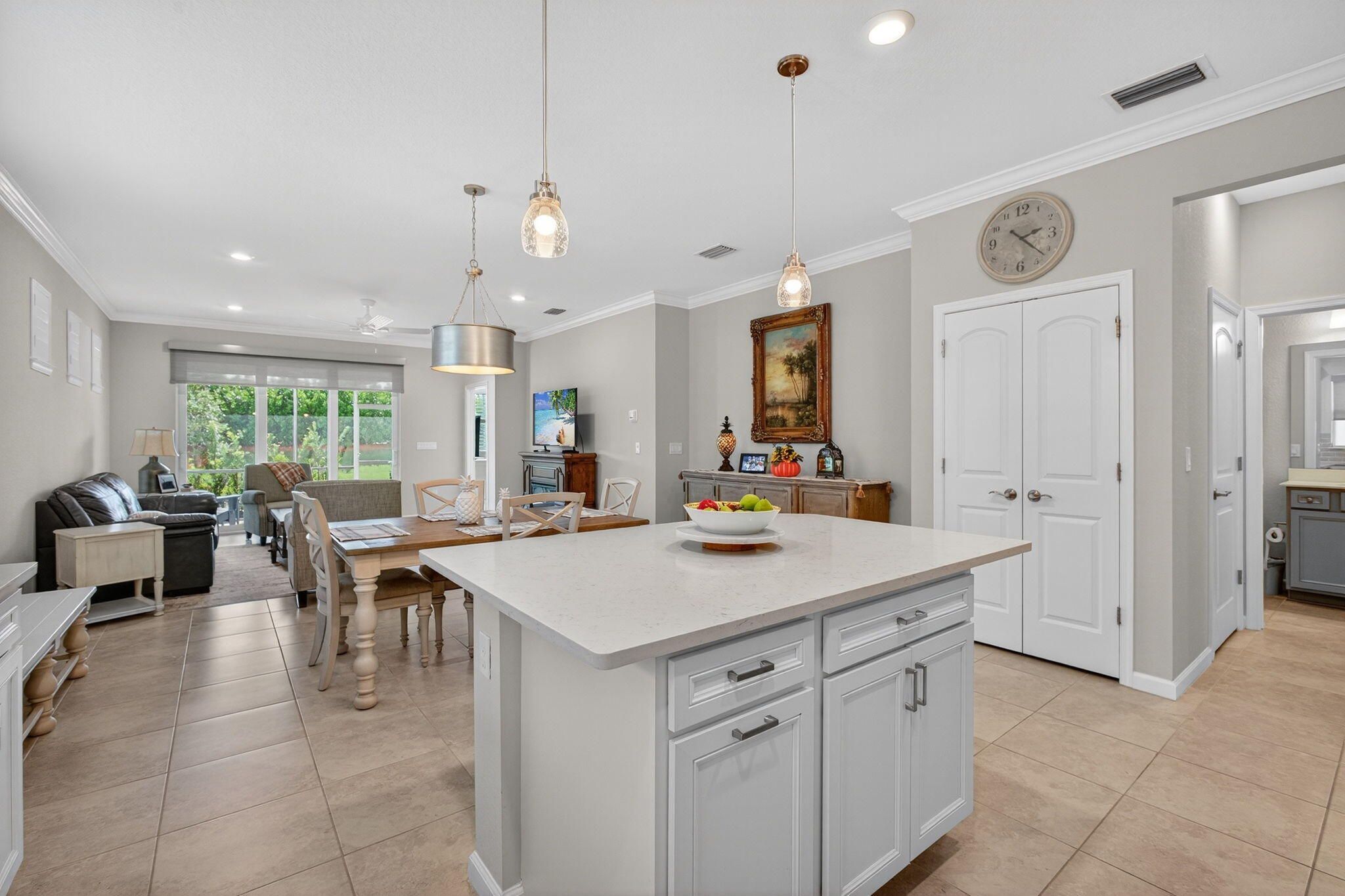 Move-in ready villa in Del Webb at Tradition! This upgraded 2-bedroom plus flex room home offers open-concept living with impact glass, a whole-house water filtration system, tankless water heater, plantation shutters, motorized shade, and custom closets with drop zone. The kitchen features Whirlpool stainless steel appliances, gas range, tiled backsplash, and ample storage. Enjoy both screened front and rear patios for relaxed Florida living. Del Webb at Tradition offers resort-style amenities including pool and spa, pickleball, tennis, bocce, fitness studios, lake trails, social halls, ballroom, game rooms, putting green, lap lanes, and a full lifestyle calendar. Conveniently located near shopping, dining, and medical facilities.