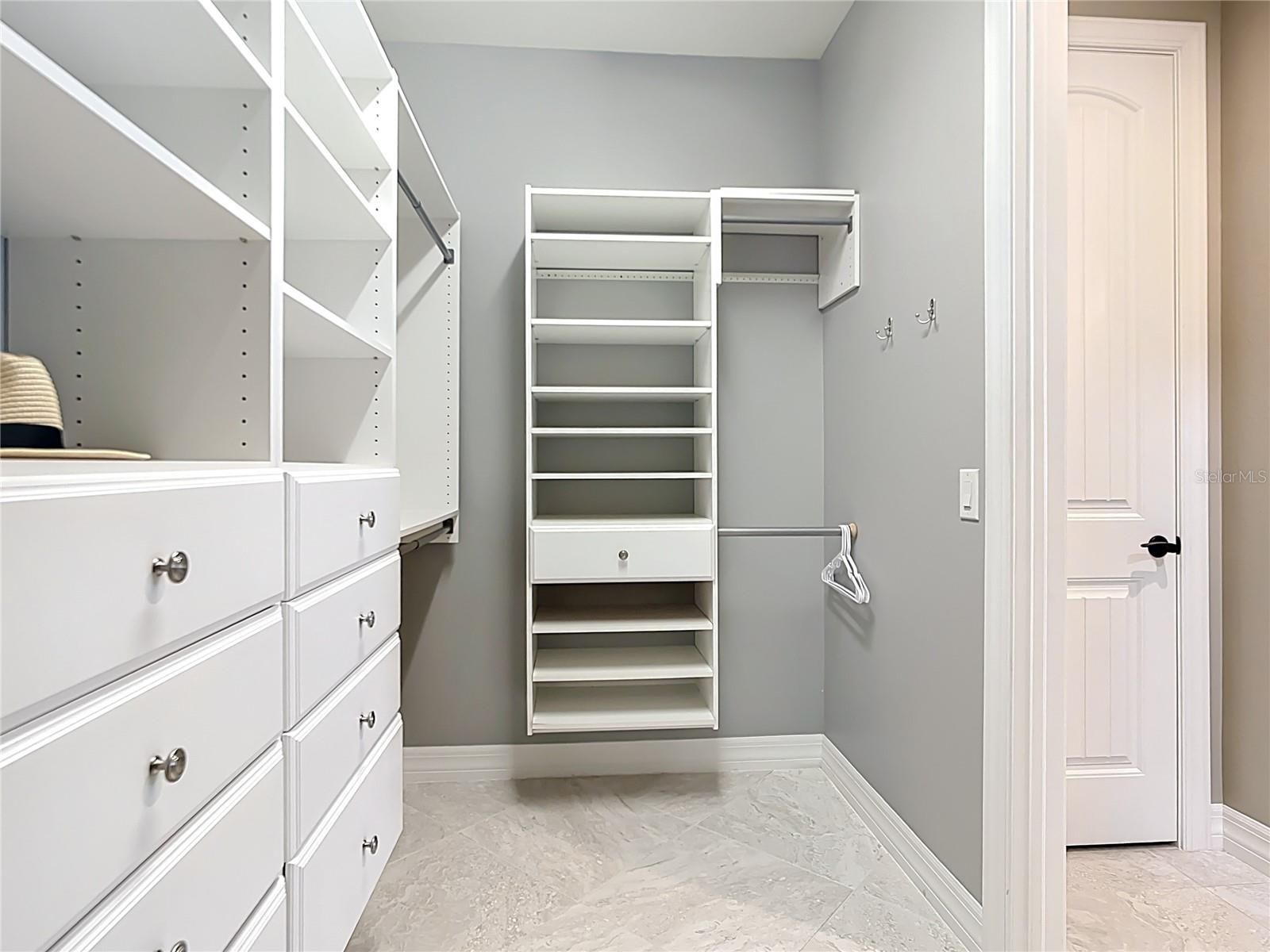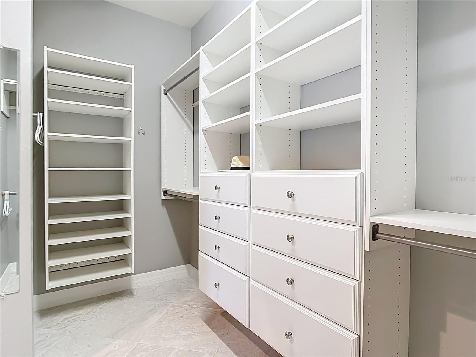 - Built-in Features, Ceiling Fan(s), Coffered Ceiling(s), Crown Molding, High Ceilings, In-Wall Pest Control, Kitchen/Family Room Combo, Open Floorplan, Main Level Primary, Solid Surface Counters, Solid-Wood Cabinets, Split Bedrooms, Stone Counters, Thermostat, Tray Ceiling(s), Walk-In Closet(s), Window Treatments