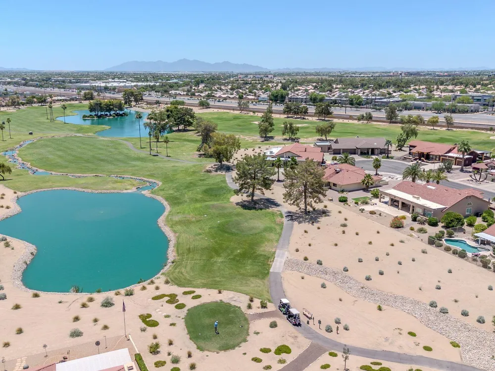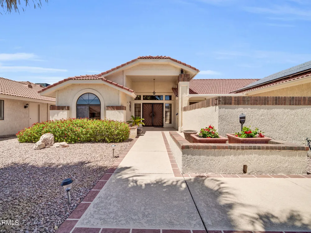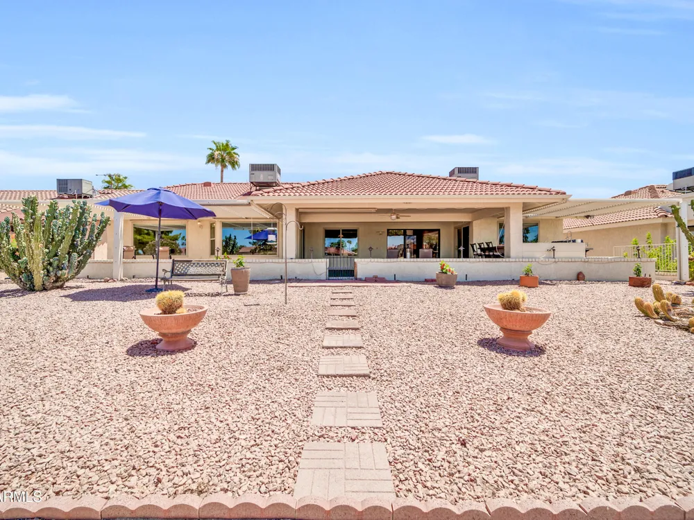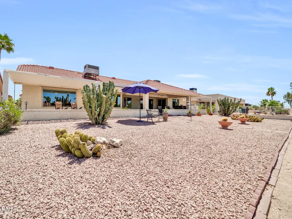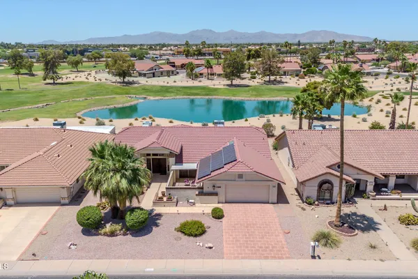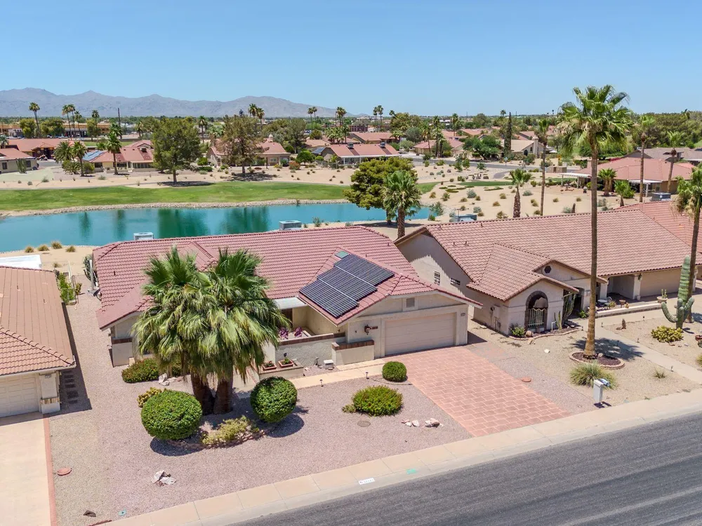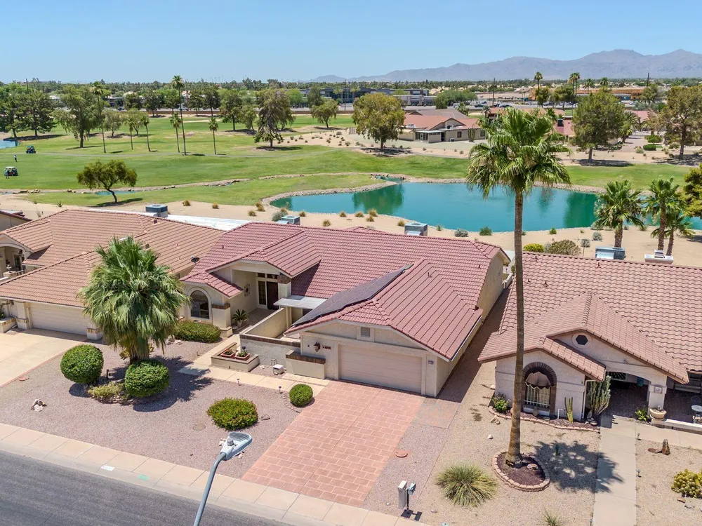 Stunning San Simeon model on a premium golf course lot with mountain views and 2 sparkling water features. The ponds sits between the home and fairway, with the cart path on the far side for added privacy. Enjoy views from the LR, DR, kitchen, breakfast area, FR, guest BR, and extended covered patio. Interior highlights include newer tile flooring with a Southwestern motif, luxurious carpet, granite kitchen counters, coordinating backsplash, and undermount sink. Vaulted ceilings in LR/DR, built-ins in FR, and an elegant master suite with private courtyard. Entertainer's dream patio with built-in BBQ island. Paid solar, curb appeal, and a fantastic location—watch them tee off across the lake, 13th tees of Grandview. Very Special Lot