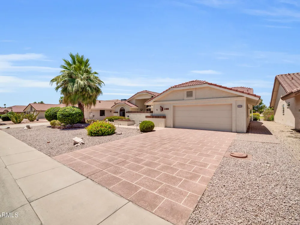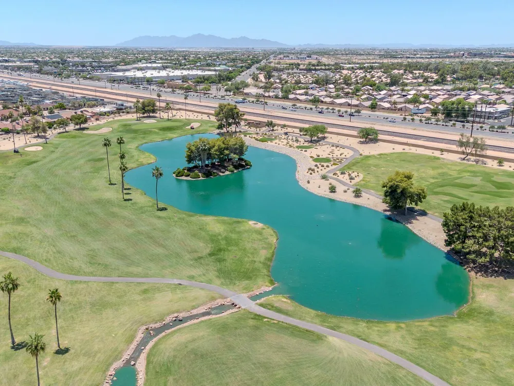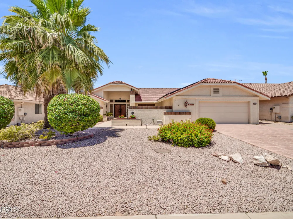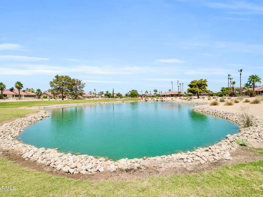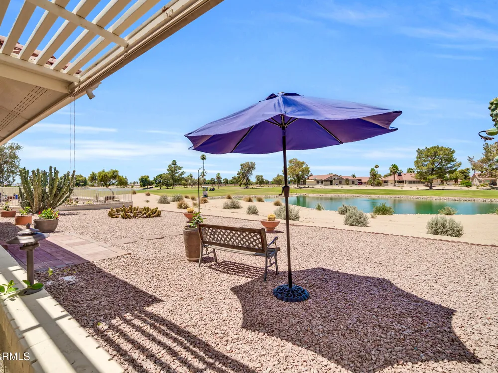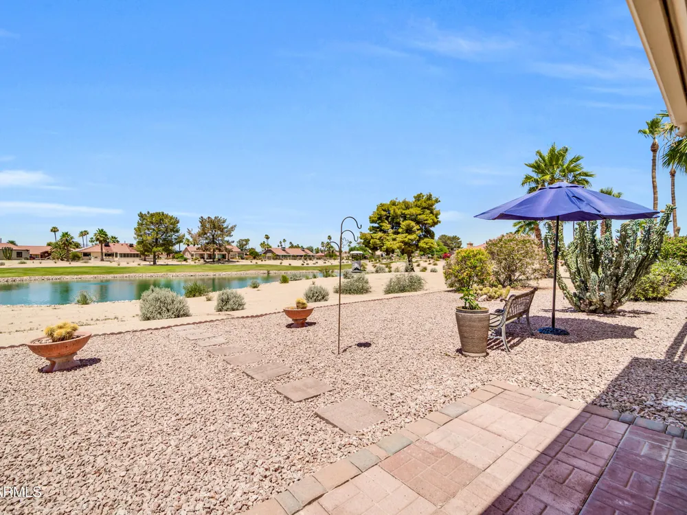 Stunning San Simeon model on a premium golf course lot with mountain views and 2 sparkling water features. The ponds sits between the home and fairway, with the cart path on the far side for added privacy. Enjoy views from the LR, DR, kitchen, breakfast area, FR, guest BR, and extended covered patio. Interior highlights include newer tile flooring with a Southwestern motif, luxurious carpet, granite kitchen counters, coordinating backsplash, and undermount sink. Vaulted ceilings in LR/DR, built-ins in FR, and an elegant master suite with private courtyard. Entertainer's dream patio with built-in BBQ island. Paid solar, curb appeal, and a fantastic location—watch them tee off across the lake, 13th tees of Grandview. Very Special Lot