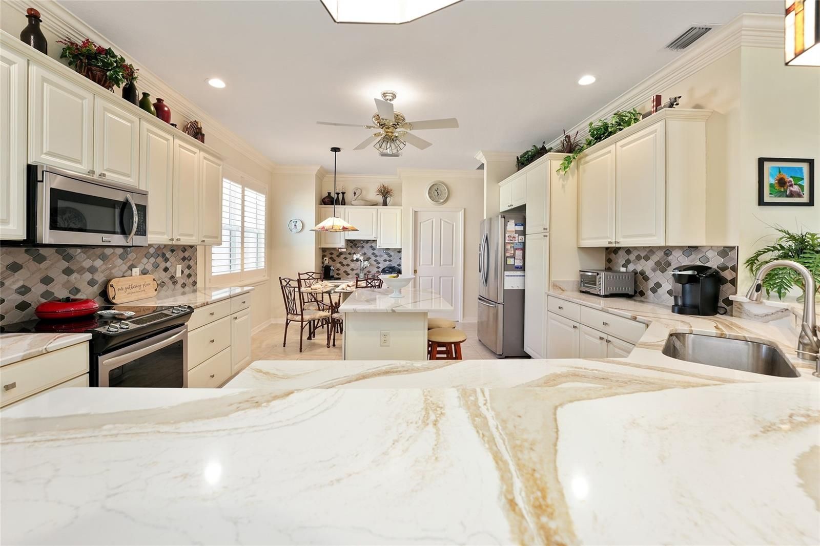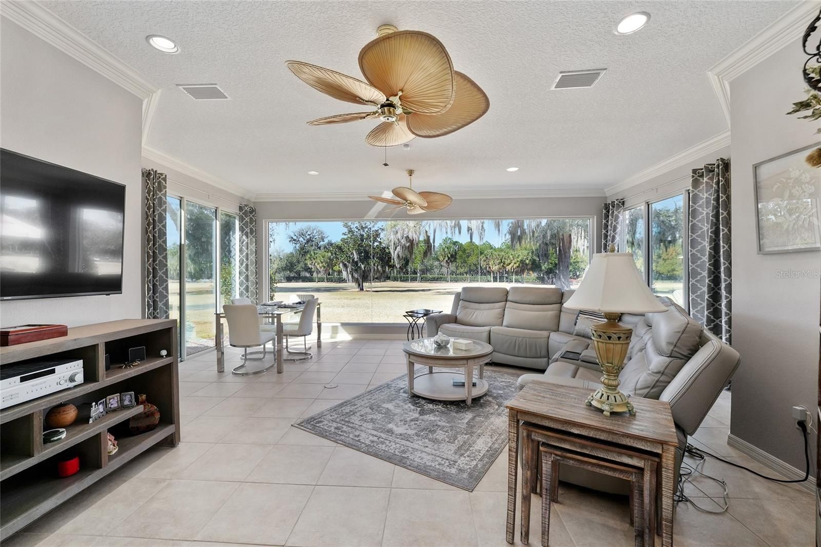 Prime Golf Course Frontage Living in the VILLAGE OF VIRGINIA TRACE! Nestled in the highly desirable Village of Virginia Trace, this exceptional GOLF COURSE FRONTAGE (MALLORY'S CHAMPIONSHIP COURSE (VIRGINIA with no golf cart path in your back yard)) home offers the perfect blend of location, lifestyle, and luxury. Just a short walk, bike ride, or golf cart trip brings you to Lake Sumter Landing, widely regarded as the most popular of The Villages’ town squares, where dining, shopping, movies, and nightly live entertainment are always close at hand. Virginia Trace is surrounded by the scenic Mallory Hill Golf Course, creating a peaceful and picturesque setting while still being centrally located. The nearby Canal Street Recreation Center makes hosting visiting family effortless. This is carefree Villages living at its best. Offering OVER 2,500 SQUARE FEET, this 3-bedroom, 2.5-bath designer BRIDGEPORT model is thoughtfully designed and extensively upgraded. The interior features TILE FLOORING throughout the main living areas, LAMINATE FLOORING in the bedrooms, CROWN MOLDING throughout, NO POPCORN CEILINGS, and UV WINDOW TINTING for enhanced comfort and efficiency. PLANTATION SHUTTERS add a refined touch to the kitchen window, office window, and guest bedroom window. The kitchen is truly a standout, featuring CAMBRIA QUARTZ countertops, an upgraded backsplash, kitchen ISLAND, built-in DESK, and exceptional storage with TOP-AND-BOTTOM PULL-OUT SHELVING (even the pantry)—beautifully designed for both everyday living and entertaining. The primary suite provides a private retreat with a WALK-IN CLOSET and a spa-like ensuite bath highlighted by a ROMAN SHOWER. All three bathrooms have been upgraded with NEW SINKS AND FAUCETS, creating a cohesive and polished look throughout the home. One of the most remarkable features of this property is the 448 sq. ft. GLASSED-IN LANAI, designed with EXPANSIVE PICTURE AQUARIUM-LIKE GLASS that fills the space with natural light and stunning views (exterior remote shade for privacy) —you truly won’t want to leave this room. A dedicated MINI-SPLIT SYSTEM (2022) allows for year-round enjoyment, while STACKING SLIDERS open to an architectural design concrete patio,and a HOT TUB under a BIRDCAGE, ideal for relaxing or entertaining outdoors. Both the main garage and GOLF CART GARAGE feature epoxy coated floors, pull-down ATTIC STAIRS, and ample storage space. The ELECTRIC GARAGE SCREEN is conveniently located on the main garage. Additional thoughtful details include a stunning front door, RETRACTABLE SCREEN at front door, a retractable screen door from the garage to the laundry room, a POCKET DOOR from the kitchen into the laundry room, SOLAR TUBES, and SOLAR ATTIC FAN. Major updates provide peace of mind, including a NEW ROOF (2024), HVAC (2022), LANAI MINI-SPLIT system (2022). Outside, the home is framed by a beautifully manicured lawn, decorative ROCK BEDS, and CONCRETE CURBING that enhance its curb appeal. With its unbeatable proximity to Lake Sumter Landing, golf course setting, and unforgettable AQUARIUM-LIKE GLASS lanai, this home offers a rare opportunity to enjoy the very best of Villages living in one of its most sought-after neighborhoods.