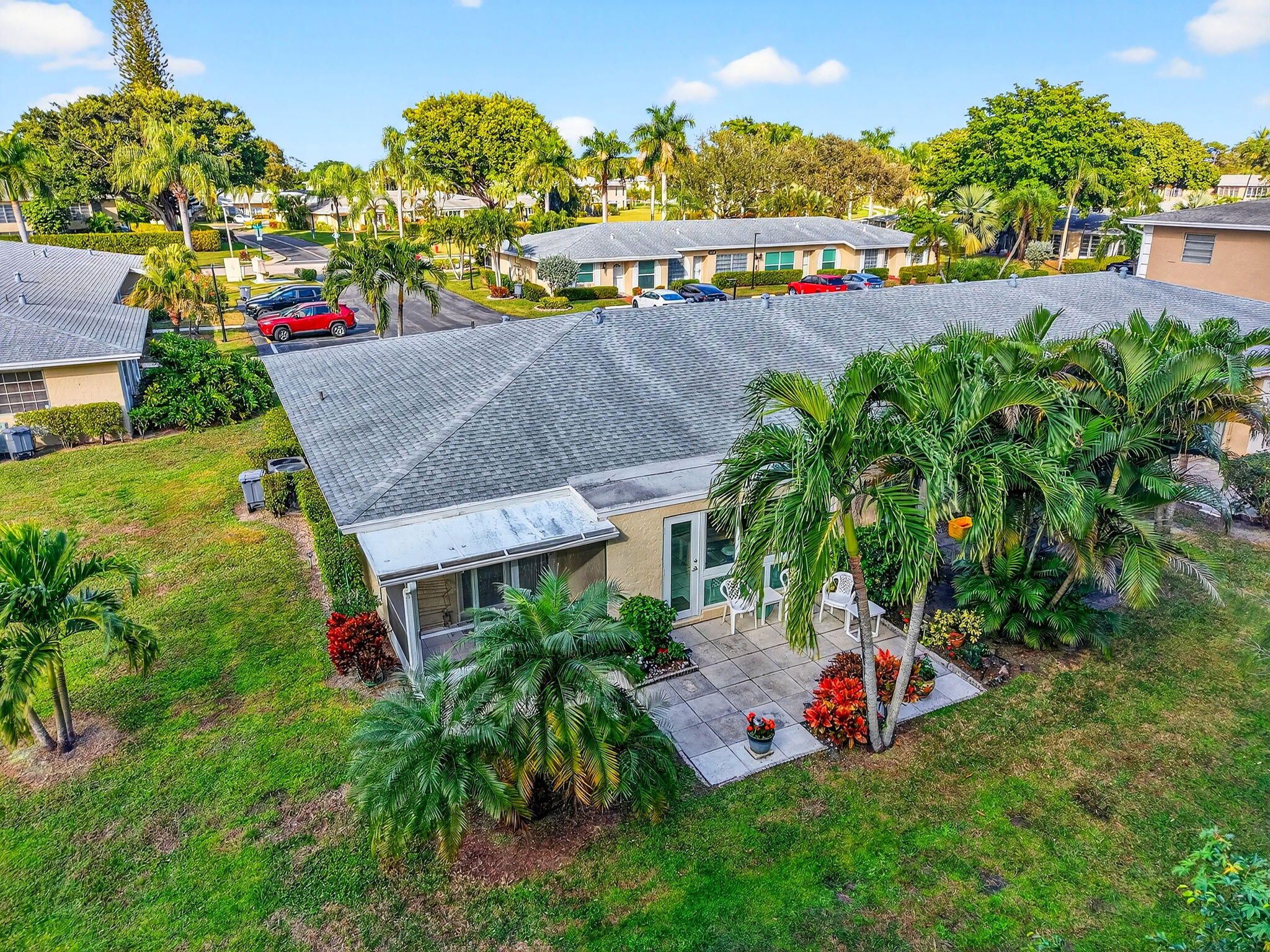 Light and bright, and beautifully updated entry-level living villa in Delray Beach. This meticulous villa features a renovated eat-in kitchen with an open-concept layout, granite countertops, solid wood cabinetry, and a central island—perfect for everyday living and easy entertaining. The home is tiled throughout and filled with natural light, enhanced by hurricane impact windows, recessed lighting, and new fixtures and fans throughout. Both bathrooms have been completely renovated; the primary bath offers a seated vanity and walk-in closet, while the guest bath features a flush-entry, no-step shower for ease and accessibility. Step outside to a quiet, peaceful backyard with an organic feel and generous space between neighboring villas. Open patio with additional screened lanai.