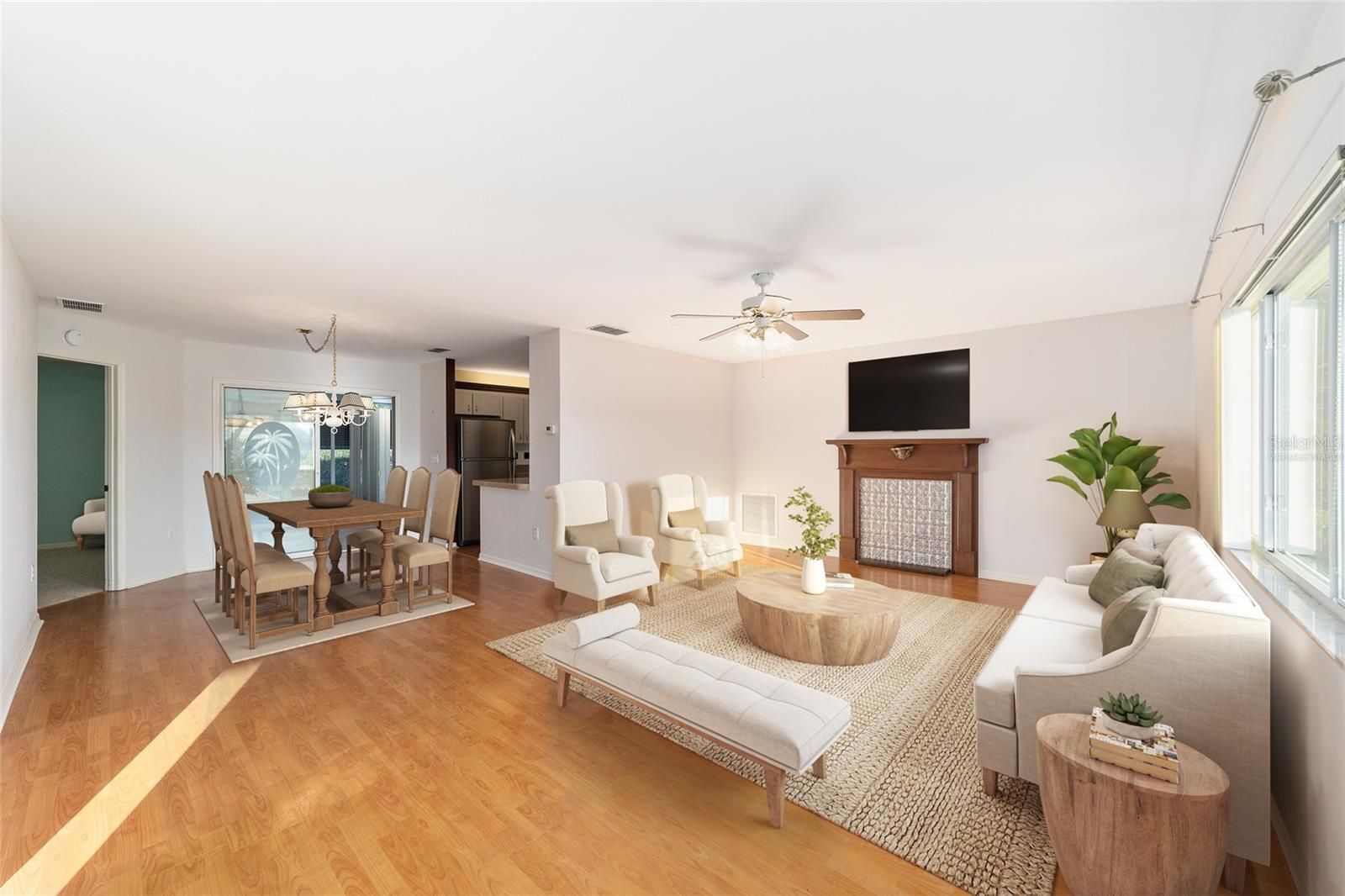 One or more photo(s) has been virtually staged. This charming 2-bedroom, 2-bath Juniper model is vacant and ready for its new owners! With a desirable split-bedroom layout and thoughtful updates, this home offers comfort, functionality, and great value. Laminate flooring flows through the main living areas, including the spacious living room, dining room, and kitchen, while both bedrooms feature comfortable carpeting. The galley-style kitchen is equipped with newer stainless-steel appliances, Corian countertops, and a tiled backsplash, providing both style and practicality. Enjoy year-round relaxation in the climate-controlled Florida room, which opens to a generous 10x18 birdcage—perfect for outdoor living, grilling, and embracing the Florida lifestyle. Both bathrooms feature tile flooring, and the primary bath includes an updated shower. The extended 25-foot garage houses the laundry area and offers convenient pull-down attic stairs for additional storage. Major updates include a new roof in 2014 and HVAC replaced in 2013, offering peace of mind for years to come. Offered at a great price, this is the perfect opportunity to own a well-maintained home that’s move-in ready. See it today! ALL ROOMS SHOWING FURNITURE, PLEASE NOTE, THE FURNITURE IS VIRTUAL