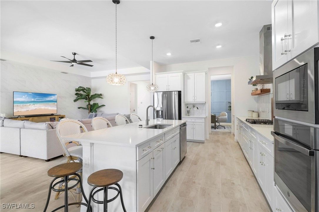 Welcome to 13761 Blue Bay Cir in the resort-style, lakefront community of WildBlue! This stunning residence features four bedrooms plus a den, three full bathrooms, and 2,724sqft of living space, offering ample space for comfortable living, entertaining, and hosting guests. As you step inside, you'll be greeted by a bright and open floor plan that combines both style and functionality. The generous living areas are perfect for gathering with family and friends, while the large windows allow natural light to flow throughout, enhancing the welcoming atmosphere. Porcelain plank tile floors adorn all living areas, and custom shiplap, feature walls, and trim work has been added throughout the home to create a luxurious coastal feel. The heart of the home is the bright island kitchen, crafted for those who love to cook and entertain. Here you'll find shaker-style soft-close cabinetry, quartz countertops, custom backsplash, stainless steel appliances, natural gas cooktop, coffee bar, and a walk-in pantry, complete with a wide-open flow into the dining area and great room. Outside, the home provides a private oasis complete with an upgraded travertine deck, heated pool and spa, large covered lanai, and a fully-equipped natural gas outdoor kitchen; perfect for seamless indoor/outdoor living, and backdropped by sunrise views over a protected natural preserve. WildBlue's amenity peninsula provides panoramic views of the 435-acre WildBlue Lake, featuring a resort-style pool, separate lap pool, sandy lakeside beach, fitness center with studios, locker rooms with saunas, spa, a full-service restaurant and bar, poolside bar and grill, tennis and pickleball courts, a pro shop, basketball, boat ramps to over 800 acres of freshwater lakes, boat slip rentals, kayak storage, and more. Don't miss the opportunity to make 13761 Blue Bay Cir your new address, schedule your private showing today.