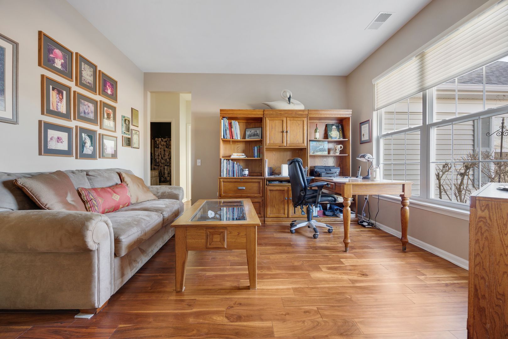 Spacious Grant model with an Extended Garage on a Premium Lot backing to trees and small creek!! Numerous updates/upgrades include; Acacia Hardwood Floors throughout most of the home ~ Ceramic in Kitchen and Bathrooms (NO Carpet) ~ White Paneled Doors & Trim ~ Surround Sound System ~ Silhouette Window Treatments ~ Huge Kitchen with Oversized Island, 42" Cabinets with Crown Molding, Cambria Counters, Ceramic Backsplash, Built-In Oven and Custom 250+ Bottle Wine Refrigerator ~ Primary Bedroom with Bay Windows and Double Walk-In Closets ~ Private Bath with Dual Raised Vanity, Garden Tub & Separate Shower ~ Second Bedroom with Walk-In Closets ~ Good Size Den/Office ~ Laundry Room with Built-in Counter/Desk & Wall Cabinet/Shelving, Wash Tub and New Washer/Dryer ~ Oversized Paver Brick Patio ~ Pull Down Stairs to Attic Storage in Extended Garage ~ Roof (2013) ~ All this and more in Del Webb Sun City's Active Adult Community