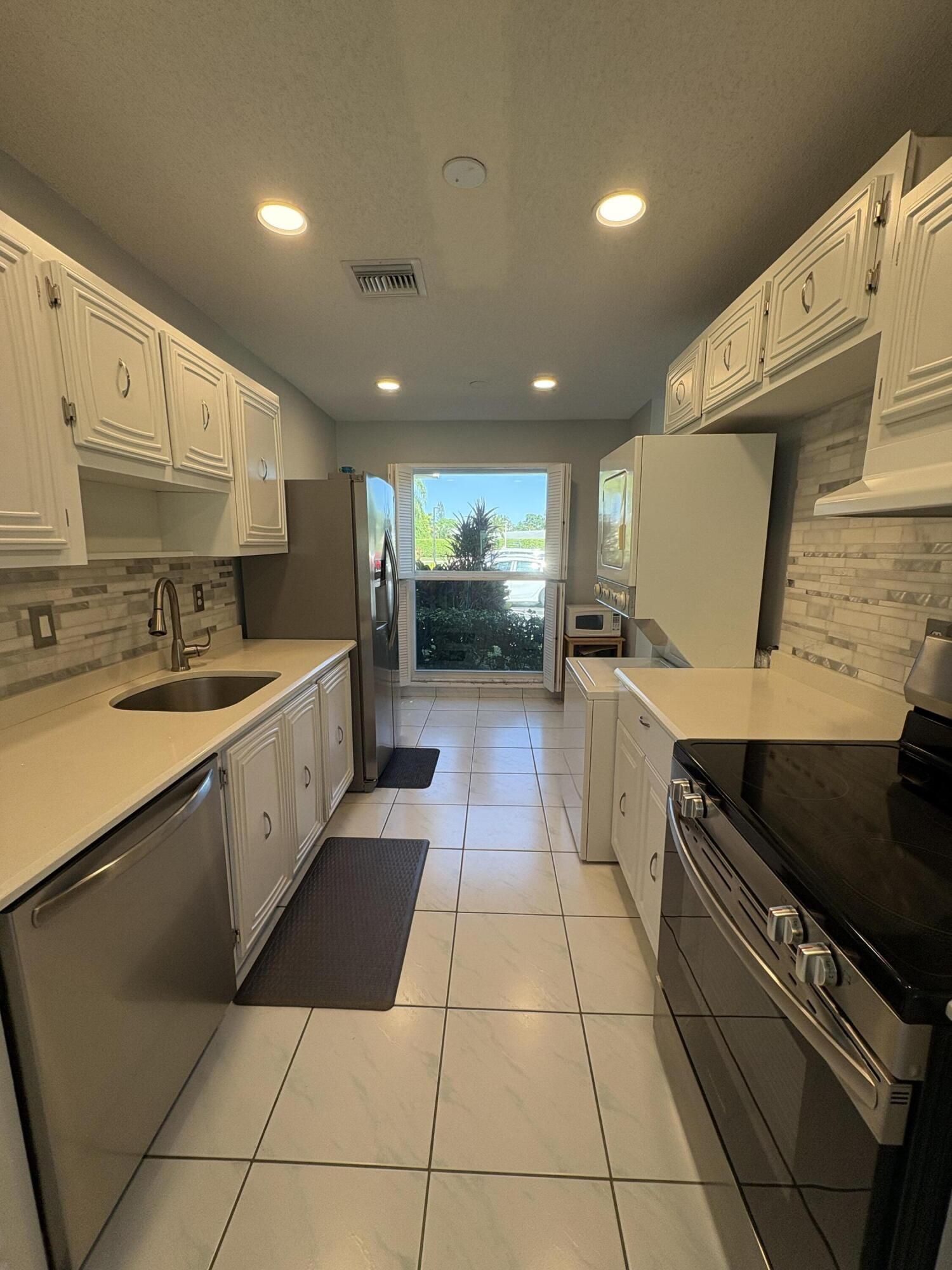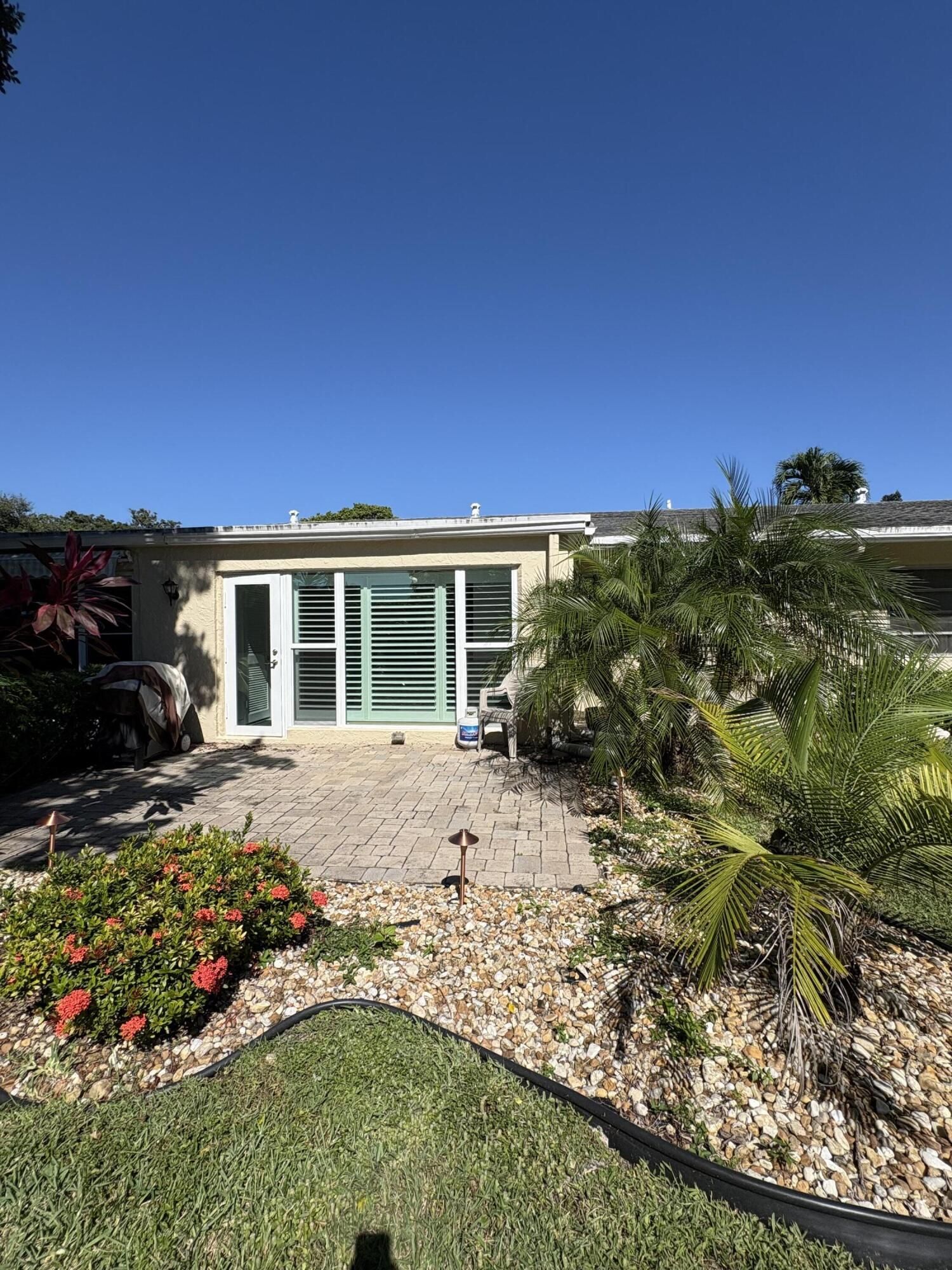 WELCOME TO THIS LIGHT FILLED 1 LEVEL VILLA IN PALM GREENS ADULT COMMUNITY. 2 BEDROOM, SPLIT FLOOR PLAN, 1.5 BATHS. UPDATED KITCHEN, STAINLESS APPLIANCES, QUARTZ COUNTERS. OPEN LIVING ROOM/DINING WITH EXTENDED AREA FOR ENTERTAINING. LOOKS ONTO PROFESSIONALLY LANDSCAPED, LIGHTED PATIO IN PRIVATE BACKYARD. ALL TILE FLOORS, PORCELINE IN BEDROOMS. PRIMARY BEDROOM WITH NEW CUSTOM CABINET, WALK IN CLOSET. GUEST BEDROOM WITH PRIVATE BATHROOM. PLANTATION SHUTTERS ON ALL WINDOWS. SOME IMPACT WINDOWS. FRONT ENTRY IMPACT DOOR. ALL NEWLY PAINTED, METICULOUS, MOVE IN READY. ASSIGNED PARKING IN FRONT PLUS GUEST SPACES. NEW UPSCALE CLUBHOUSE AND POOL AREA SCHEDULED FOR JAN 2026. ENJOY ACTIVE COMMUNITY, TENNIS, PICKLEBALL AND MORE. POPULAR DELRAY LOCATION CLOSE TO HIGHWAYS, BEACH, DOWNTOWN, SHOPPING