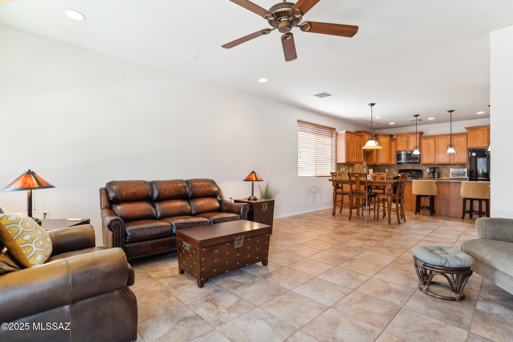 Great Price for this wonderful 2BR+Den/2BA Floorplan in 55+ active adult community of Del Webb at Rancho del Lago located on a quiet street.New compressor for A/C (8/2025).Ceramic Tile everywhere except primary BR.Kitchen w/large breakfast bar,maple cabinets,granite counters,large pantry & cabinet pullouts.Multi purpose rm can be used for exercise or additional TV room.Oversized family rm wired for surround sound.Primary BR w/bay window & 2 walk in closets.Primary bath w/large shower,bench & dual vanities plus makeup area.Guest BR w/murphy bed which allows for craft room/2nd office.Back patio is extended w/pergola ramada,beautiful flagstone & wonderful low care landscaping.Extended garage w/lots of storage.All appliances,furniture & kitchenware included at no extra cost if interested