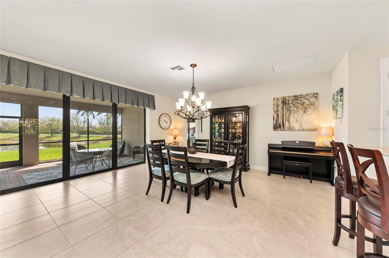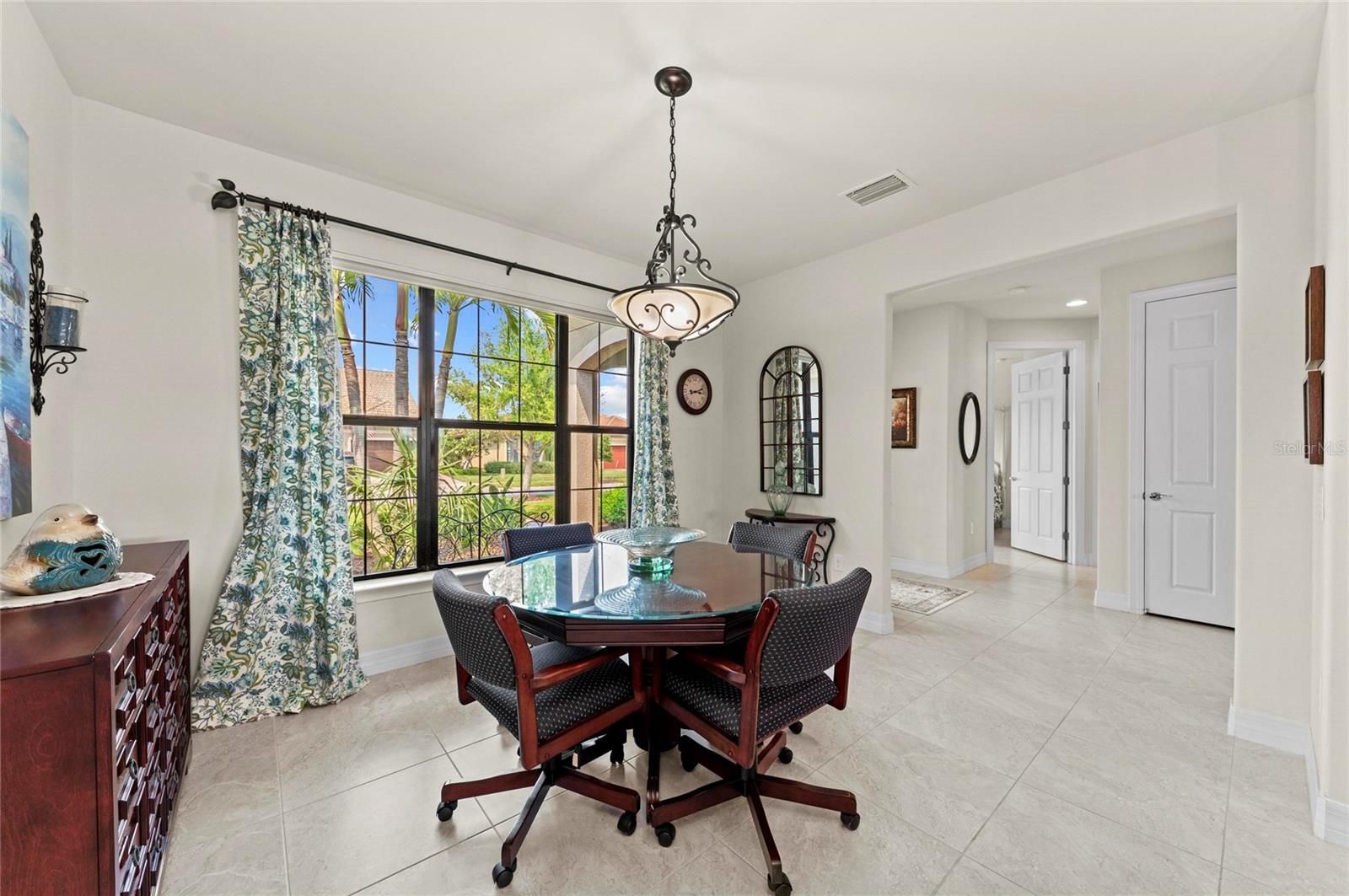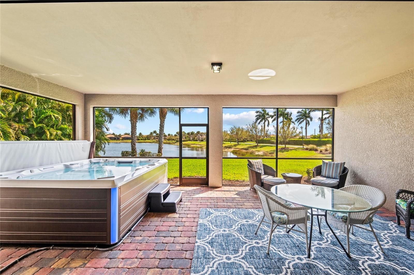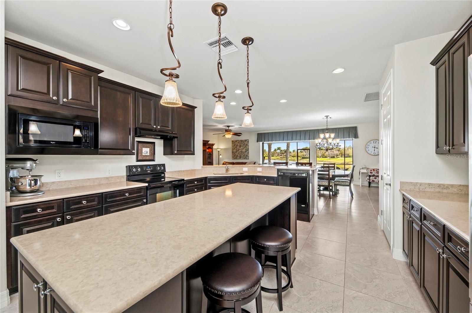 This rare Tangerly Oak model offers an exceptional opportunity to own a thoughtfully upgraded and lightly lived-in home that truly stands apart. With 2,757 square feet of living space - larger than the typical one-story Pinnacle model—this residence delivers both added space and enhanced functionality. Unlike most Pinnacle layouts, this home features four generously sized bedrooms, including a desirable second bedroom with its own private en suite bath and a large walk-in closet, perfect for guests or multi generational living. From the moment you enter, you’ll notice upscale design elements throughout, including 8-foot interior doors, higher baseboards, and tile flooring that flows seamlessly throughout the entire home. The spacious eat-in kitchen is designed for both everyday living and entertaining, offering abundant cabinetry, ample storage, and plenty of room to gather. A true highlight of the home is the one-of-a-kind wall of four sliding glass doors spanning over 15 feet, opening completely to the extended lanai for seamless indoor-outdoor living. The oversized corner lot provides exceptional privacy along with expansive, long water views, all with a sought-after southern exposure that fills the home with natural light—especially during the winter months. Step outside to your own private retreat, featuring a premium Hot Spring Prism seven-person hot tub installed in 2020. Designed for a full-body hydrotherapy experience, it includes 73 jets powered by three pumps, a deeply relaxing lounger seat, a powerful footwell jet, a freshwater salt system, multi color lighting, and a backlit waterfall for added ambiance—all offering luxury without the maintenance of a full pool. Set on an expansive 9,788 square foot executive homesite, the property also benefits from a large berm that enhances privacy and tranquility. Additional features include hurricane impact glass windows and doors throughout, including the quadruple sliders, a four-foot extended garage, and a large laundry room with plenty of space for storage and functionality. Lovingly maintained by its original owners and used only seasonally for approximately two months per year, this home has never been rented and remains in exceptional condition. Ideally located just a short walk from the impressive 14,000 square foot Resort Center, 11,000 square foot Event Center, multiple pools, and an array of world-class amenities, this home offers the perfect blend of luxury, comfort, and convenience.
