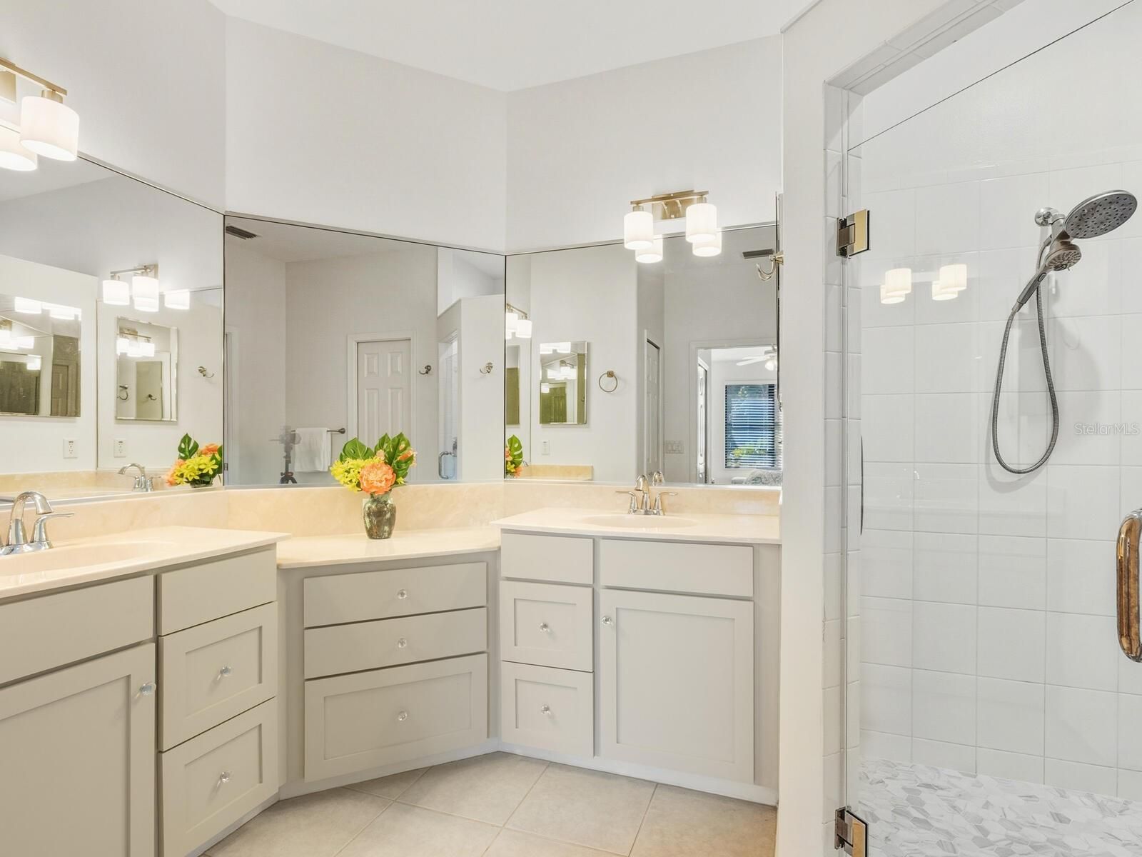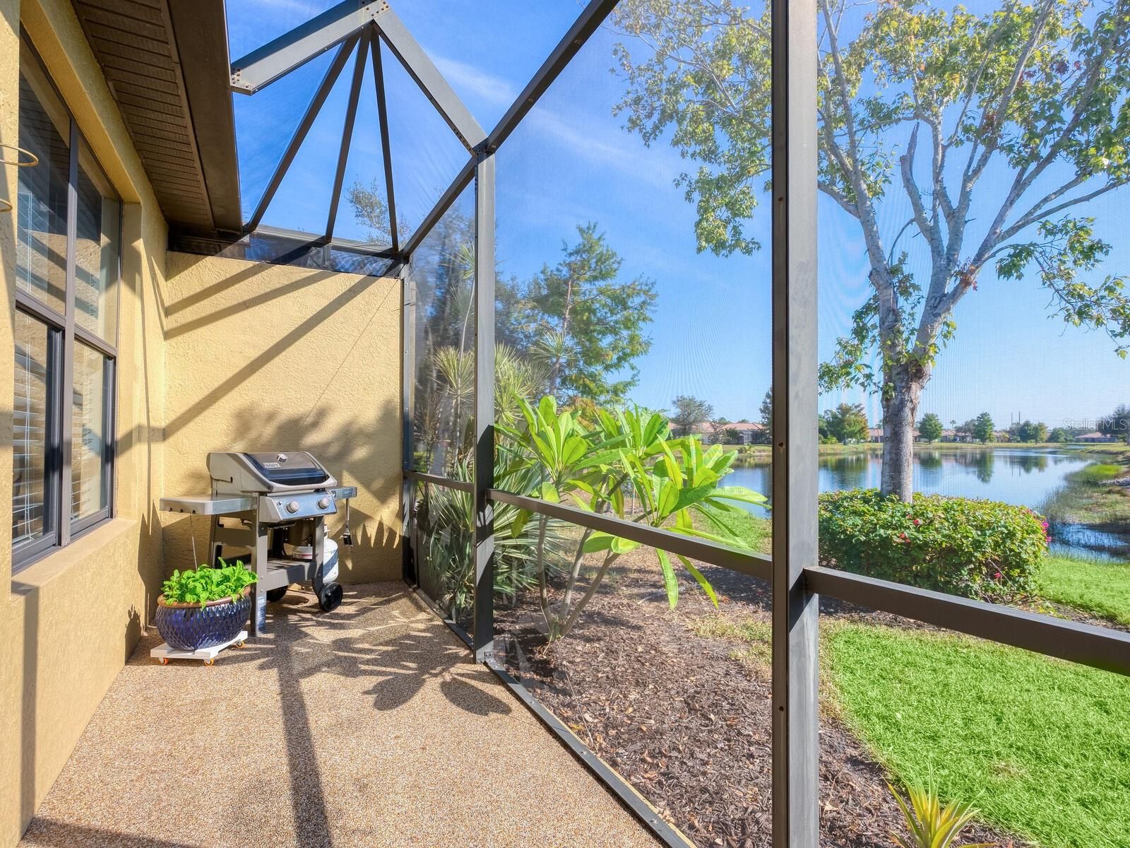 Experience scenic lake views and effortless living in this beautiful 3-bedroom Giovanni paired villa, located in the premier 55+ community of Venetian Falls. Just minutes from the sunny beaches, top-rated shopping and dining, and Venice’s charming historic district, this home offers an exceptional lifestyle. A screened front entry welcomes you into a wide, light-filled foyer accented by sidelights and an overhead transom window. The bright, open kitchen overlooks the main living area and features stainless steel appliances, a walk-in pantry with abundant storage, and a cozy dinette surrounded by windows that frame tranquil lake views. The primary suite is thoughtfully positioned at the rear of the home for privacy and includes two customized closets, one a walk-in, along with a spacious bathroom offering dual vanities, a private water closet, linen closet, and walk-in shower. At the front of the home, two guest bedrooms and a full bathroom create a comfortable retreat for visitors, while the den provides flexible space for work, hobbies, or relaxation. Enjoy the outdoors on the screened lanai, perfect for grilling, dining, or simply lounging as you take in peaceful lake views and local birdlife. Durable PebbleTec flooring and an accordion storm shutter enhance both comfort and protection. Additional highlights include a Hunter Douglas gliding shade on the living room sliders, a laundry room with storage cabinets and utility sink, and a 2-car garage with built-in storage cabinets. Venetian Falls offers resort-style amenities, including a spectacular clubhouse with a heated lap pool and spa, resistance-walking pool, state-of-the-art fitness center, billiards room, bocce courts, full-time activity director, and on-site management. The reasonable HOA fee covers lawn maintenance, irrigation, roof pressure washing, exterior paint, basic cable, and internet—with no CDD fee. Don’t miss your chance to own this remarkable home in one of Venice’s most sought-after communities!